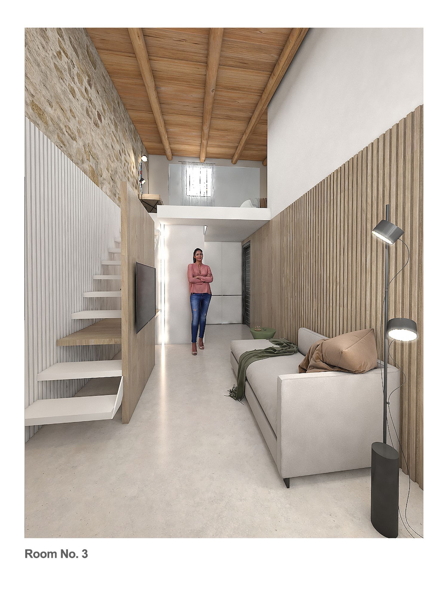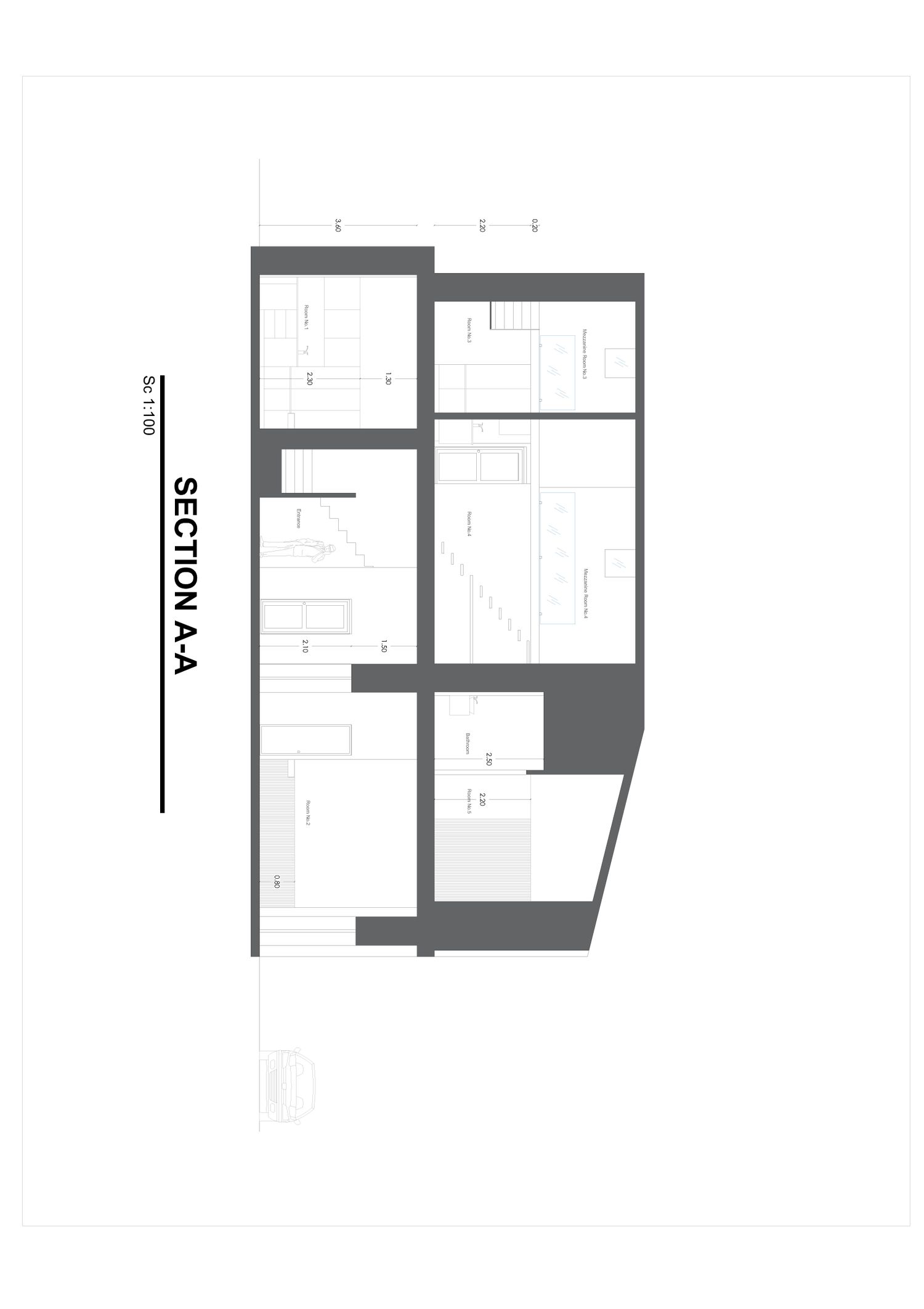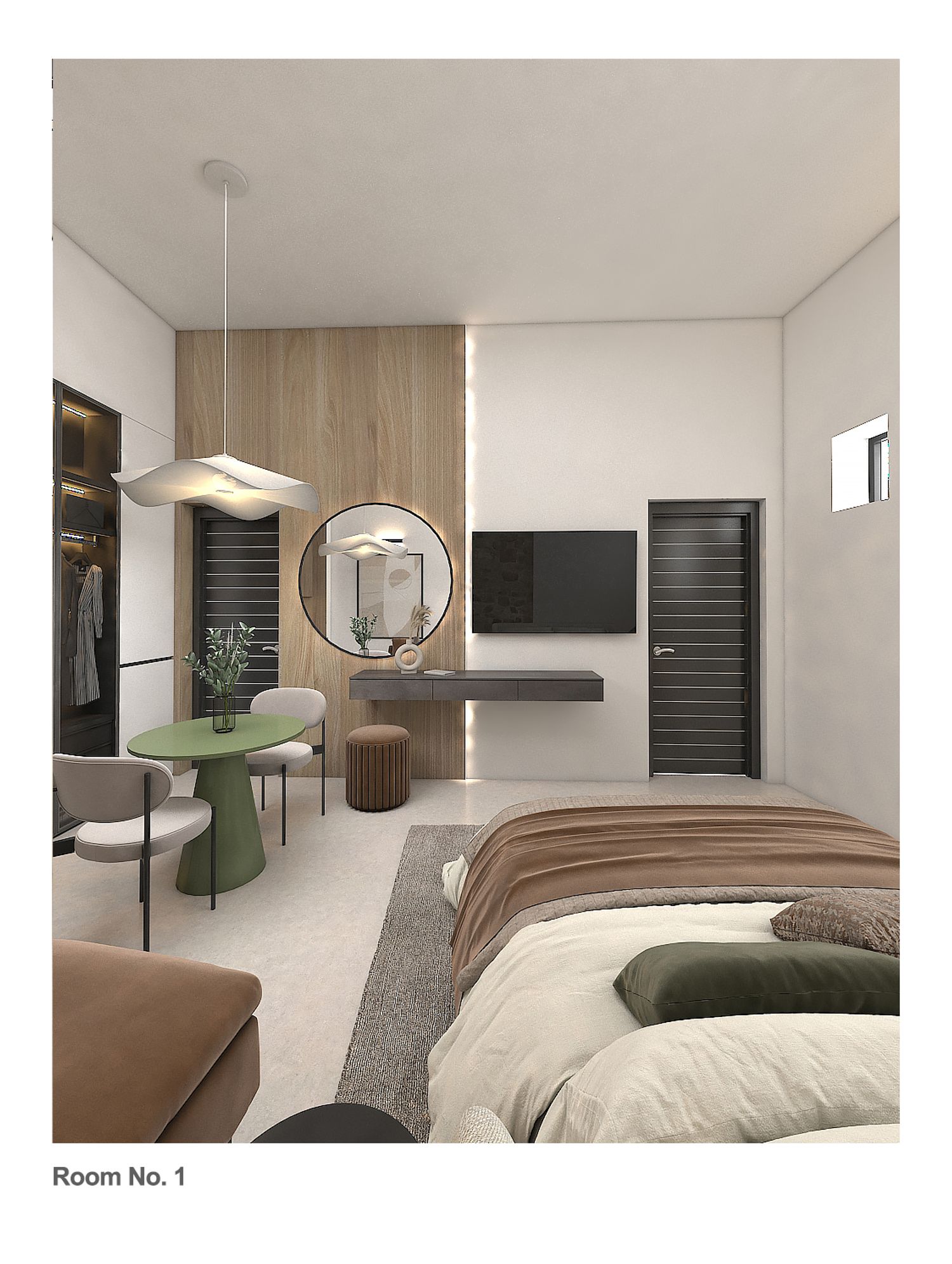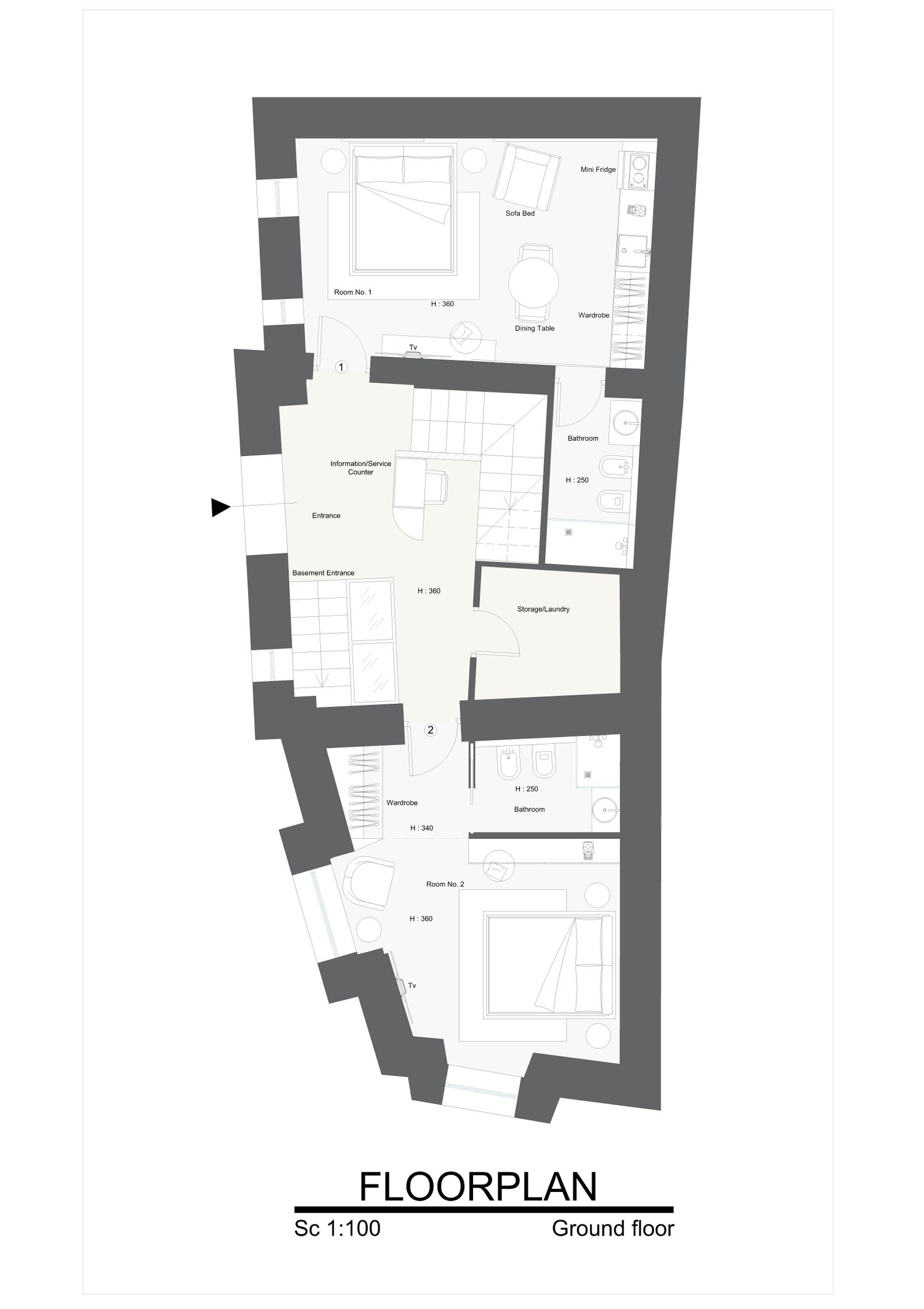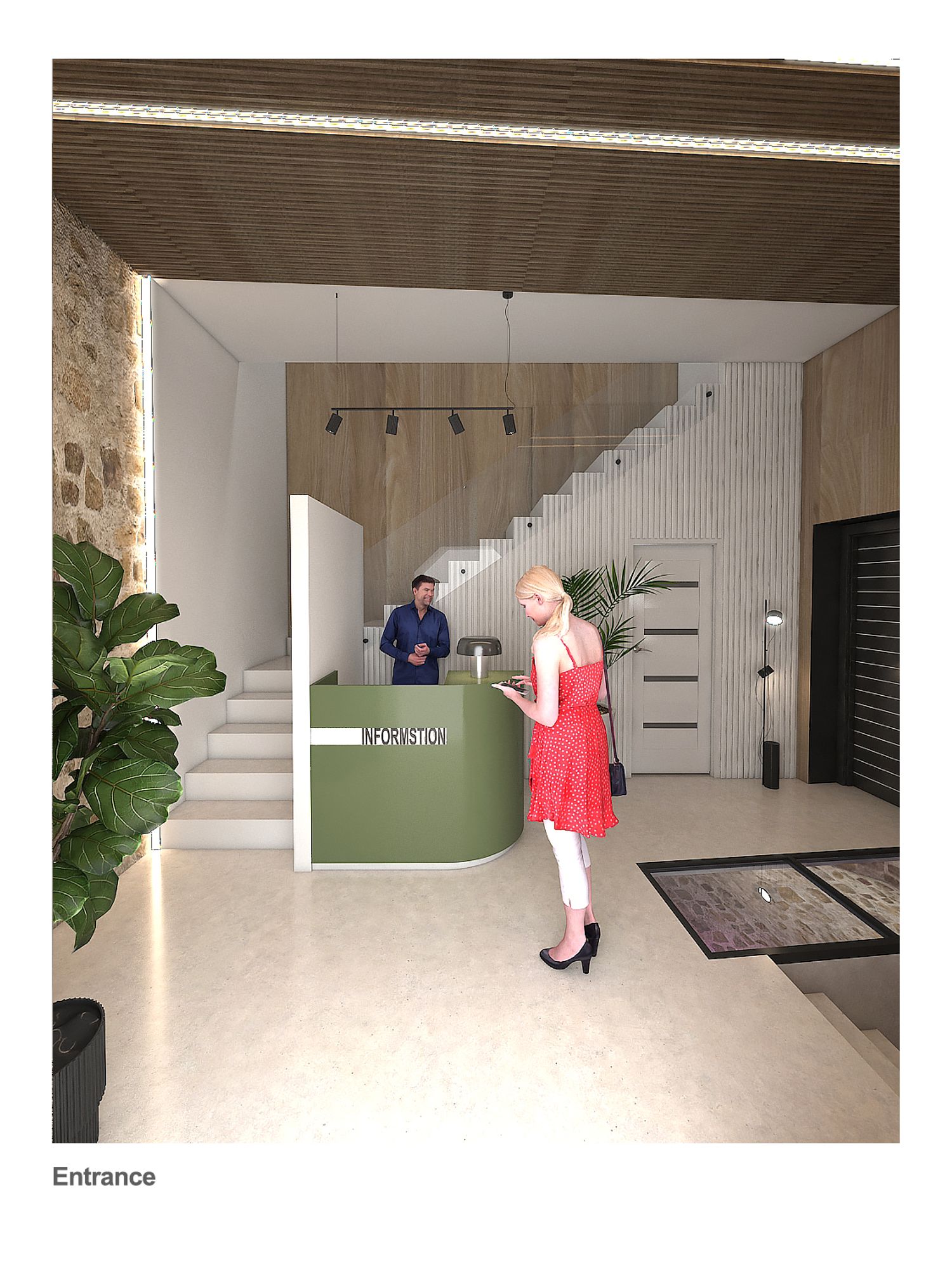 The building consists of an entrance area and five rooms, a counter at the entrance to guide guests and a storage/laundry area to store washing supplies and room supplies such as blankets, sheets, etc. are planned.