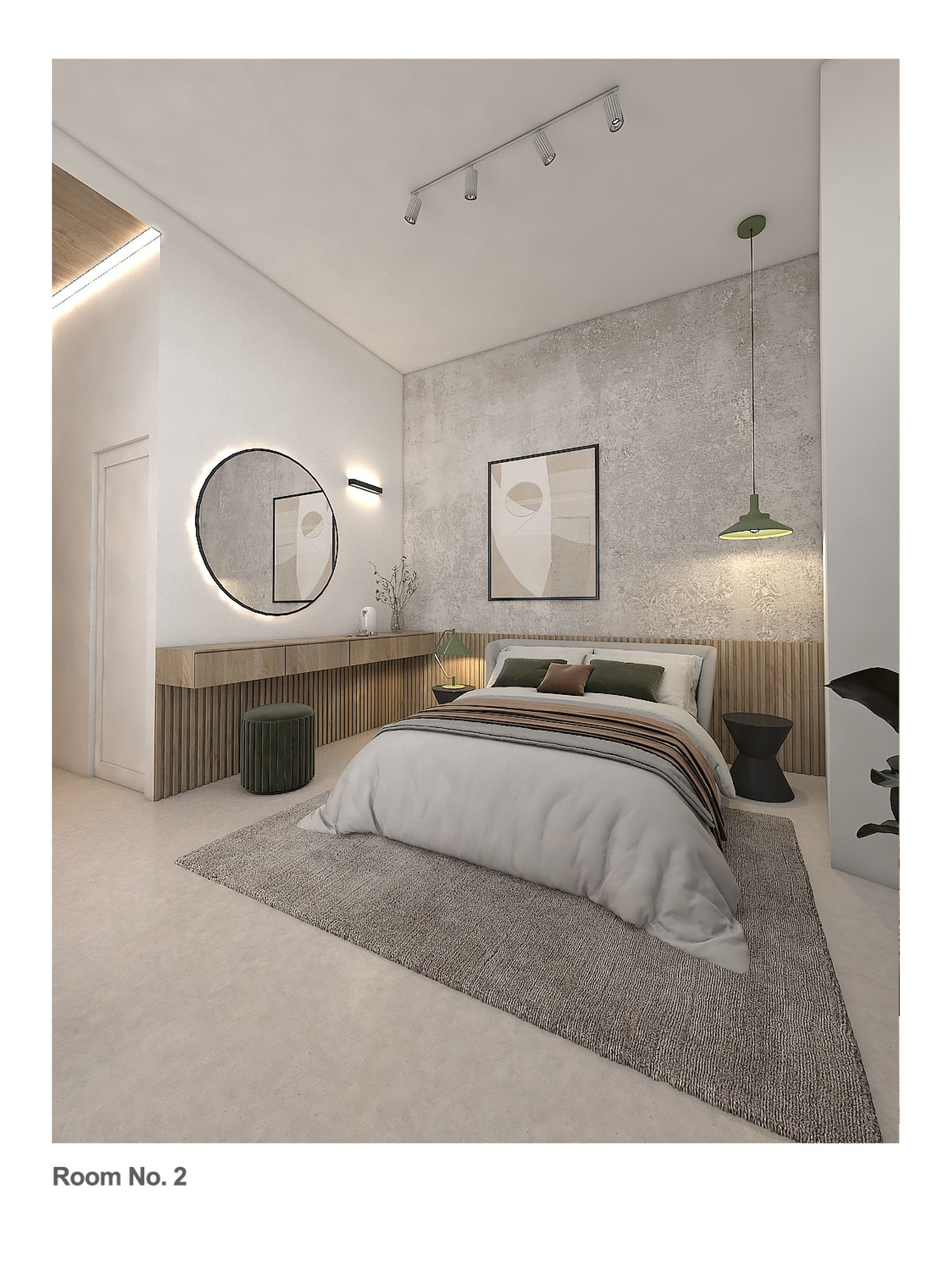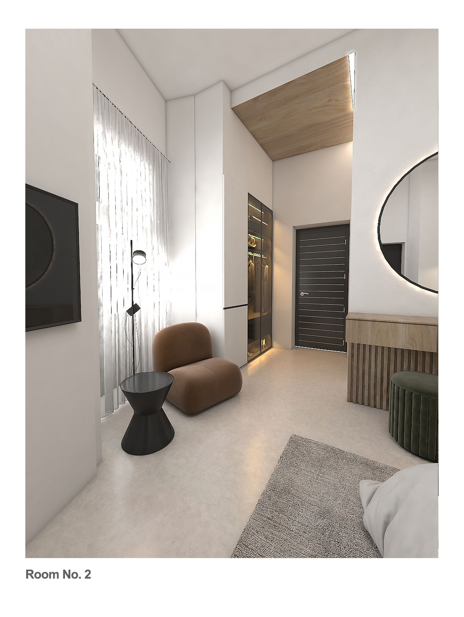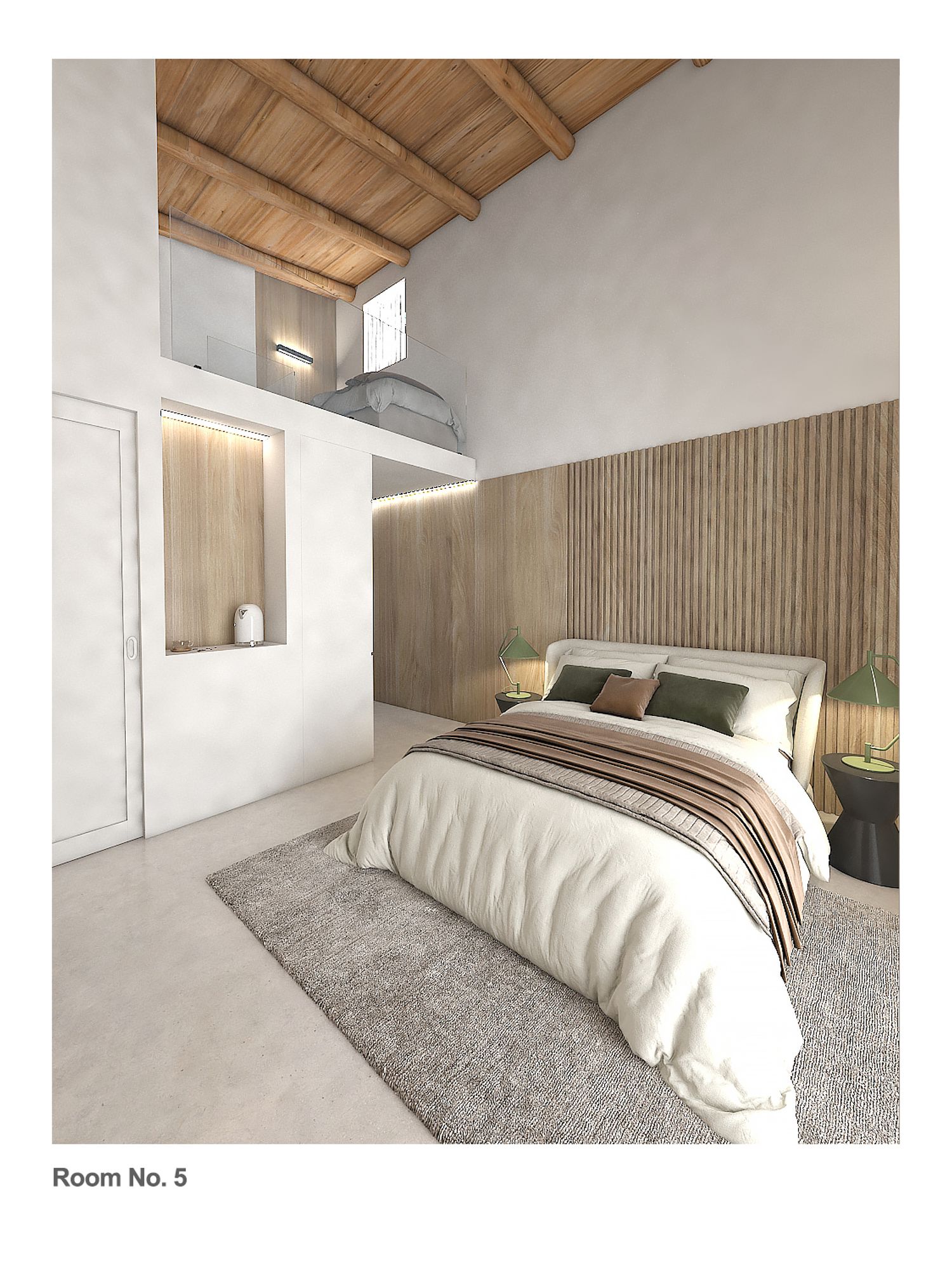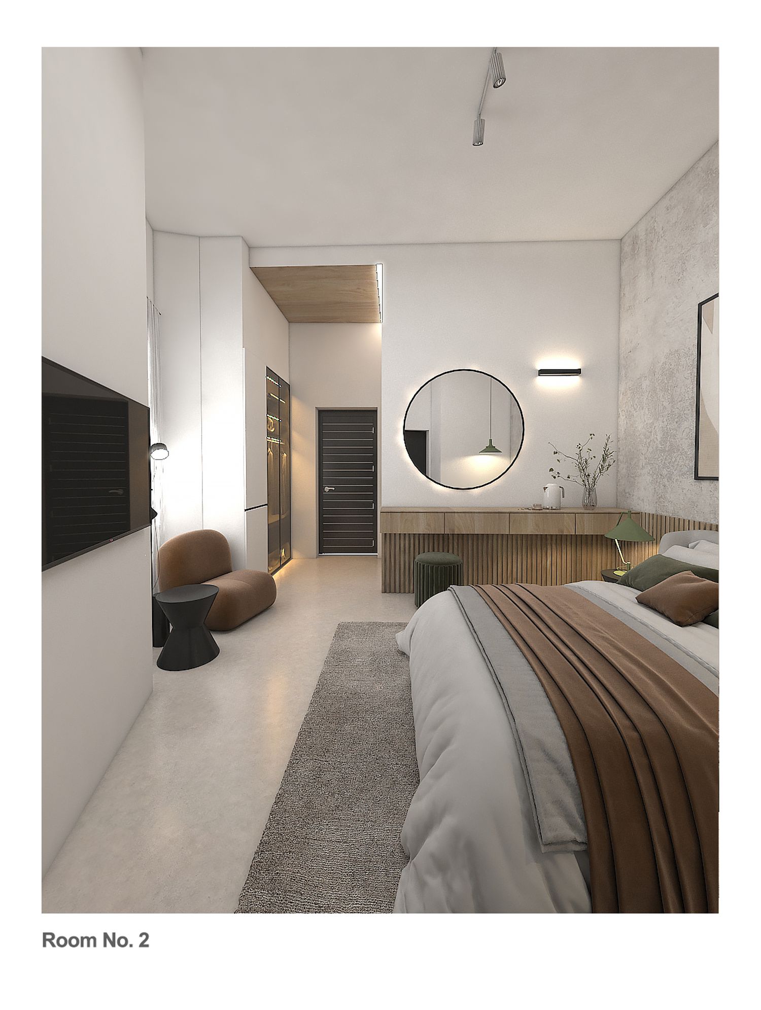 The building consists of an entrance area and five rooms, a counter at the entrance to guide guests and a storage/laundry area to store washing supplies and room supplies such as blankets, sheets, etc. are planned.