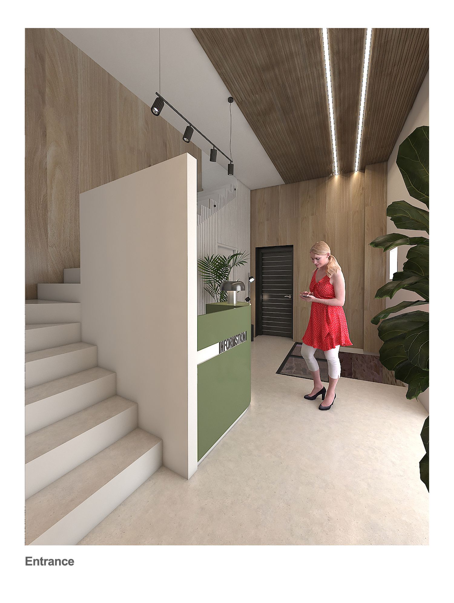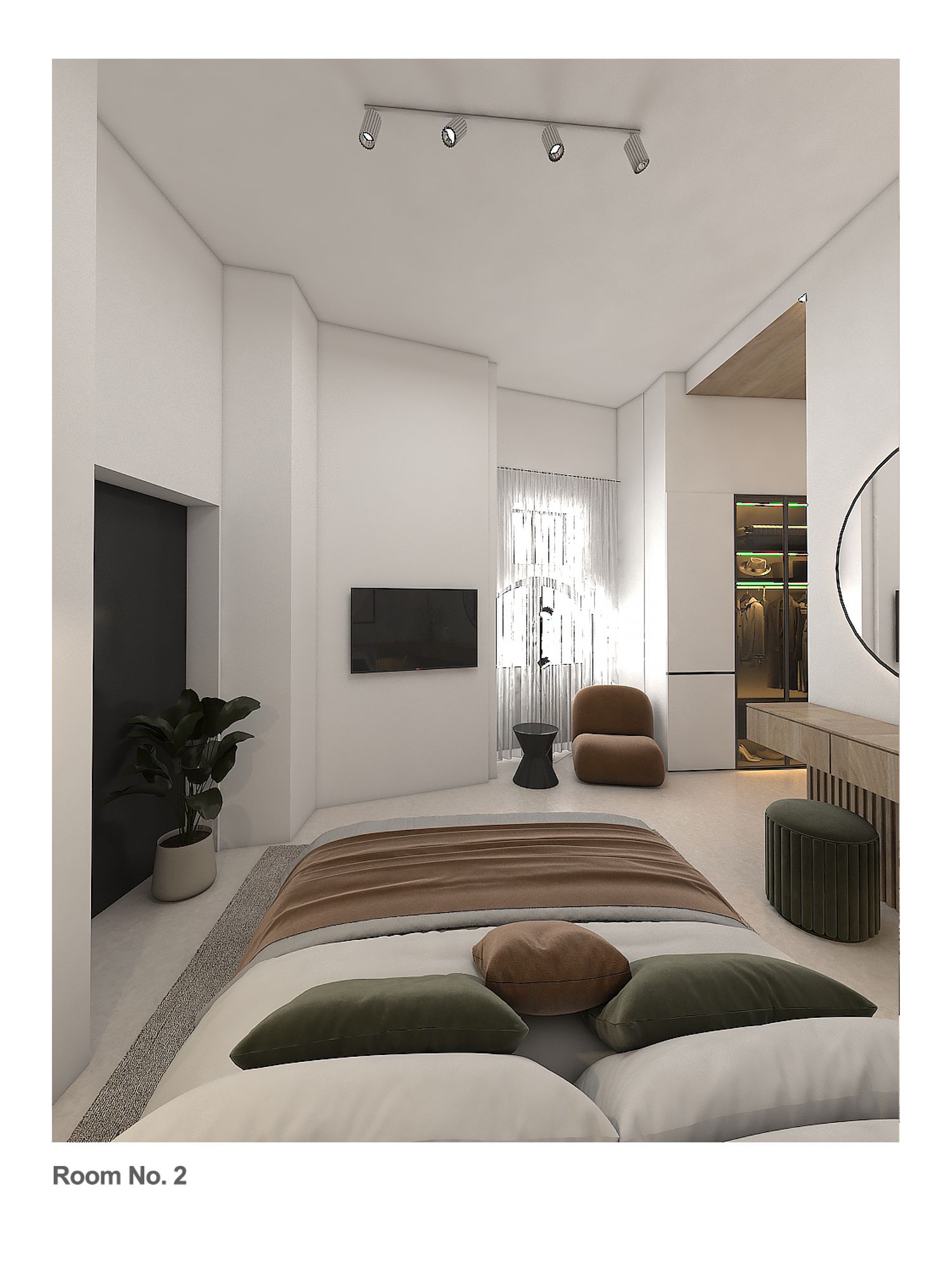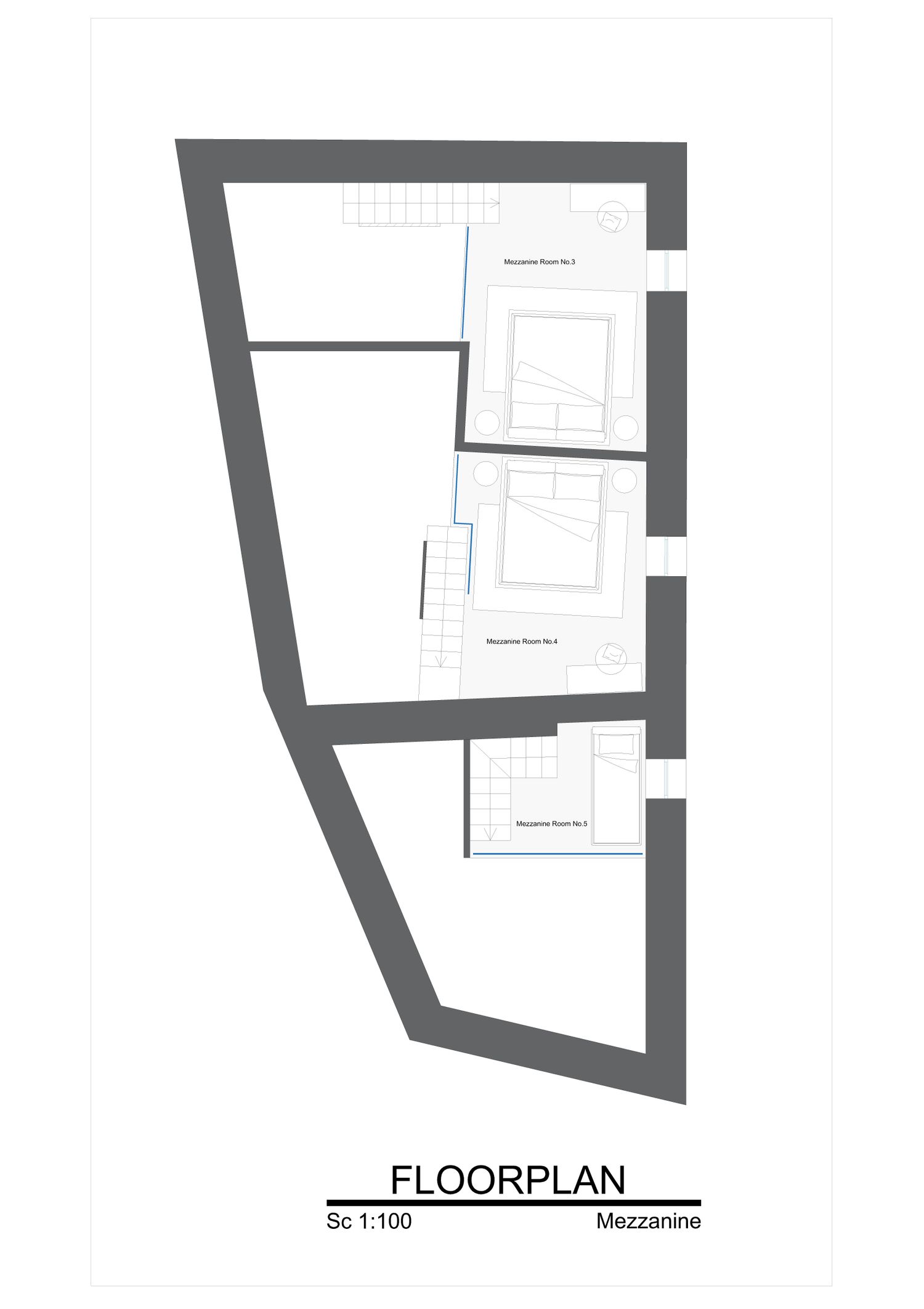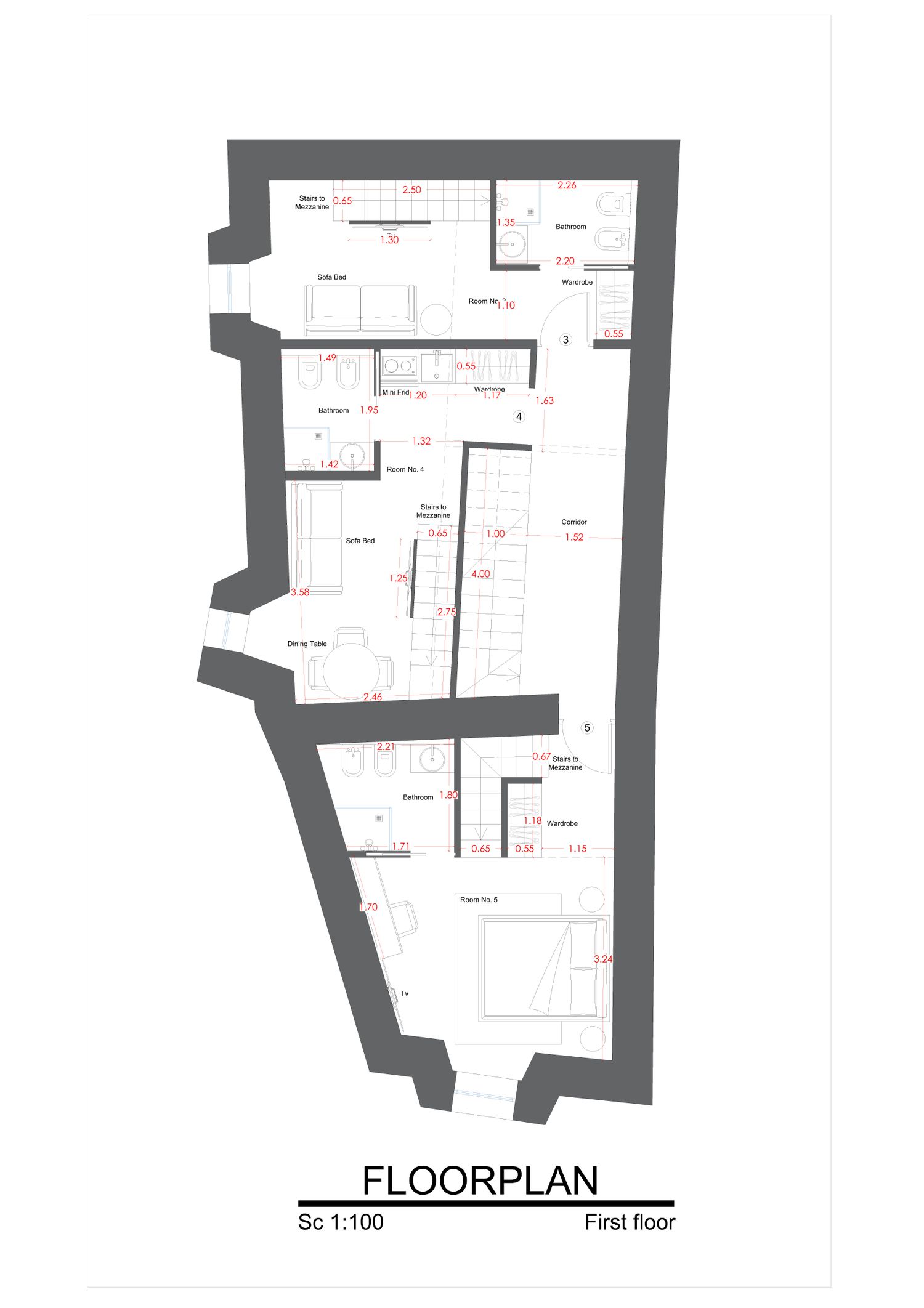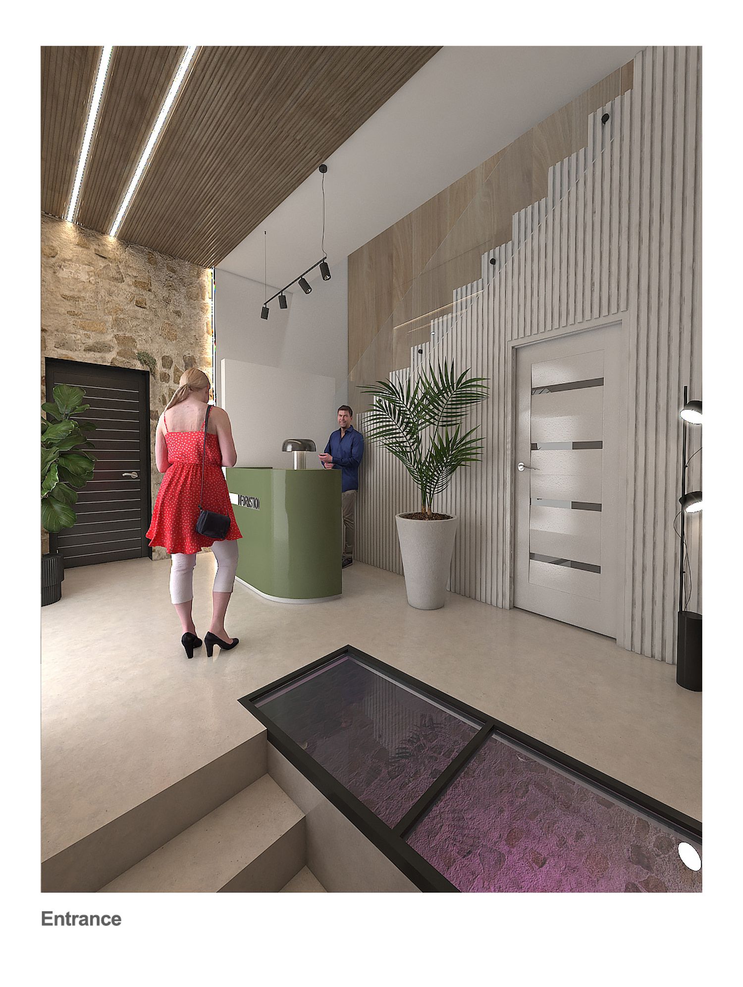 The building consists of an entrance area and five rooms, a counter at the entrance to guide guests and a storage/laundry area to store washing supplies and room supplies such as blankets, sheets, etc. are planned.