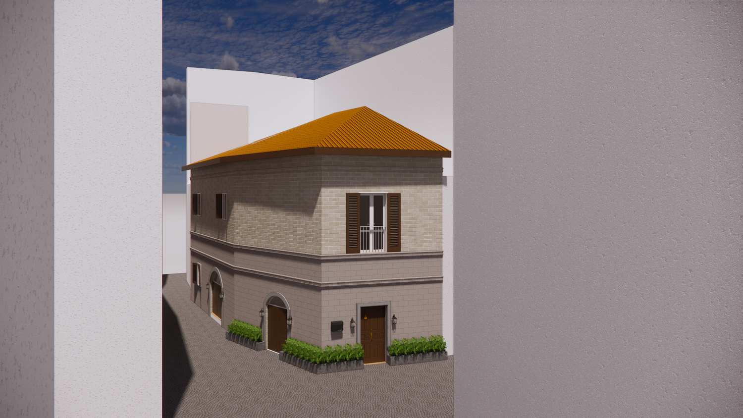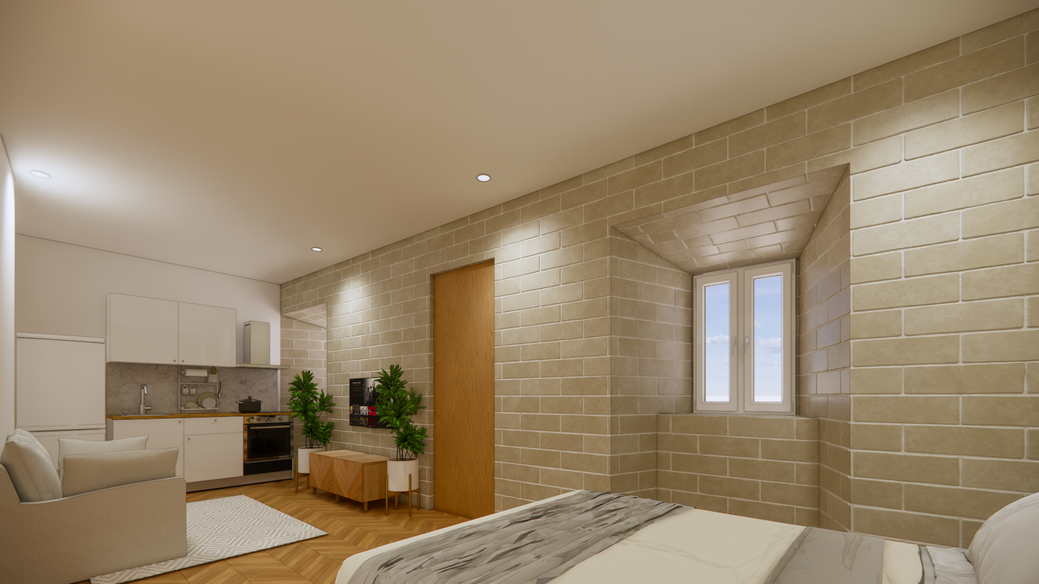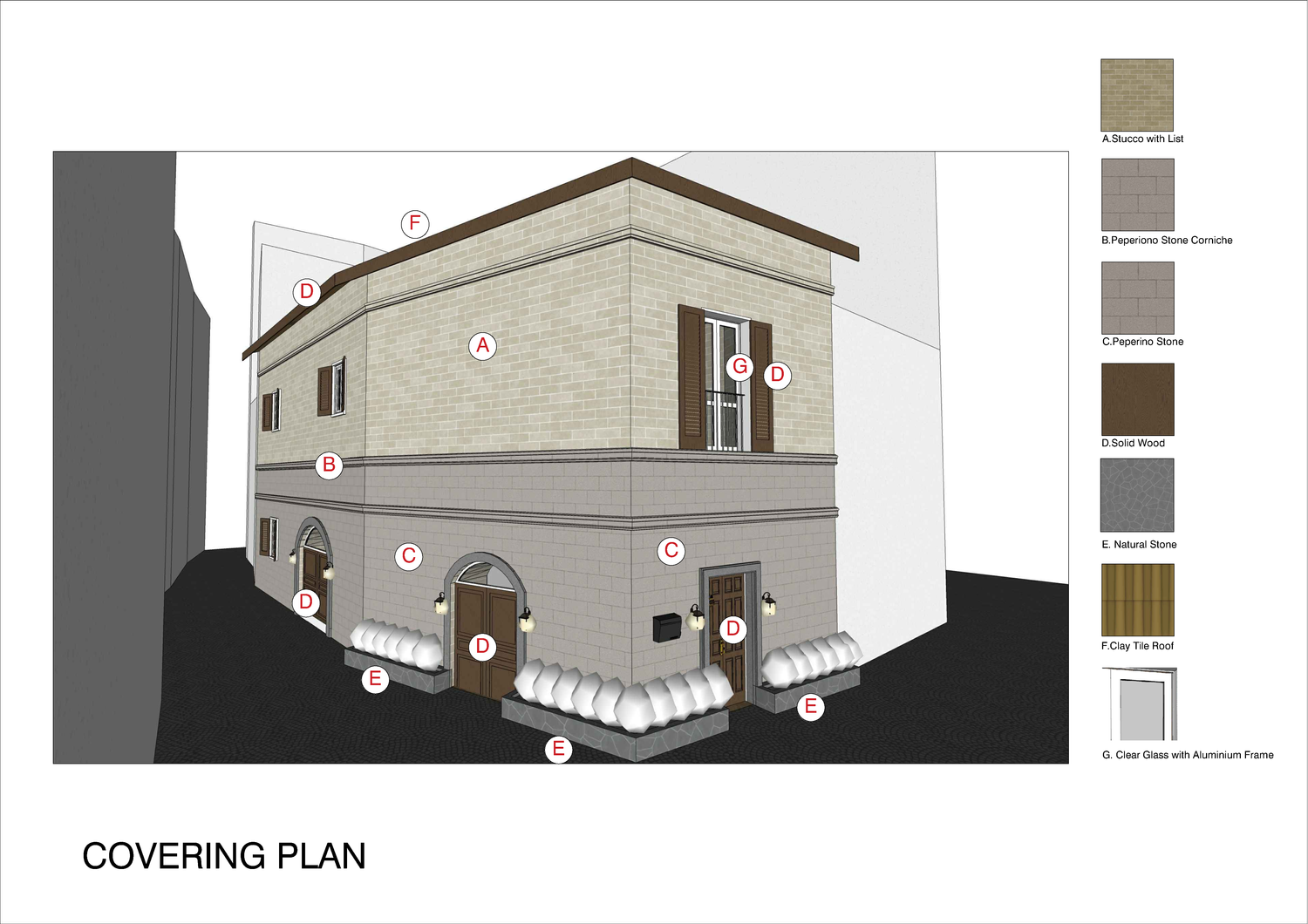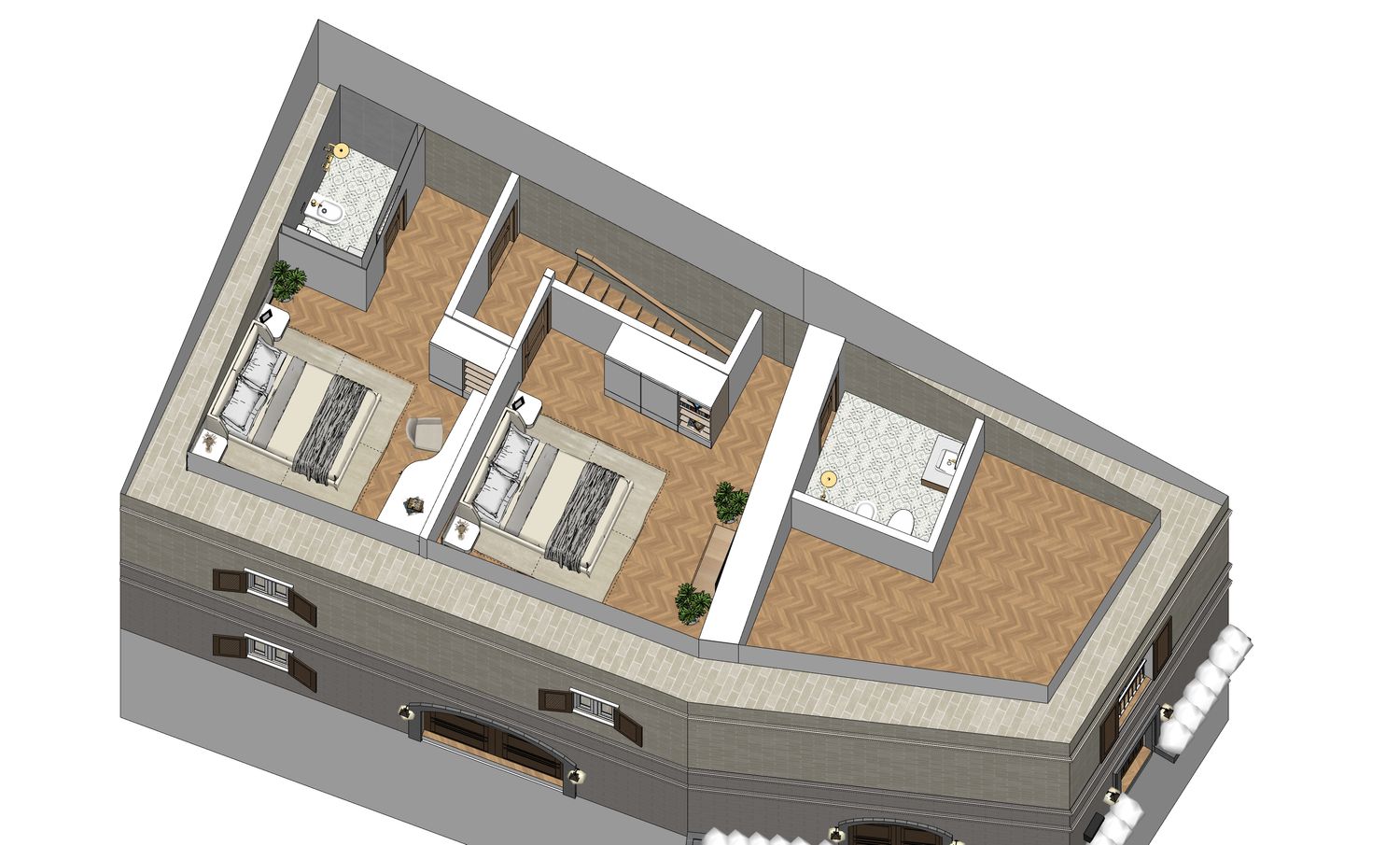 The renovation project for Palazzetto aims to create five premium bedrooms within the historic context of Viterbo, adopting a Historical Minimalist style and a modern Stone/Steel/Wood fusion, ensuring an intimate and non-anonymous environment. Structurally, the Attic floor (2F) will be structurally enhanced by lowering the floor by 60 cm and including skylights to produce two comfortable and highly usable rooms. The functional distribution includes 1 bedroom on the Ground Floor (GF) alongside a Lobby, a Locker Room, and a Common Room, 2 independent units bedroom with small kitchenettes on the First Floor (1F), and 2 functional bedrooms in the Attic (2F), while the underground Cave will be repurposed as a unique wellness and lounge facility in the future development