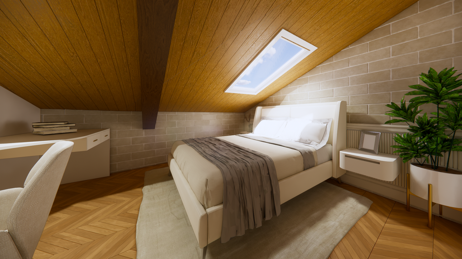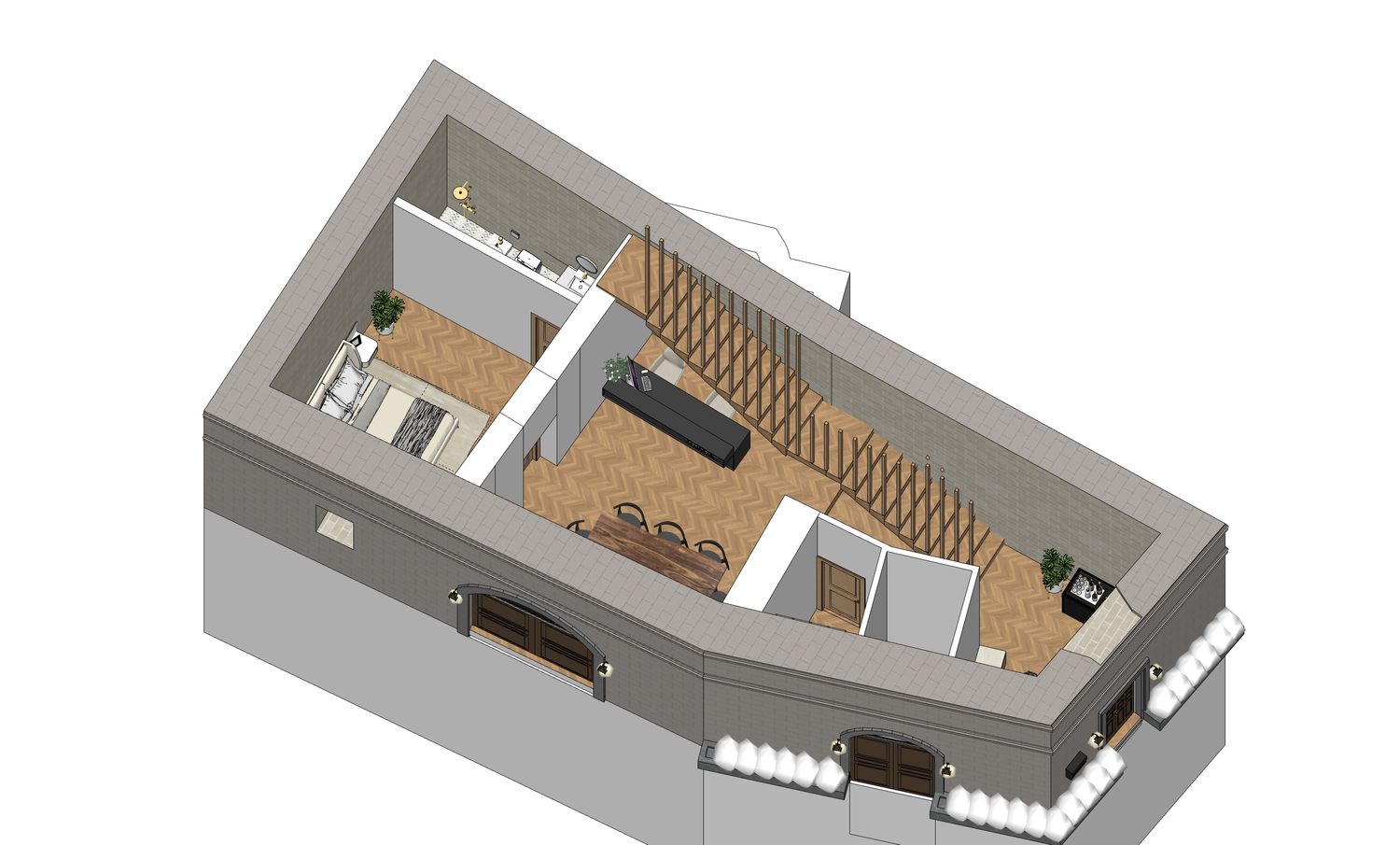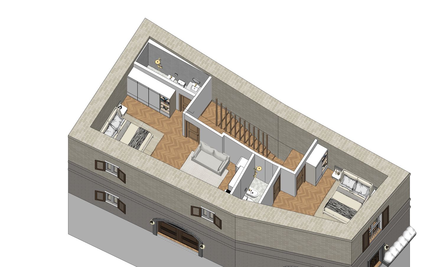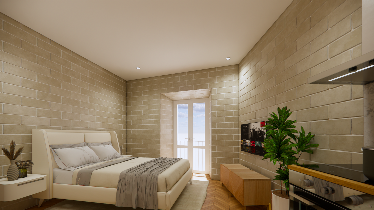 The renovation project for Palazzetto aims to create five premium bedrooms within the historic context of Viterbo, adopting a Historical Minimalist style and a modern Stone/Steel/Wood fusion, ensuring an intimate and non-anonymous environment. Structurally, the Attic floor (2F) will be structurally enhanced by lowering the floor by 60 cm and including skylights to produce two comfortable and highly usable rooms. The functional distribution includes 1 bedroom on the Ground Floor (GF) alongside a Lobby, a Locker Room, and a Common Room, 2 independent units bedroom with small kitchenettes on the First Floor (1F), and 2 functional bedrooms in the Attic (2F), while the underground Cave will be repurposed as a unique wellness and lounge facility in the future development