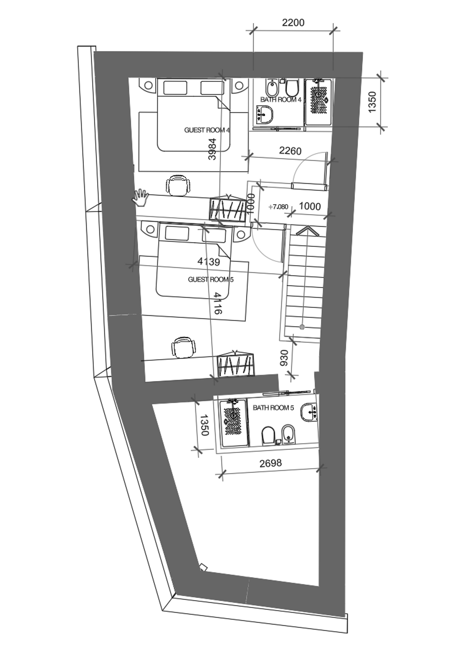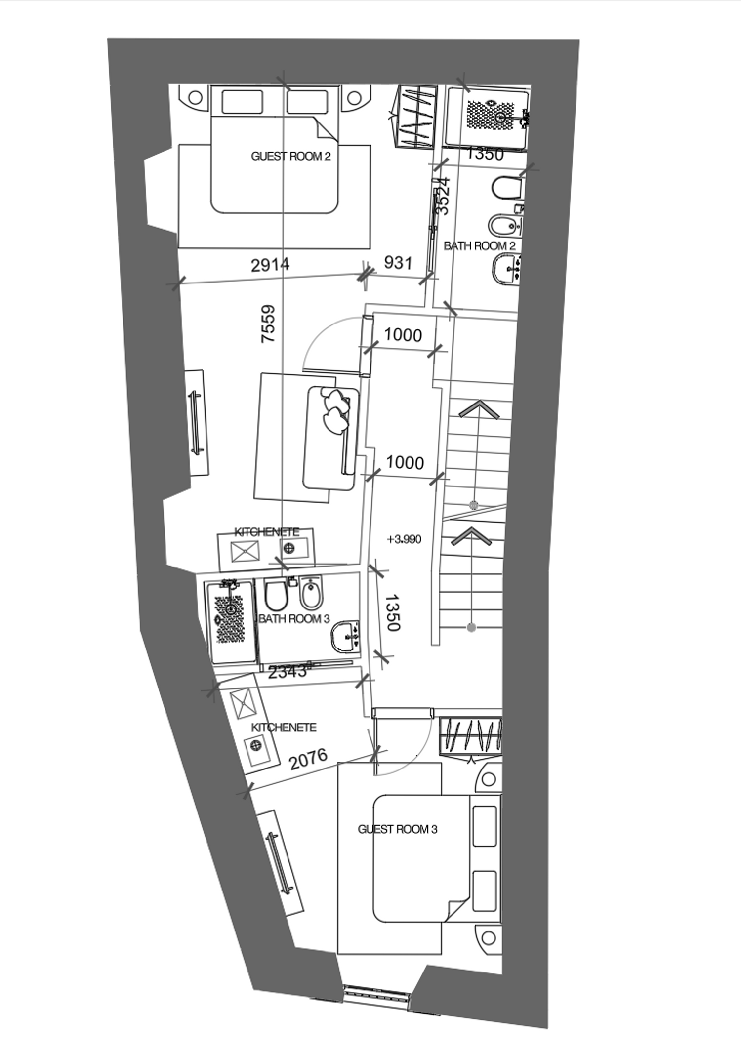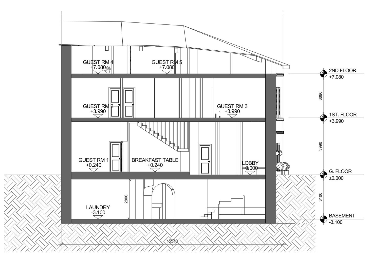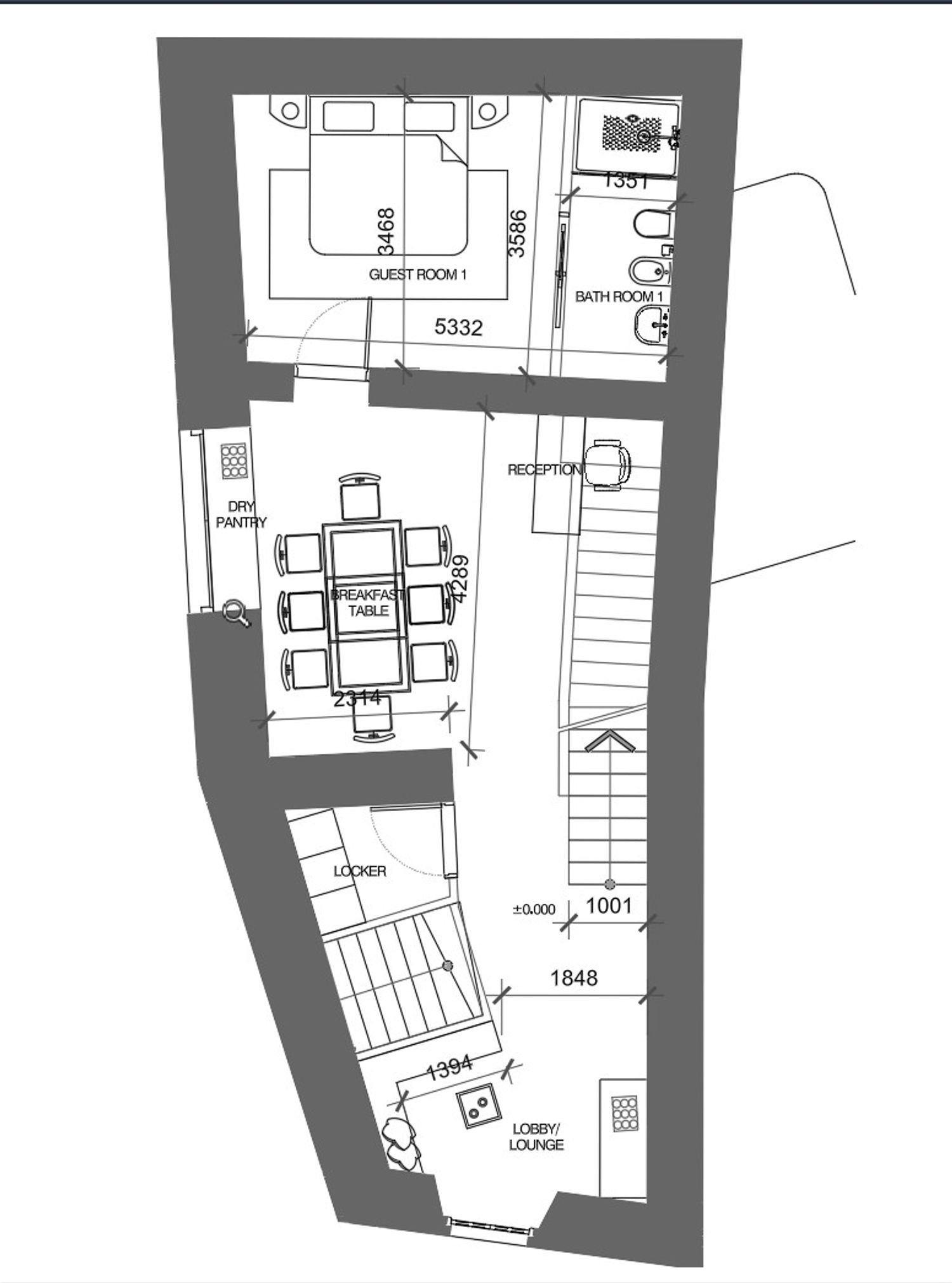 The renovation project for Palazzetto aims to create five premium bedrooms within the historic context of Viterbo, adopting a Historical Minimalist style and a modern Stone/Steel/Wood fusion, ensuring an intimate and non-anonymous environment. Structurally, the Attic floor (2F) will be structurally enhanced by lowering the floor by 60 cm and including skylights to produce two comfortable and highly usable rooms. The functional distribution includes 1 bedroom on the Ground Floor (GF) alongside a Lobby, a Locker Room, and a Common Room, 2 independent units bedroom with small kitchenettes on the First Floor (1F), and 2 functional bedrooms in the Attic (2F), while the underground Cave will be repurposed as a unique wellness and lounge facility in the future development
