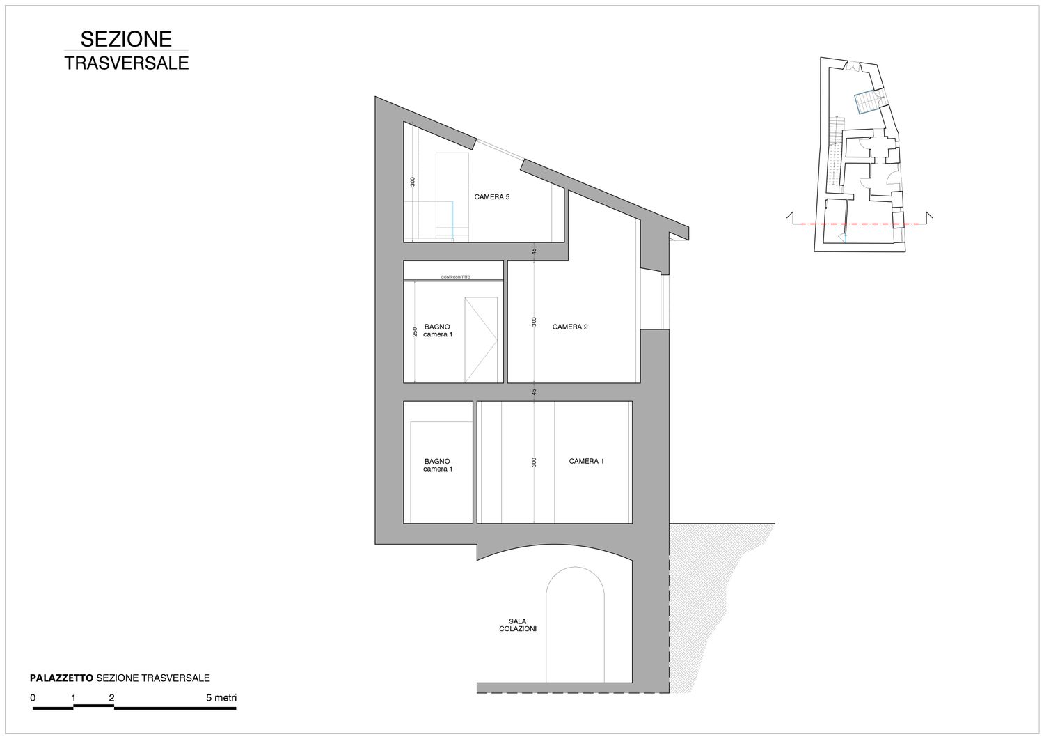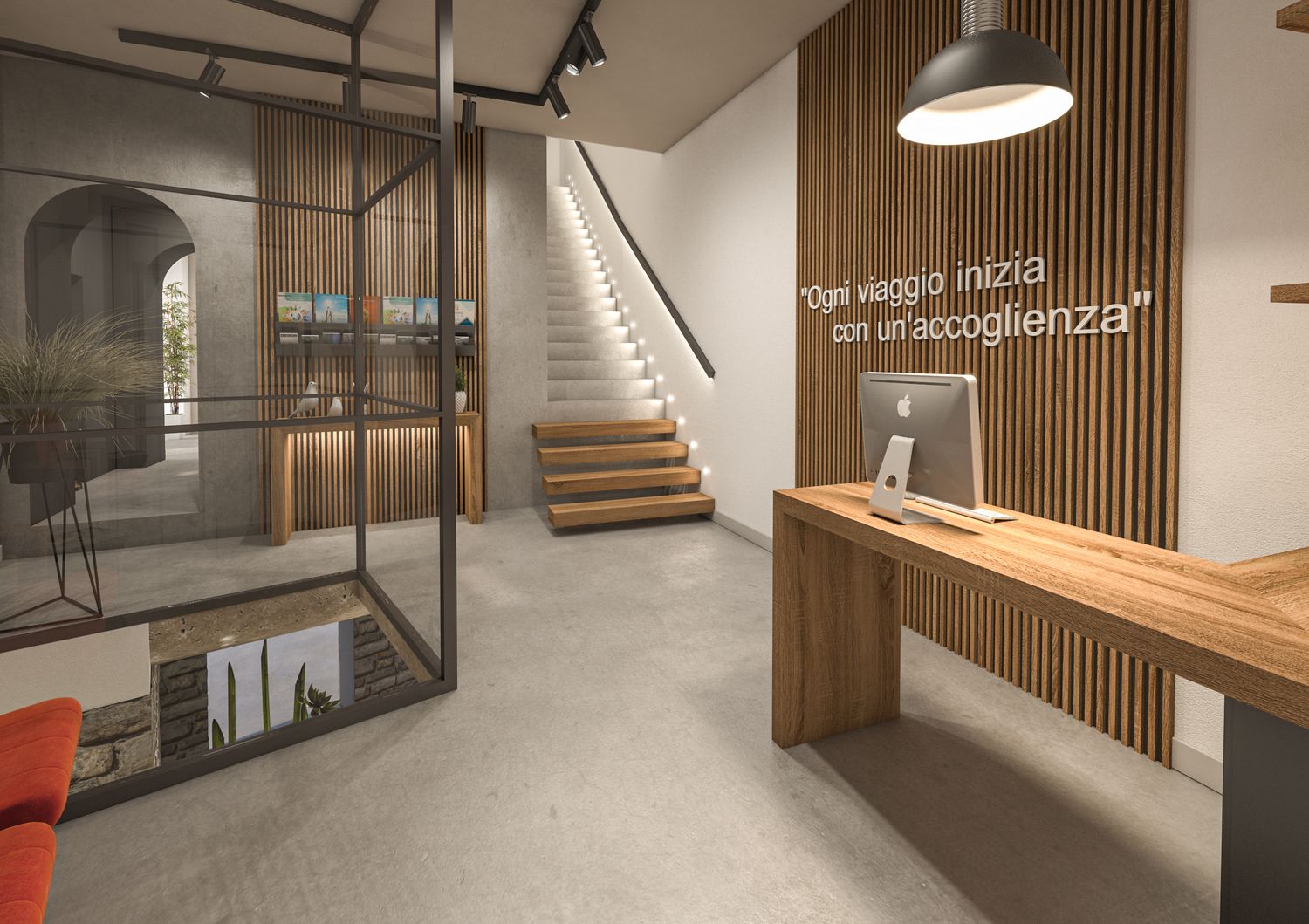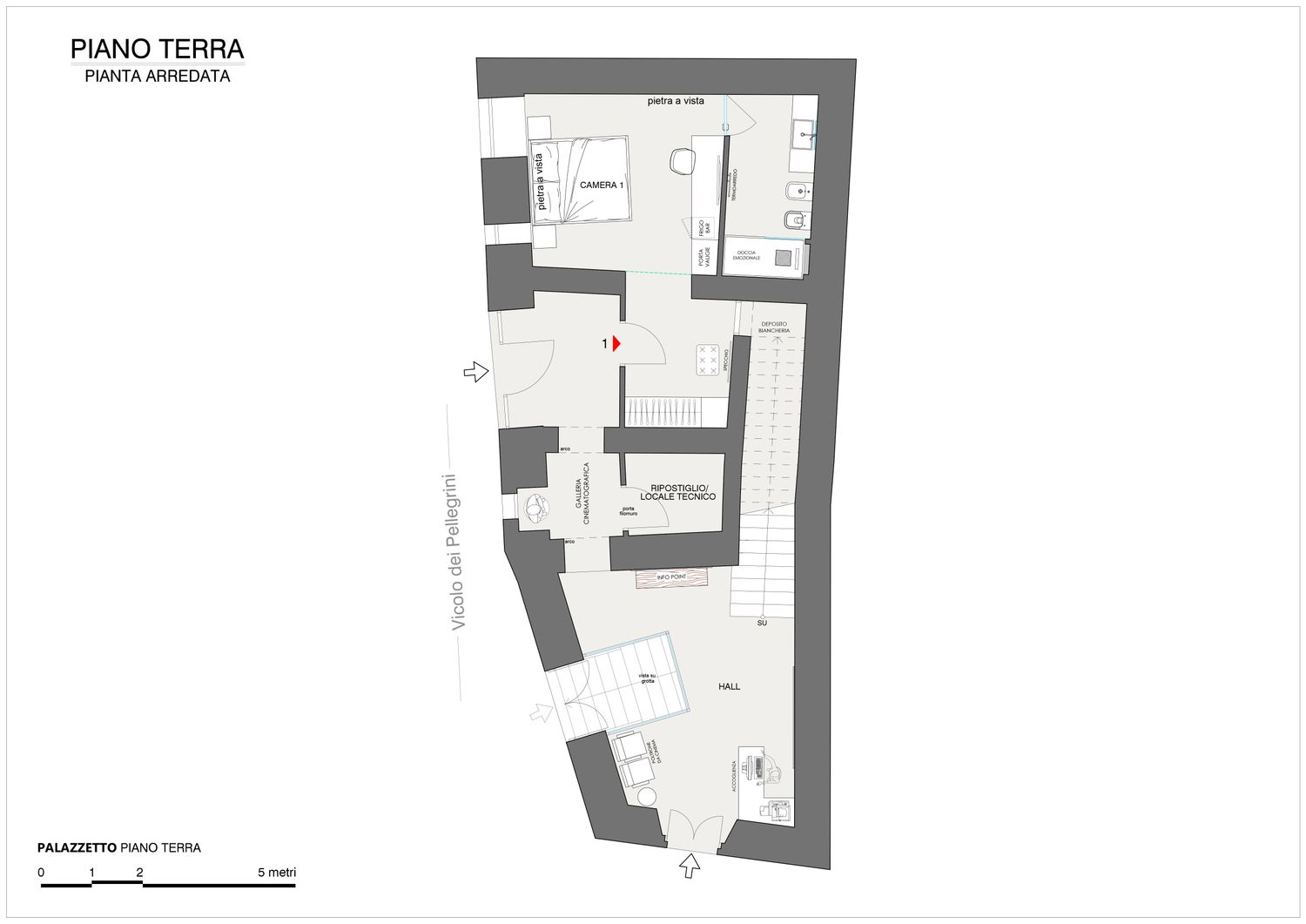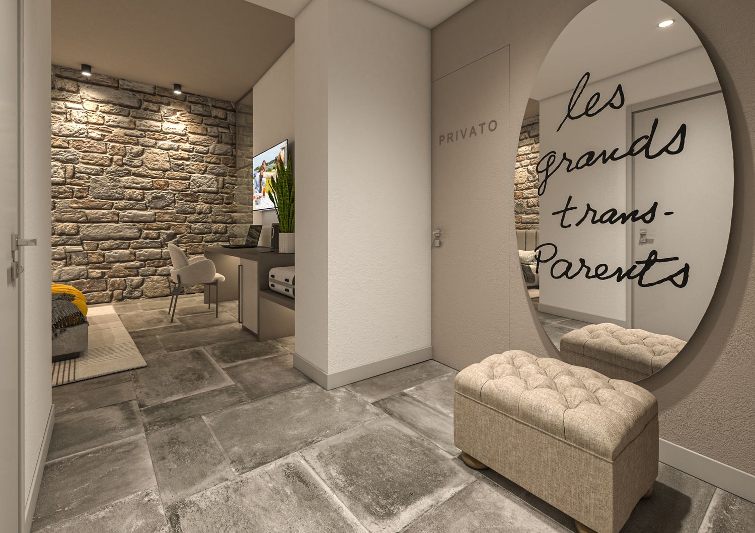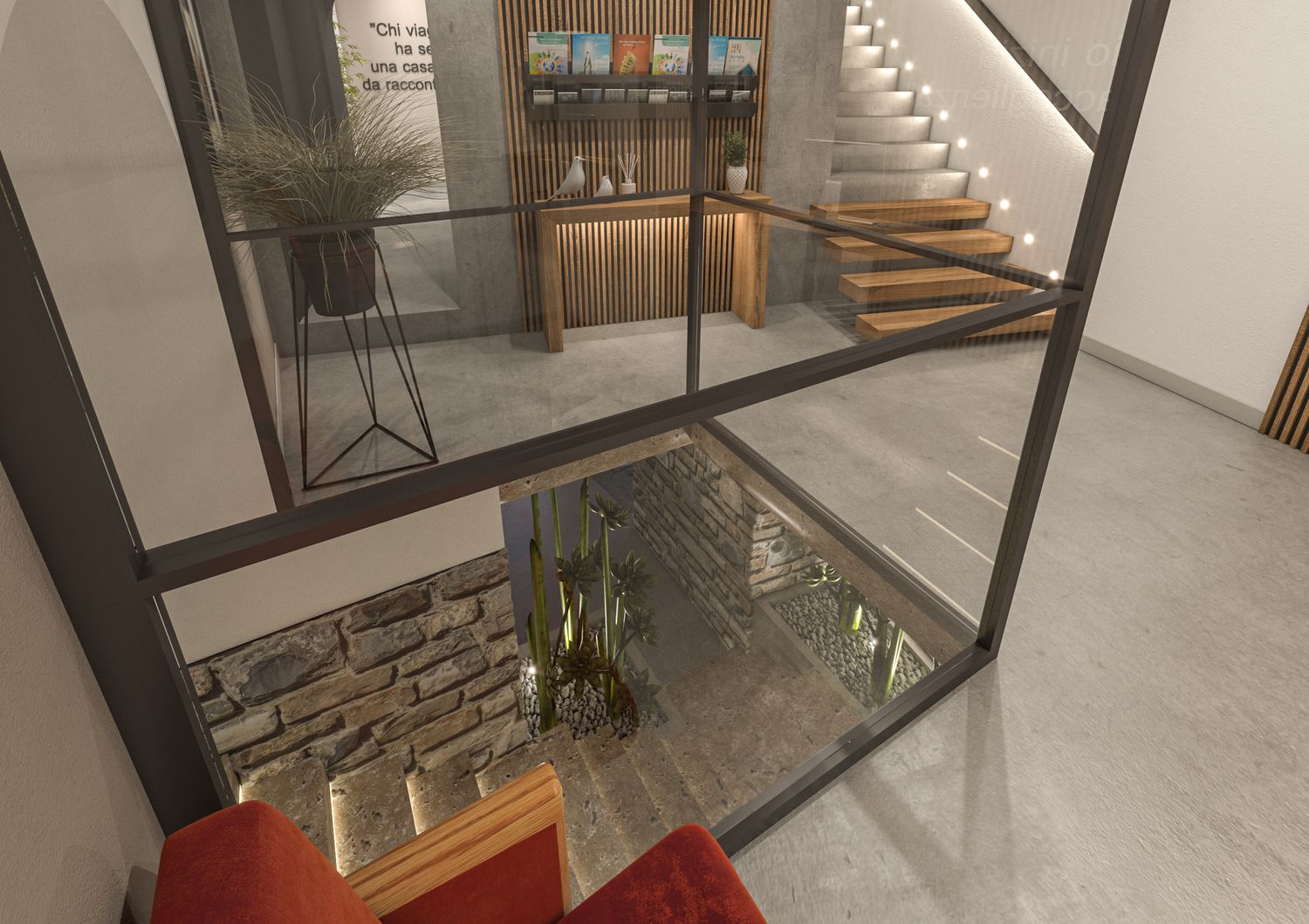 Il progetto propone il recupero e la valorizzazione di un palazzetto storico nel cuore di Viterbo, attraverso un intervento che fonde rispetto per l’architettura originaria e atmosfere contemporanee. L’edificio, articolato su più livelli e arricchito dalla presenza della grotta al piano interrato, viene trasformato in un B&B di charme con cinque camere, ciascuna caratterizzata da dettagli unici e da un linguaggio architettonico coerente.