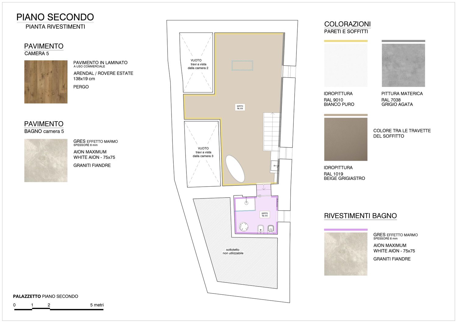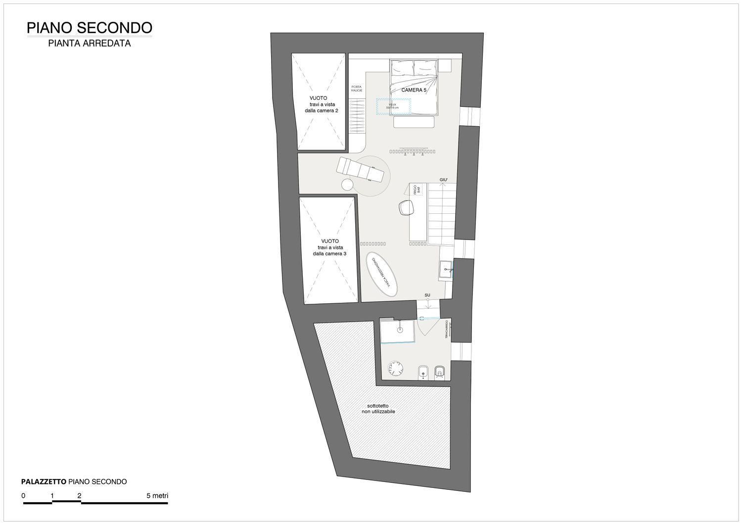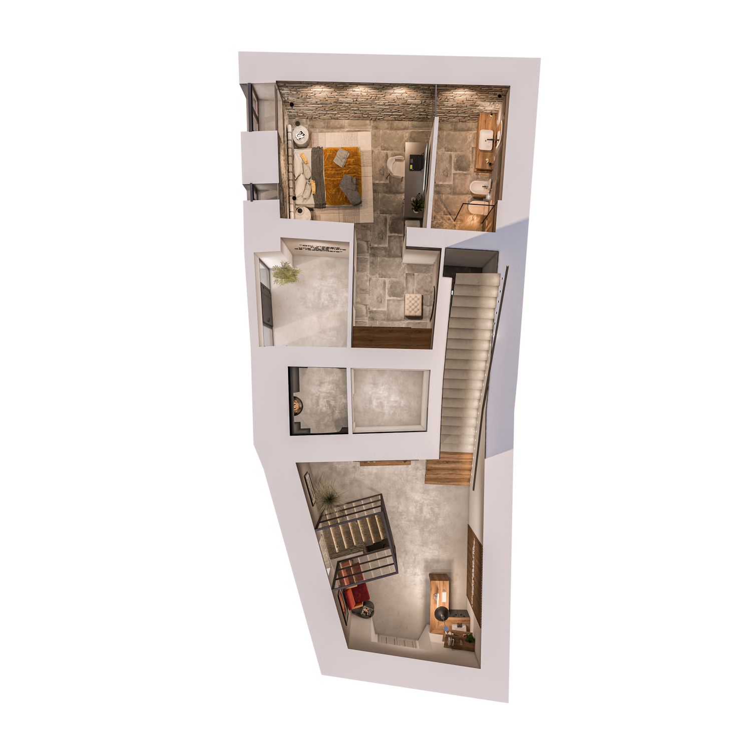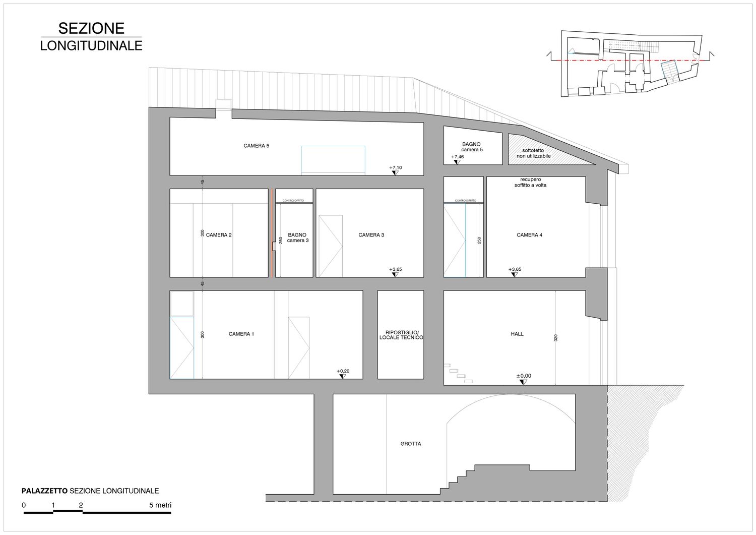 Il progetto propone il recupero e la valorizzazione di un palazzetto storico nel cuore di Viterbo, attraverso un intervento che fonde rispetto per l’architettura originaria e atmosfere contemporanee. L’edificio, articolato su più livelli e arricchito dalla presenza della grotta al piano interrato, viene trasformato in un B&B di charme con cinque camere, ciascuna caratterizzata da dettagli unici e da un linguaggio architettonico coerente.