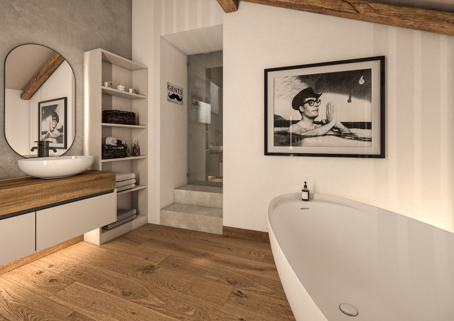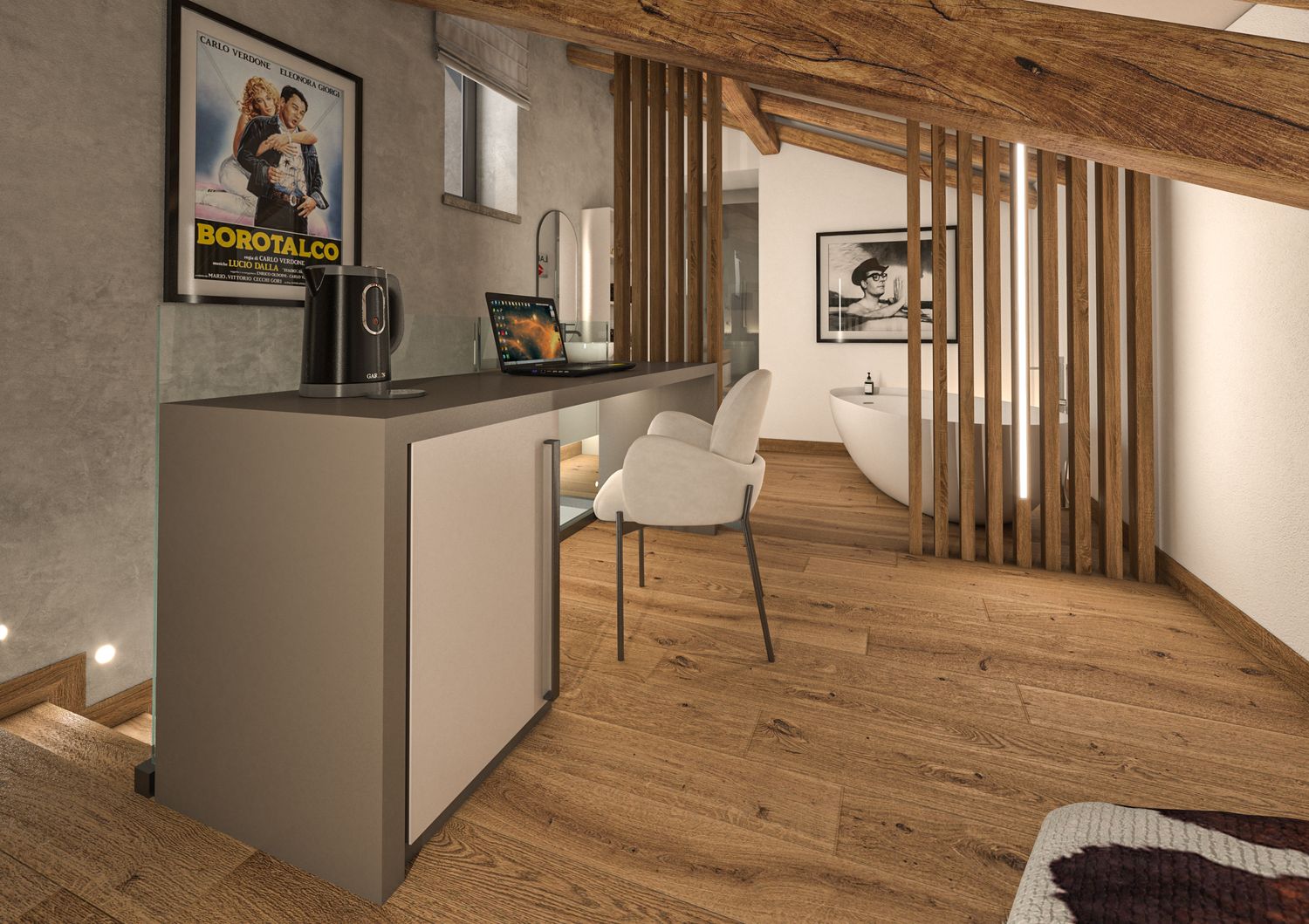 Gli interni si ispirano a uno stile tradizionale-contemporaneo: pareti in pietra e murature a vista dialogano con arredi dalle linee pulite e moderne, superfici calde in legno e tessuti morbidi e accoglienti. L’essenzialità degli spazi è bilanciata da elementi materici autentici che raccontano la storia del luogo, reinterpretati in chiave attuale.
