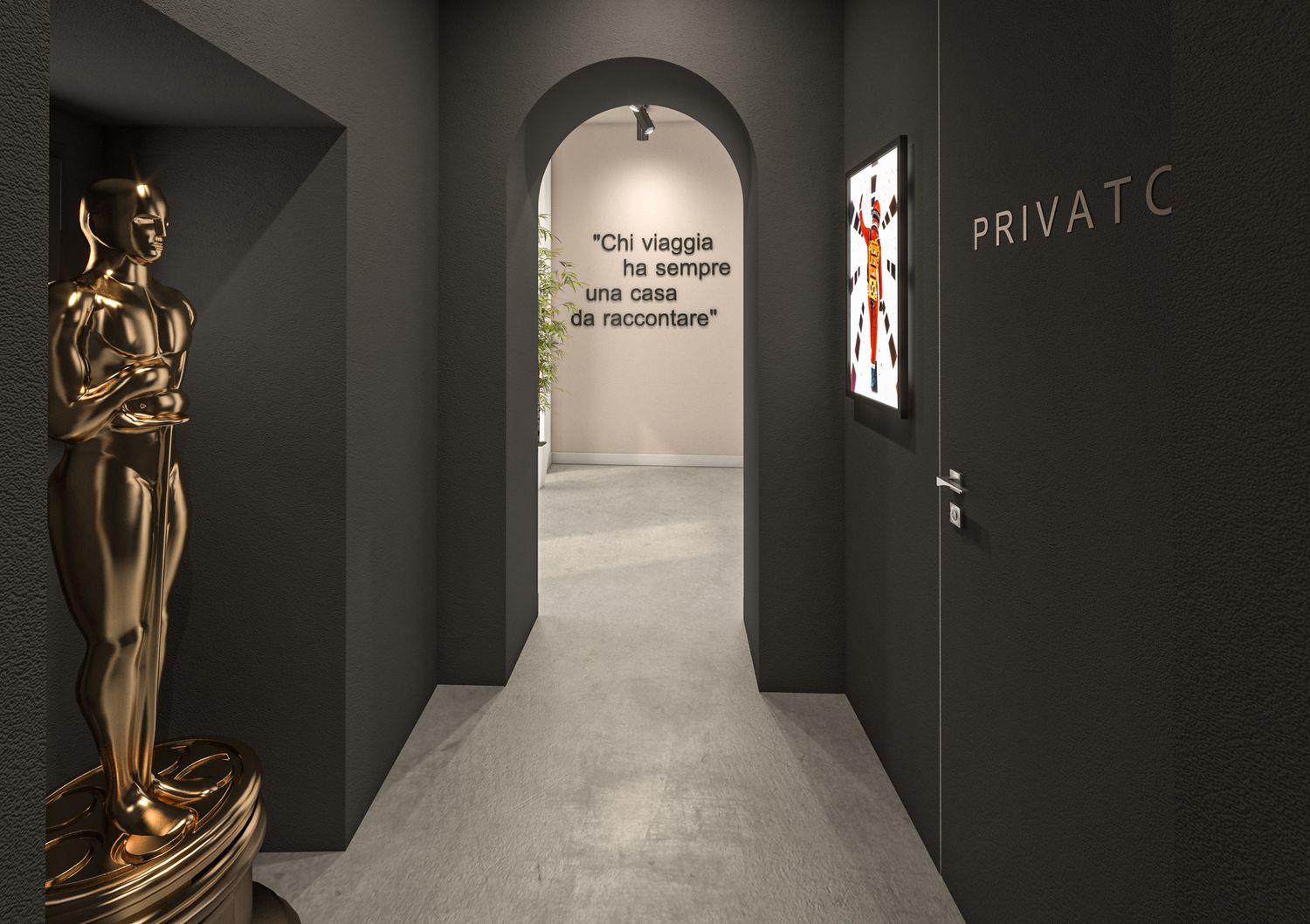 Il tema del cinema è richiamato con discrezione ed eleganza: poster d’autore, citazioni, oggetti iconici valorizzano corridoi e spazi comuni, trasformando il percorso degli ospiti in una piccola “galleria cinematografica” che lega la storia della città alla magia della settima arte.