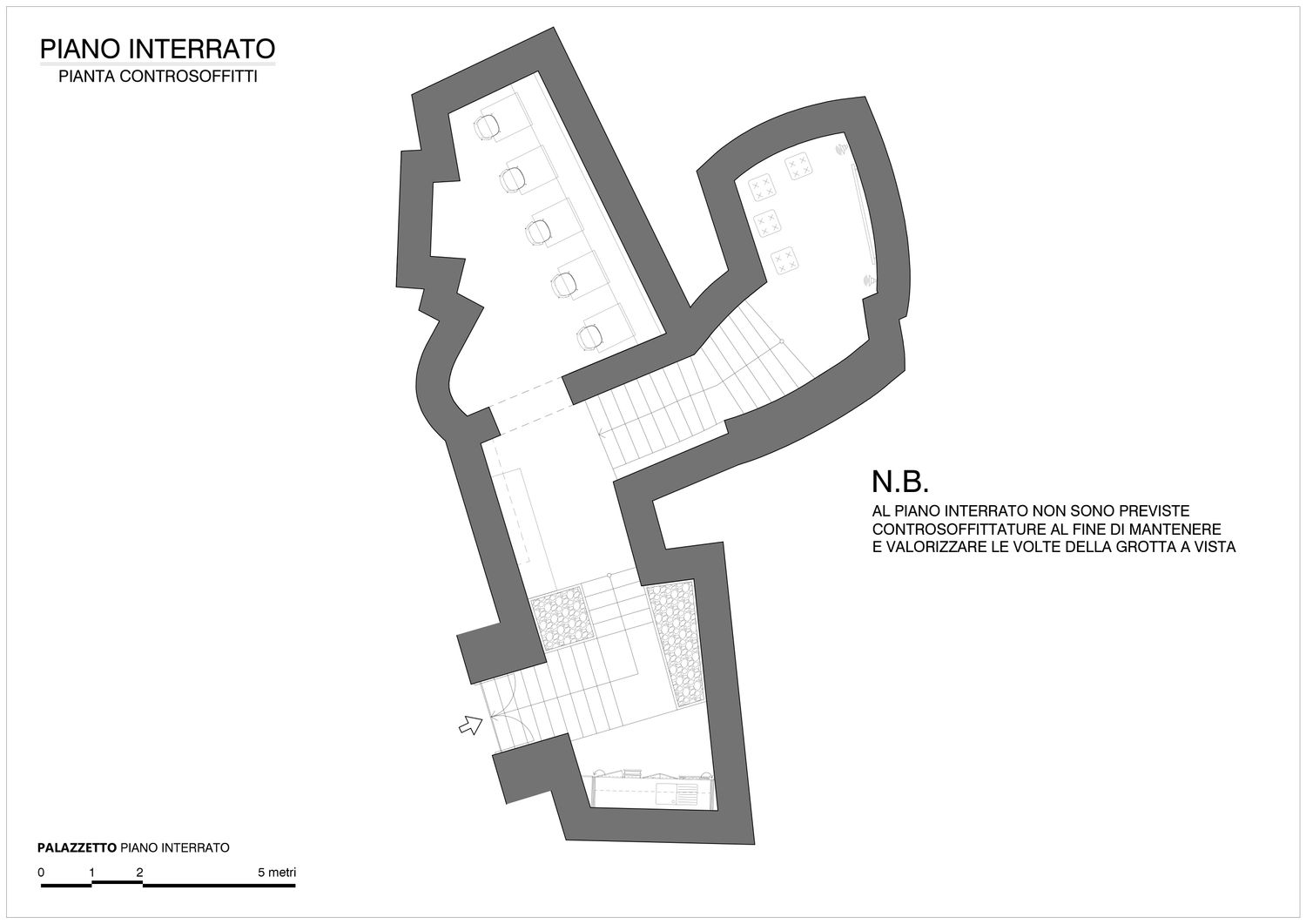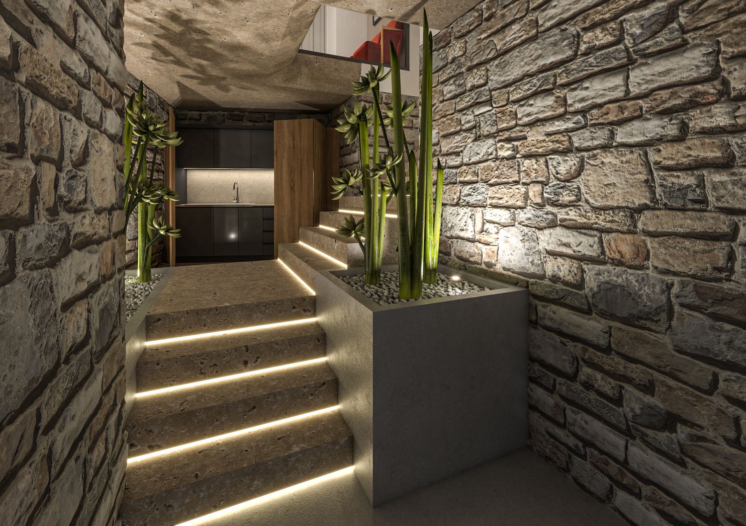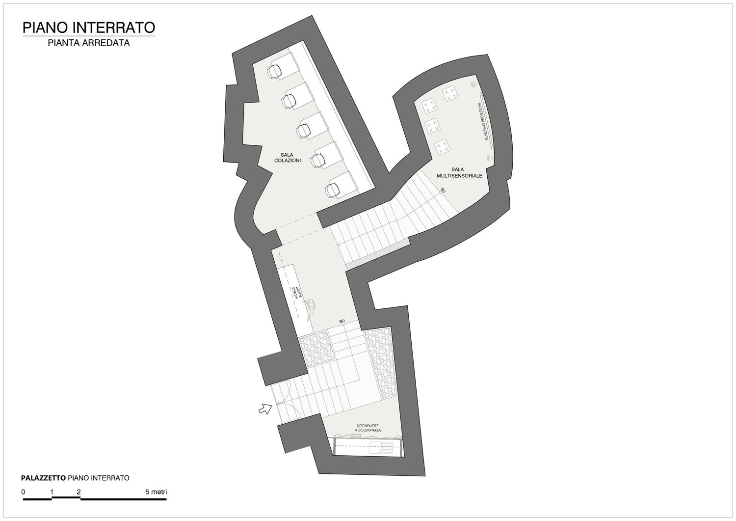 Il piano interrato, con la sala colazioni e lo spazio sensoriale, diventa il cuore esperienziale del B&B: la pietra e le volte sono lasciate libere di emergere senza rivestimenti, trasformando la grotta in un ambiente emozionale, dove colazione e proiezioni si intrecciano.