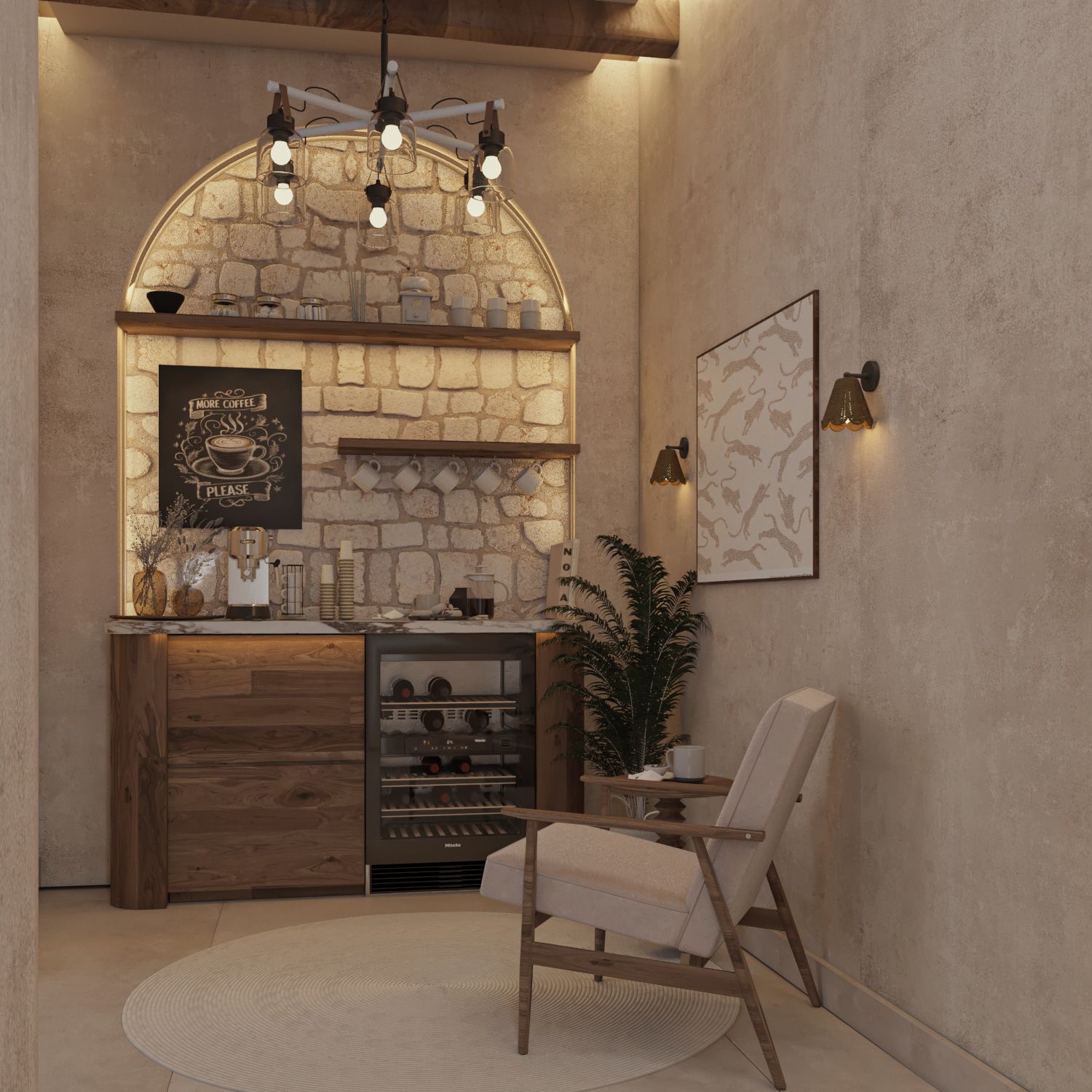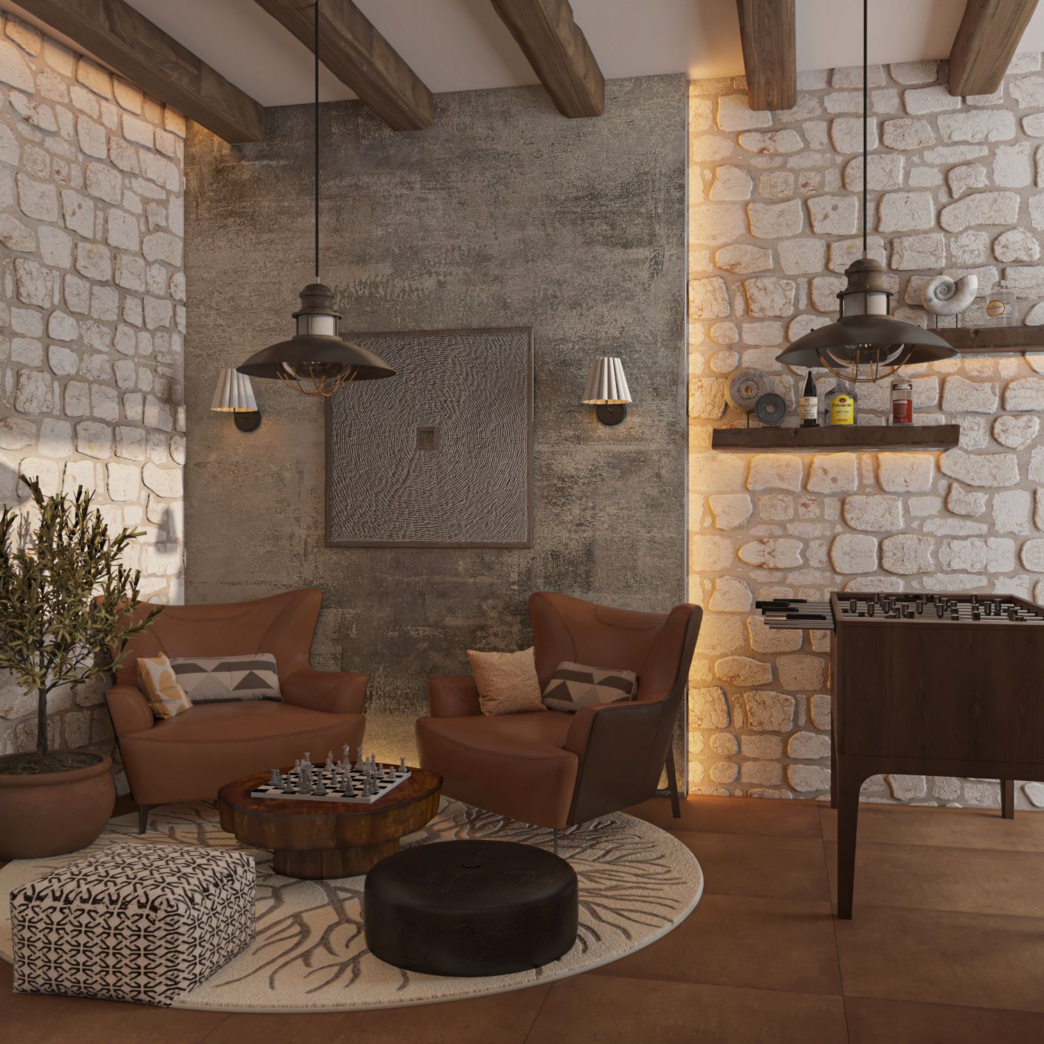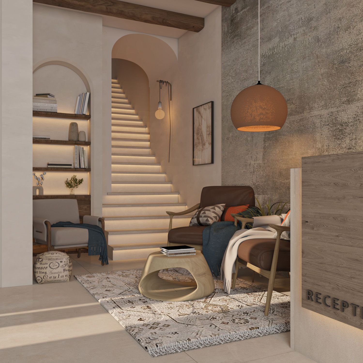 - Ground Floor We began with the ground floor, designing a small reception area with cozy seating to warmly welcome guests. This level also includes the main bathroom and a laundry room, positioned for easy access and functionality without compromising aesthetics.