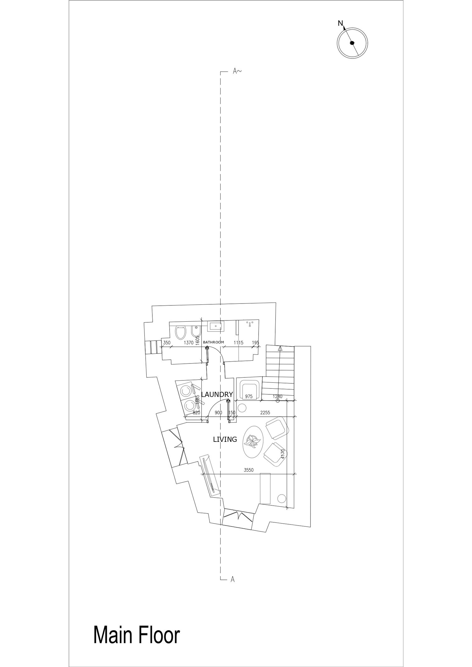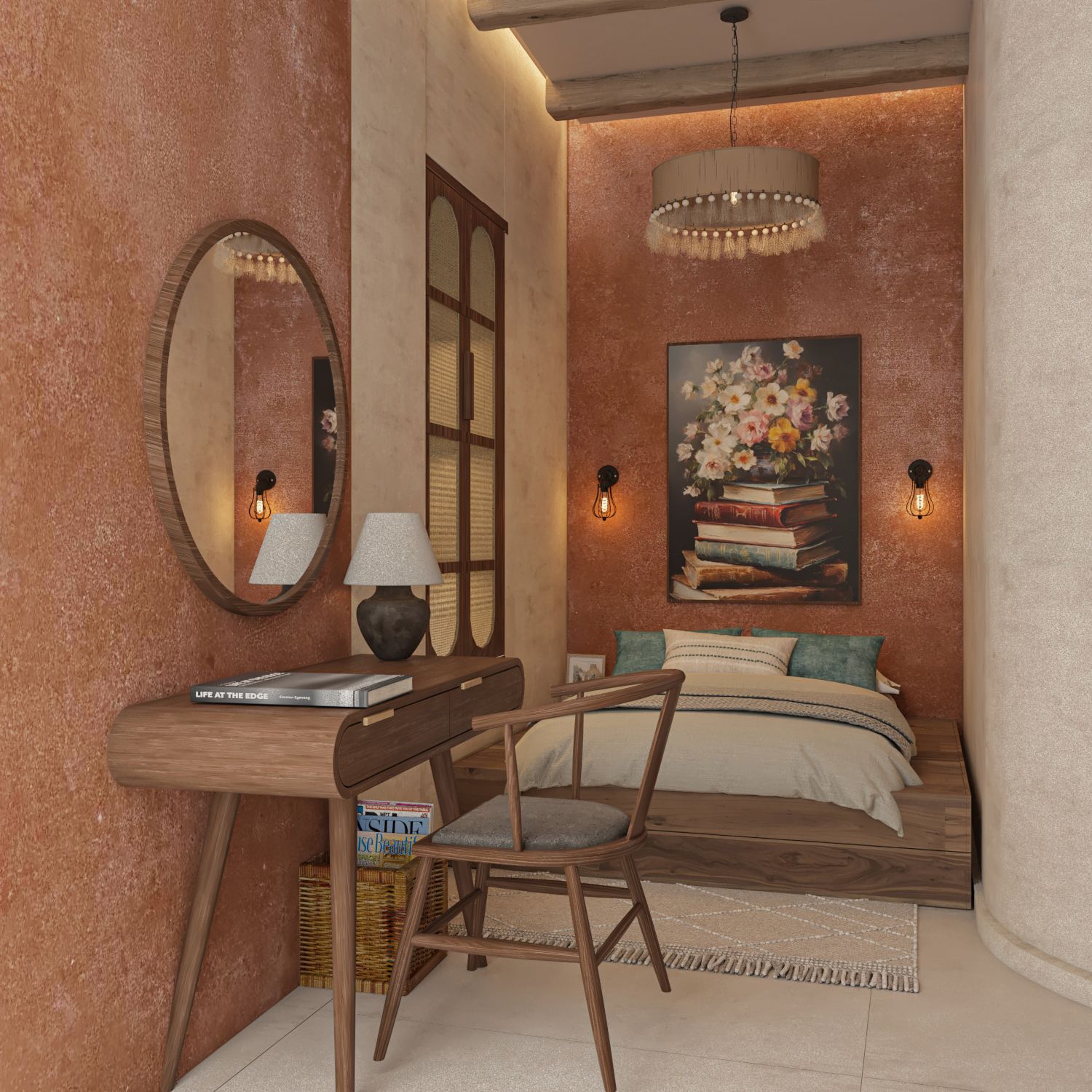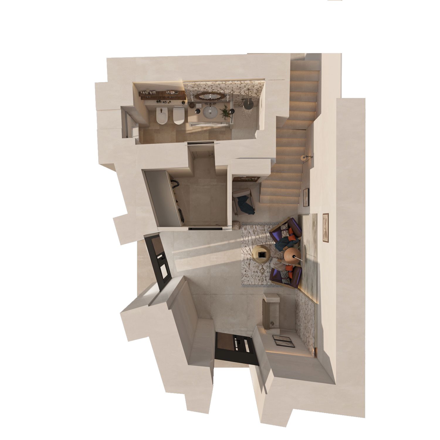 - Ground Floor We began with the ground floor, designing a small reception area with cozy seating to warmly welcome guests. This level also includes the main bathroom and a laundry room, positioned for easy access and functionality without compromising aesthetics.