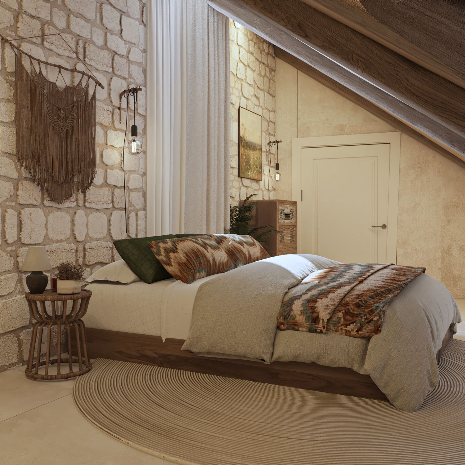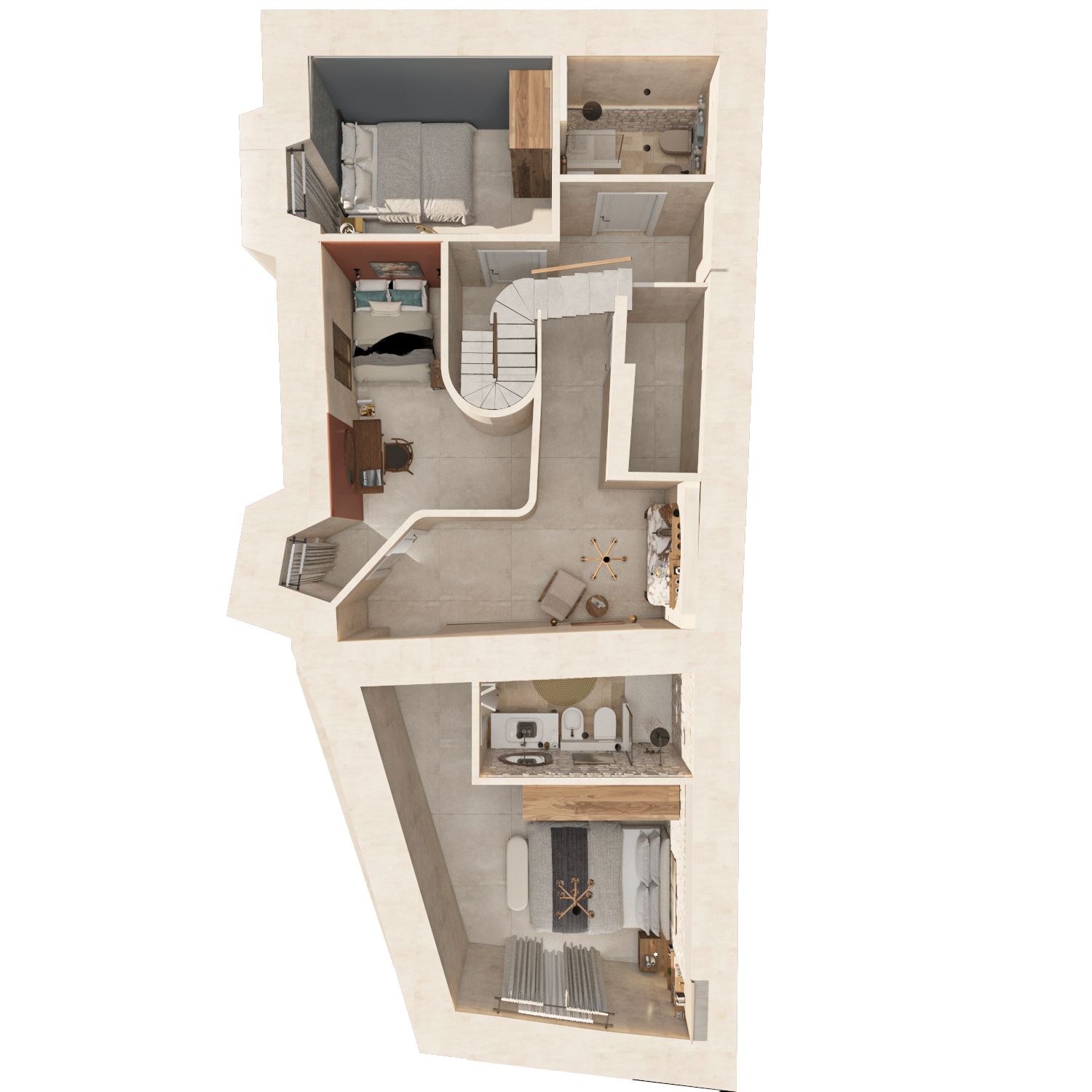 - Attic A beautiful spiral staircase leads to the attic, where we’ve created two additional bedrooms. These rooms continue the theme of individuality and charm, offering guests a peaceful retreat. This floor is designed focusing purely on the sleeping experience.