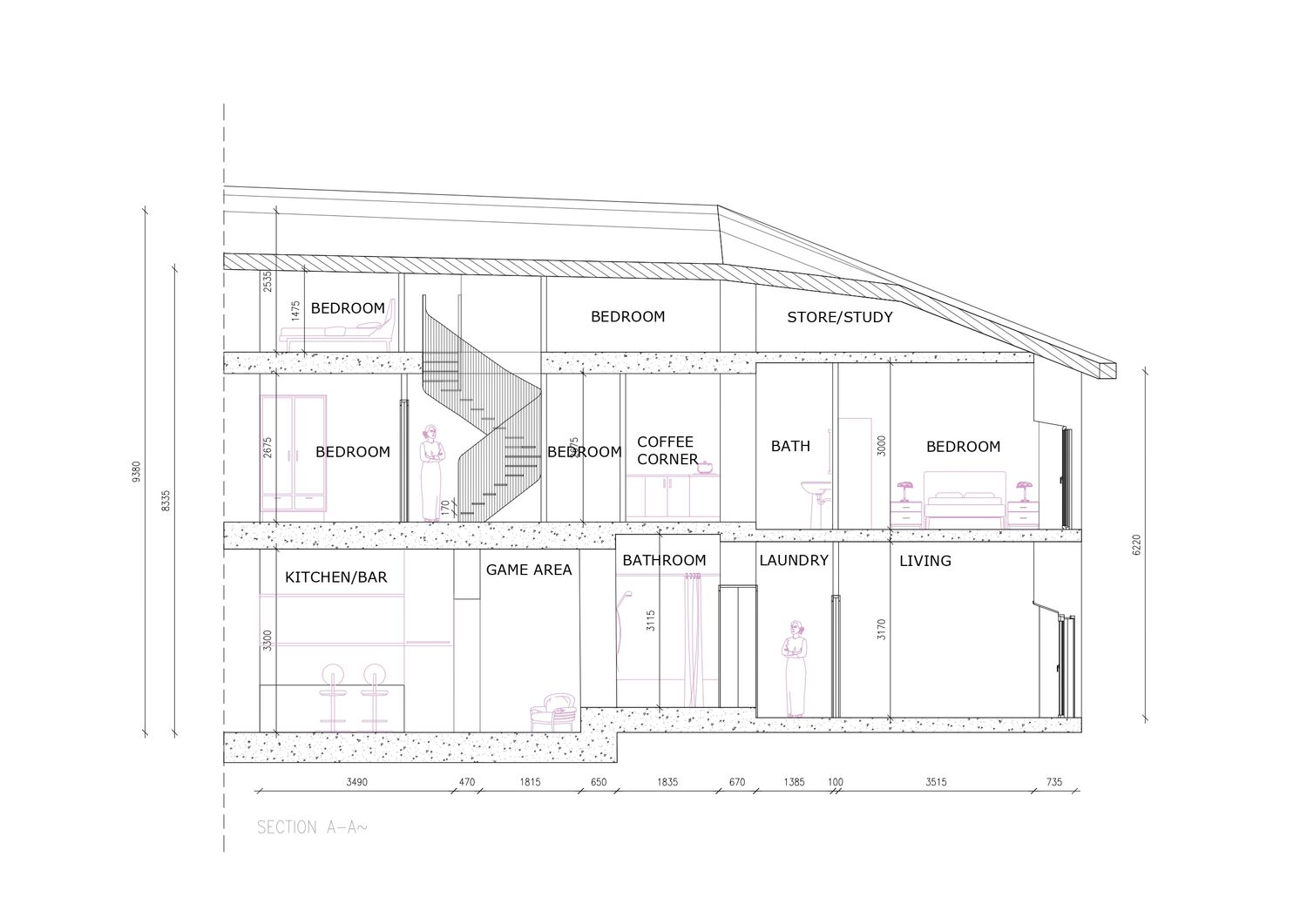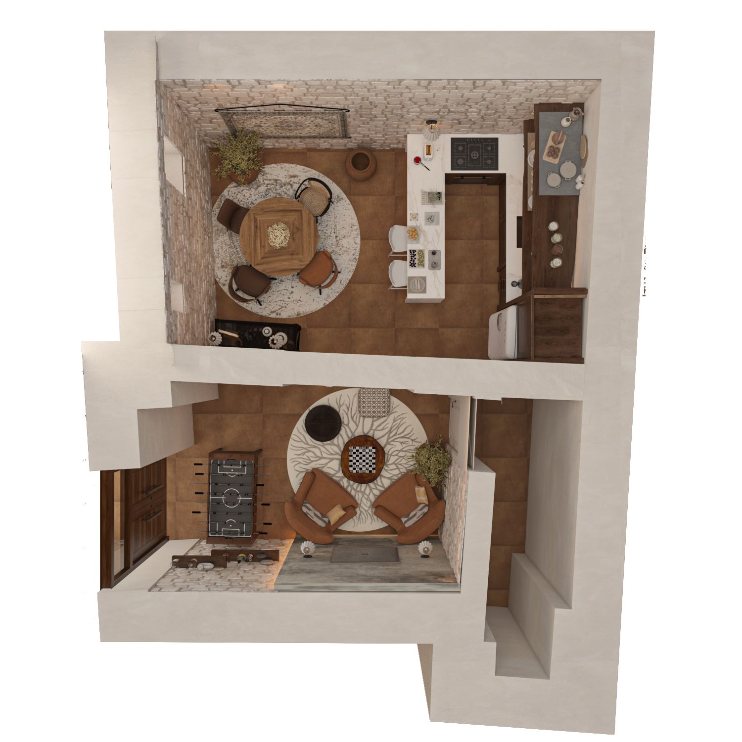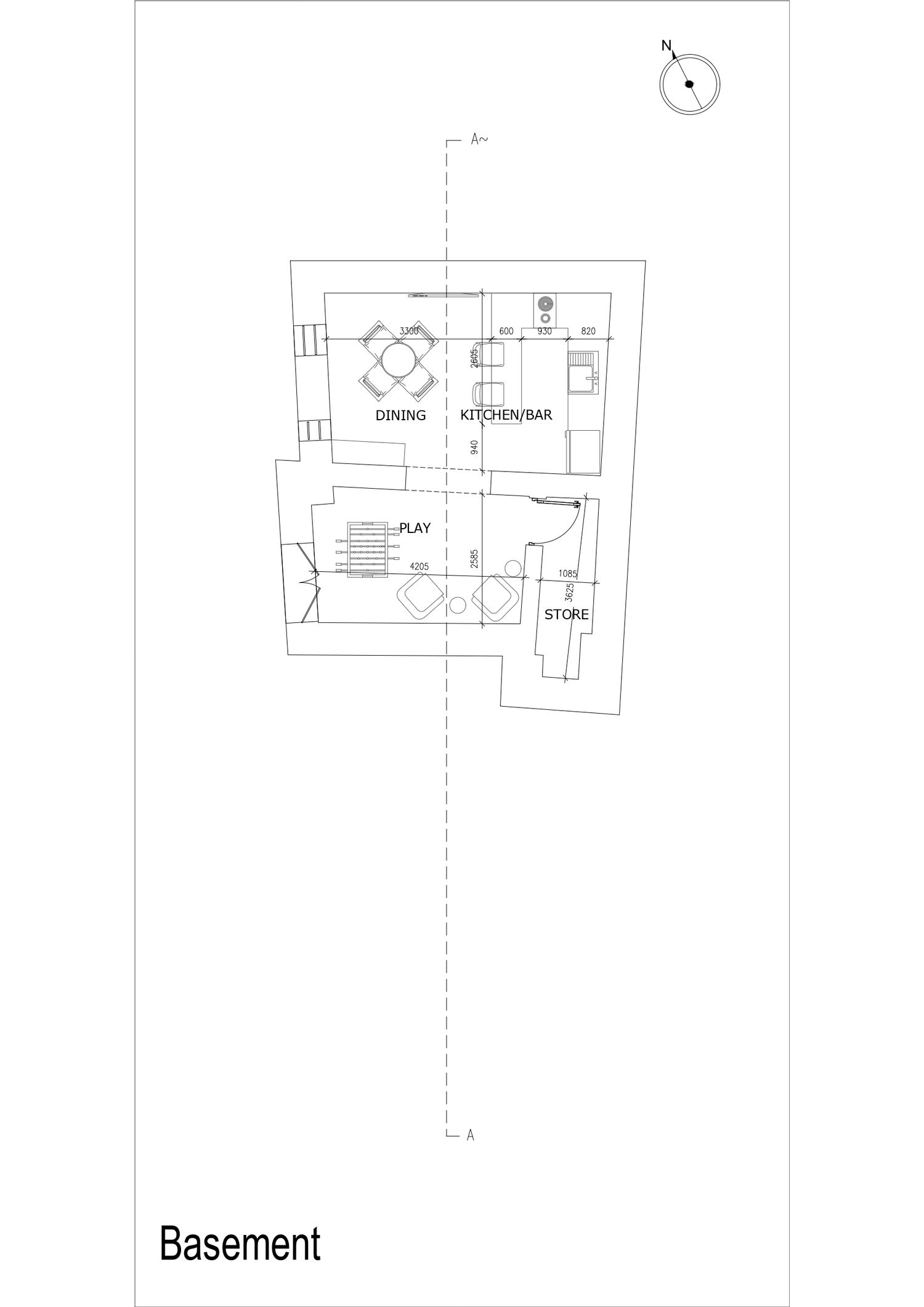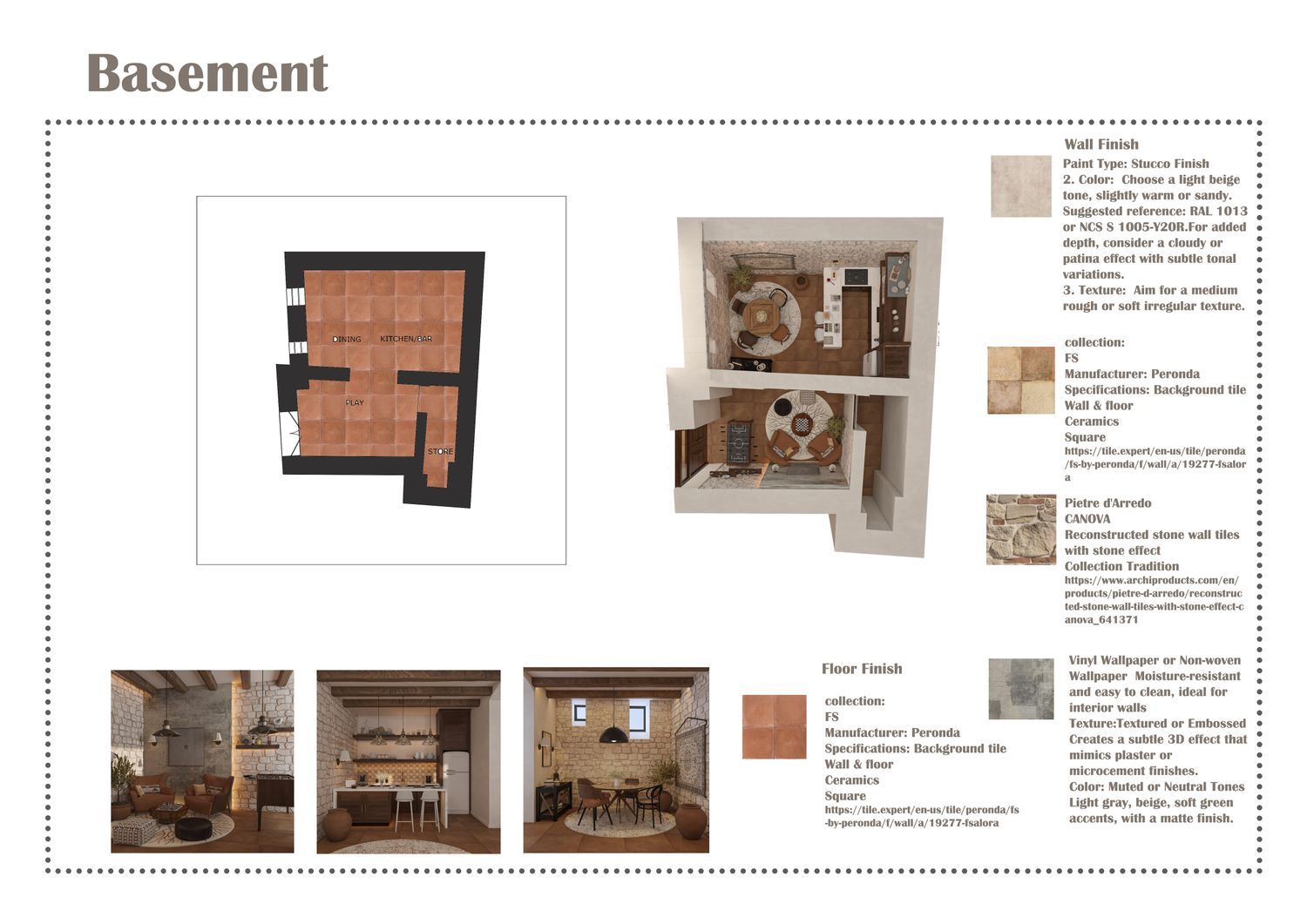 - Basement The basement is envisioned as a space for relaxation and entertainment, featuring a dining nook, a small kitchen, a refined lounge area, a play corner, and a practical storage room. This level adds a social and recreational dimension to the guest experience.
