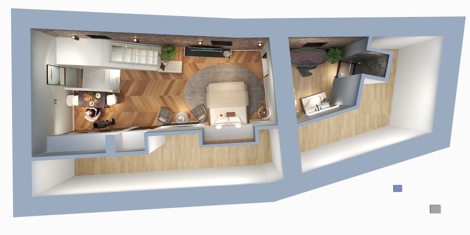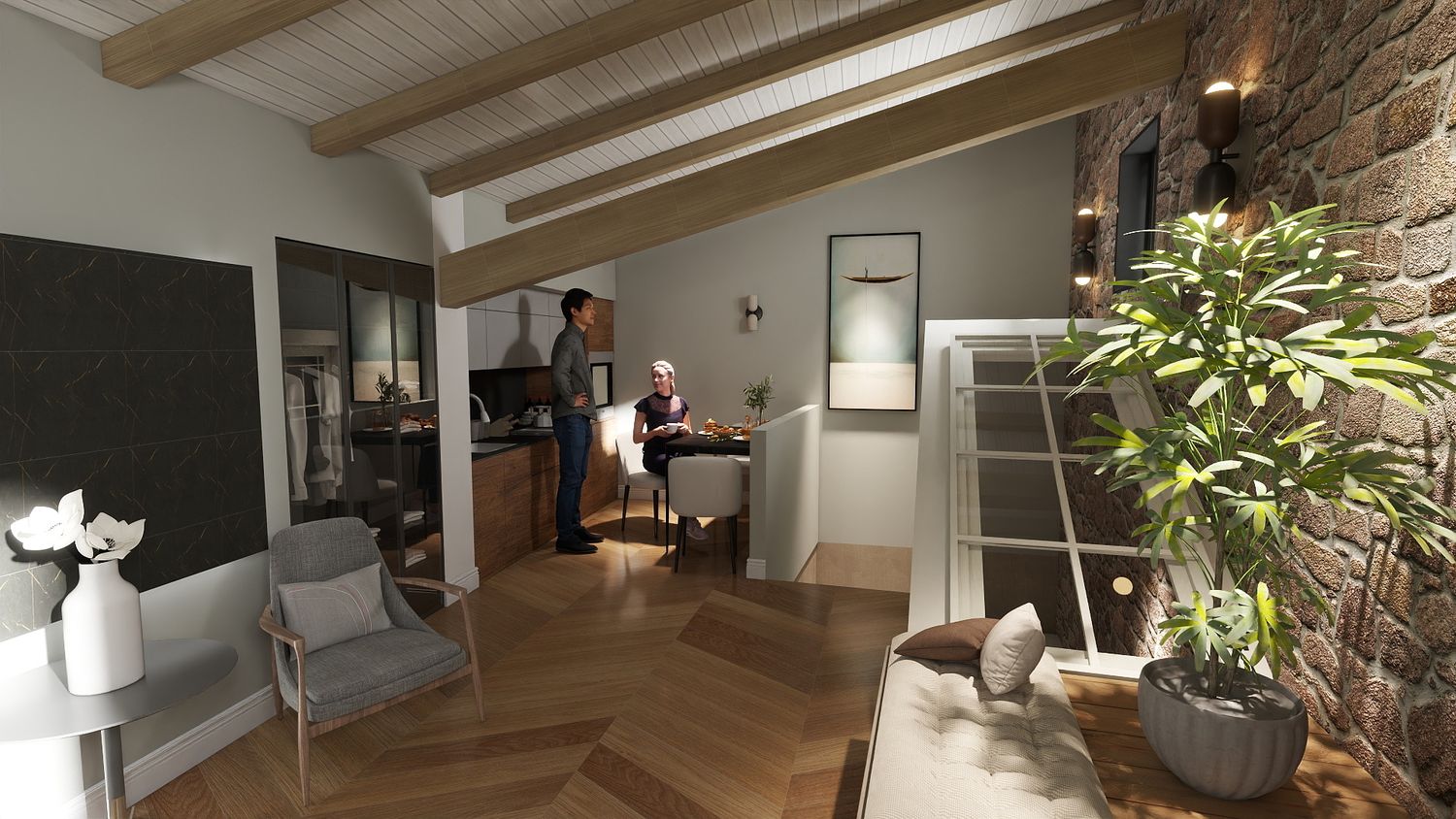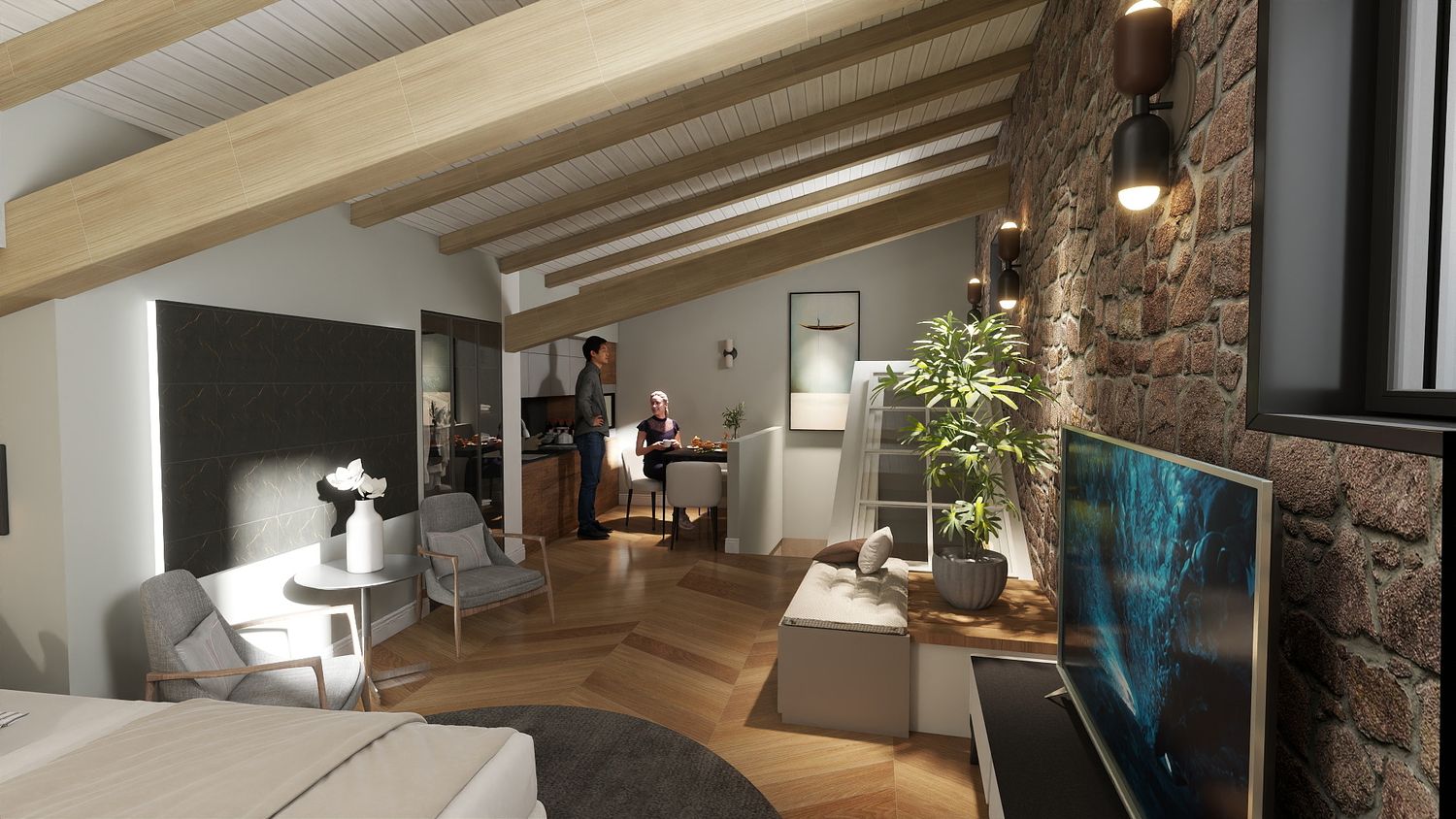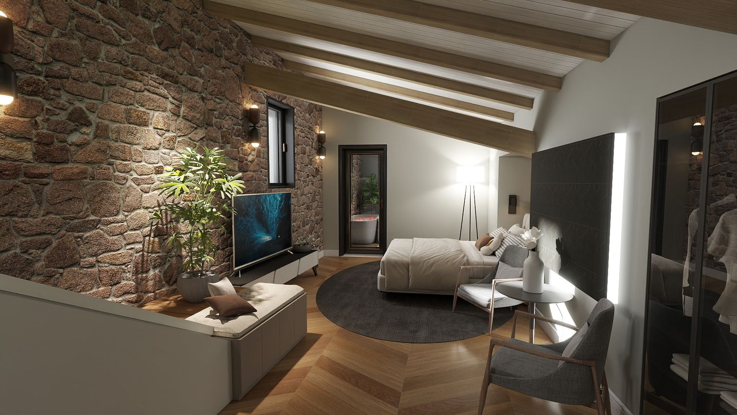 Ogni ambiente offre un’esperienza intima e ricercata, coerente con un’accoglienza di livello superiore: camere dal design caldo e materico, bagni contemporanei, spazi comuni compatti ma di grande impatto visivo. L’intero intervento rispetta il contesto storico, migliorando la funzionalità e introducendo soluzioni moderne come camere “family” con kitchenette e la valorizzazione scenografica della grotta sottostante.