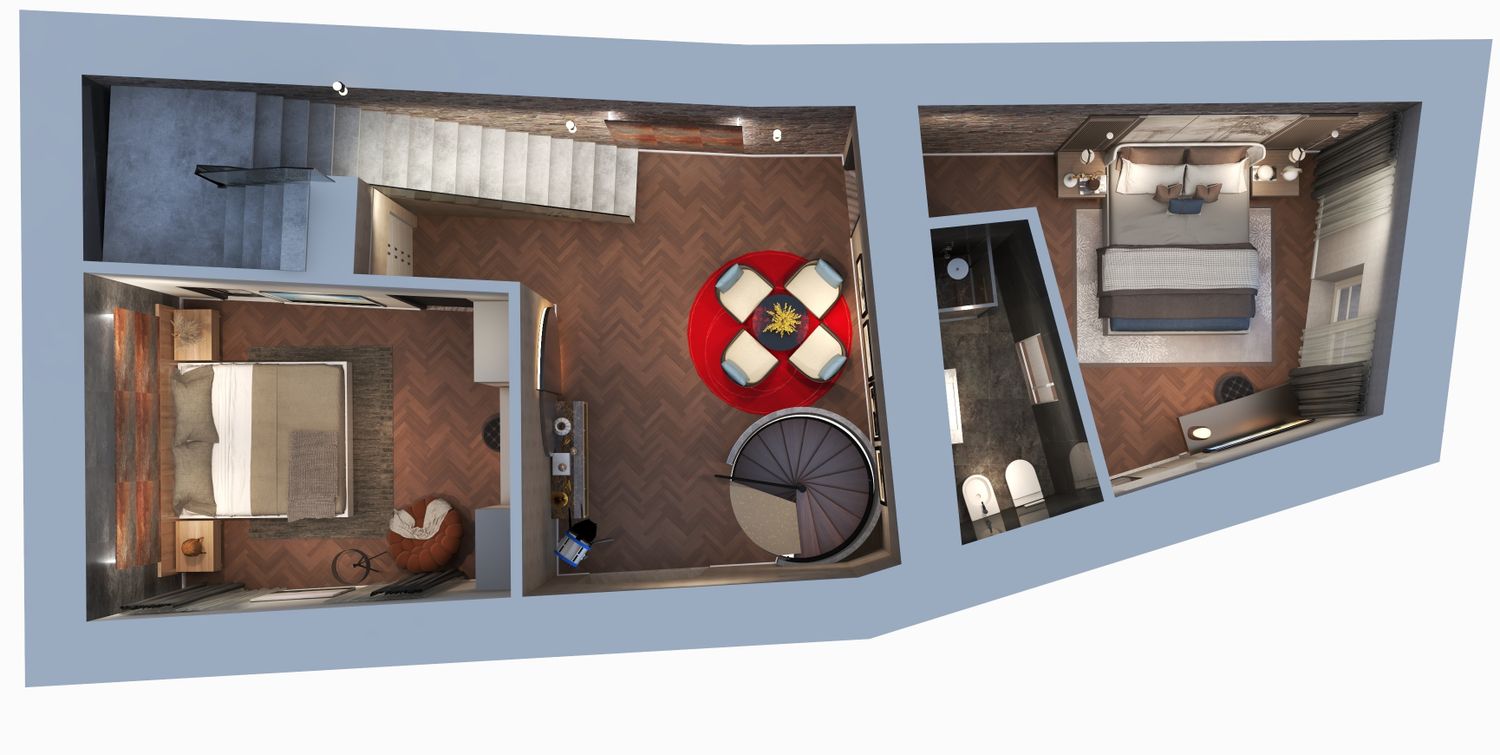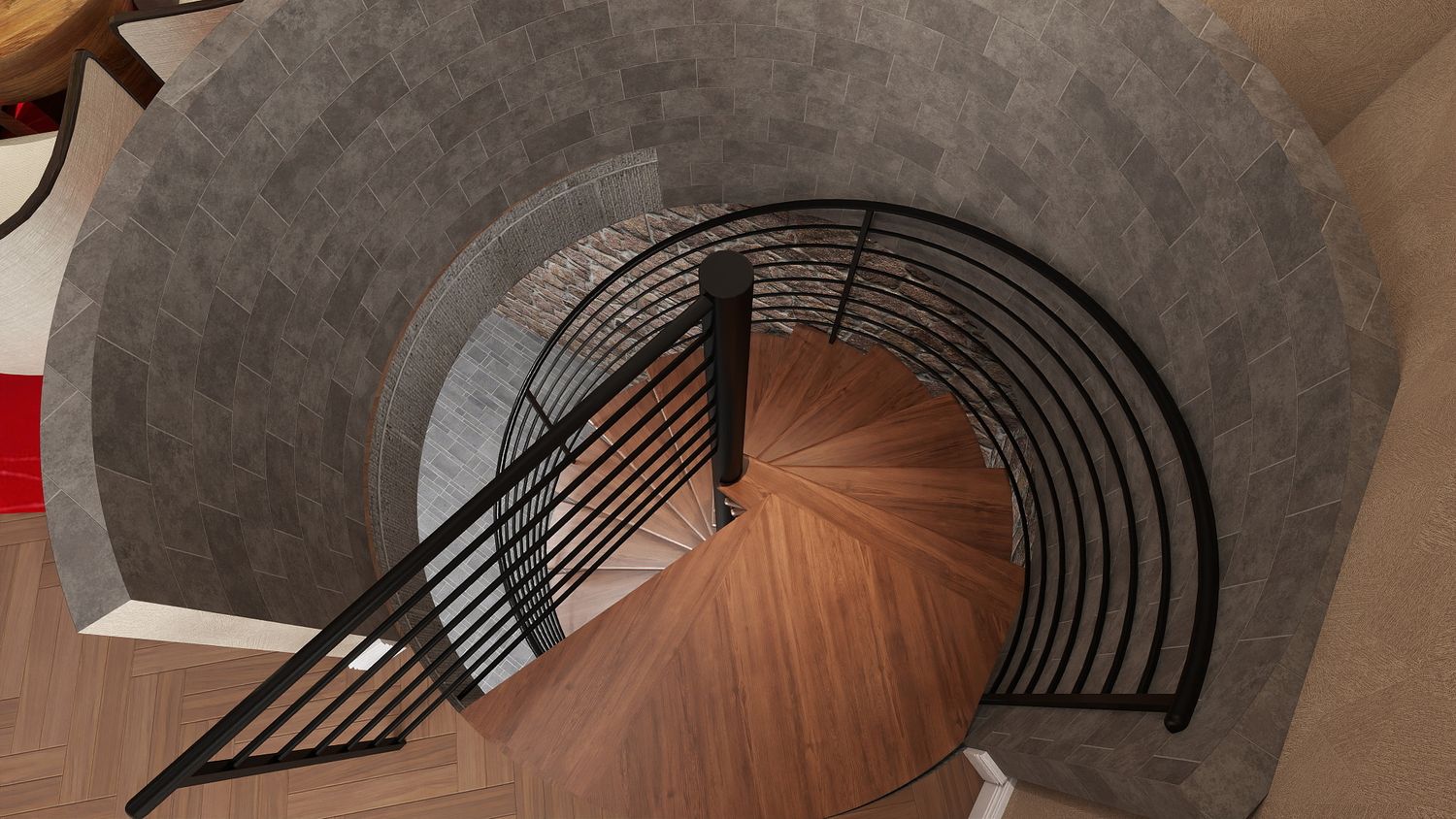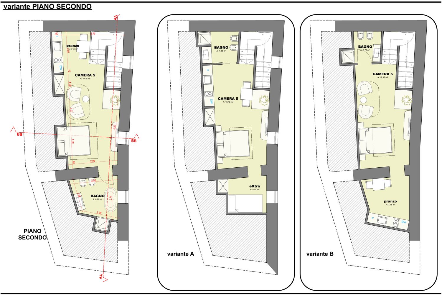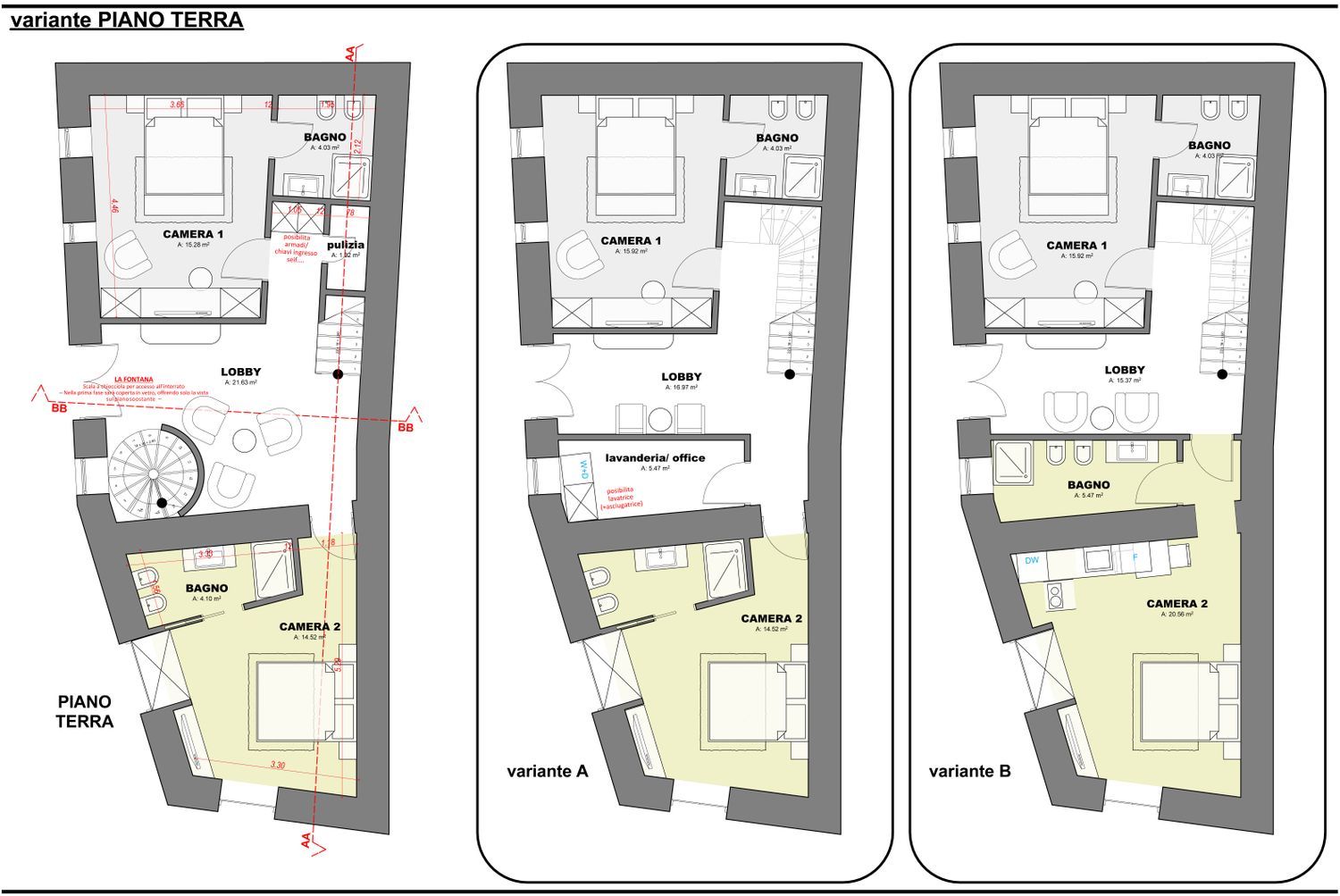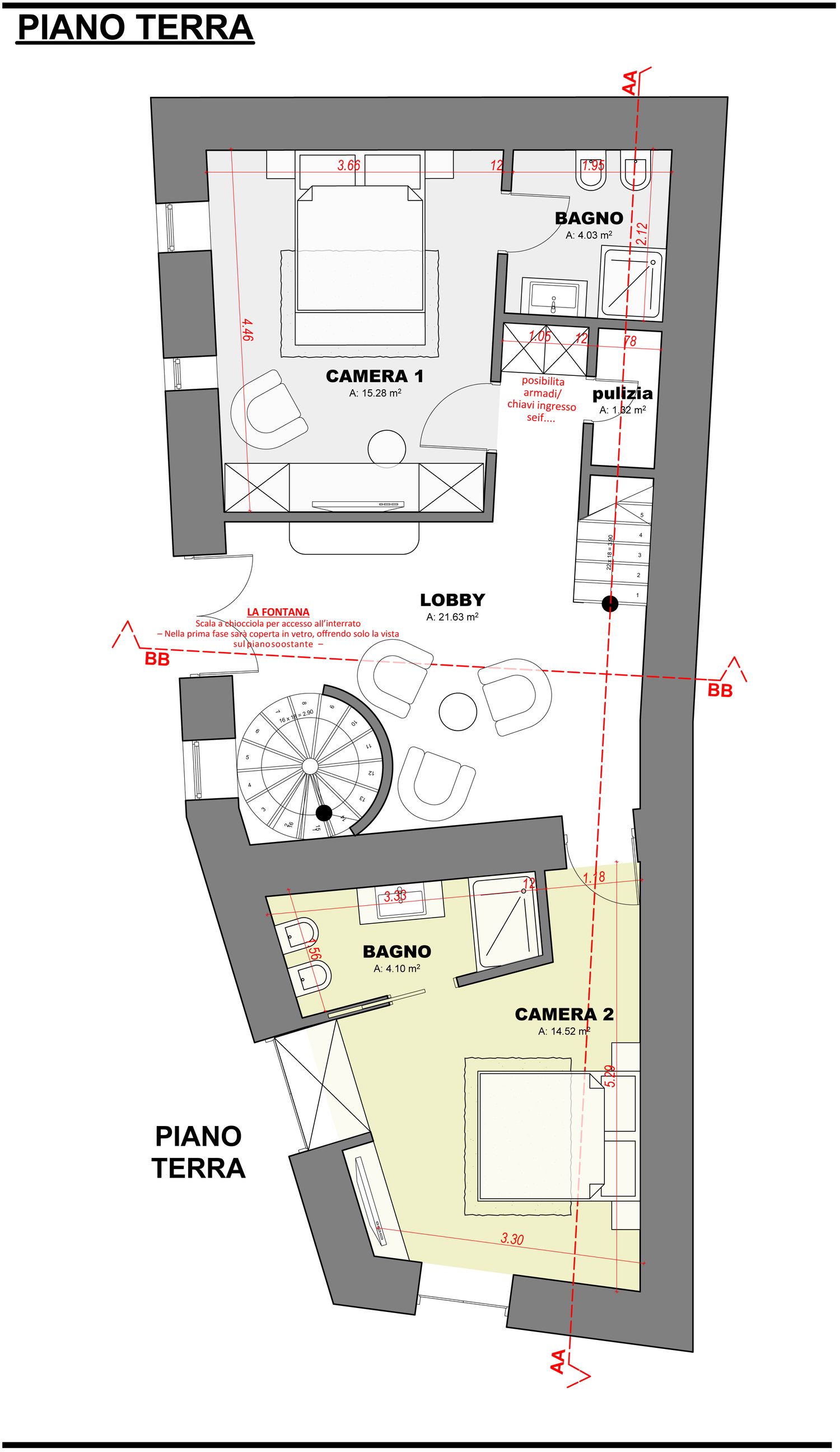 Nel corso dello studio sono state sviluppate diverse varianti distributive, alcune delle quali prevedevano fino a sei camere. In una delle soluzioni è stata inserita una scala elicoidale per l’accesso alla grotta al piano interrato: fino alla sua completa riqualificazione, l’apertura può essere temporaneamente coperta con un elemento in vetro, offrendo comunque una vista scenografica verso il basso.