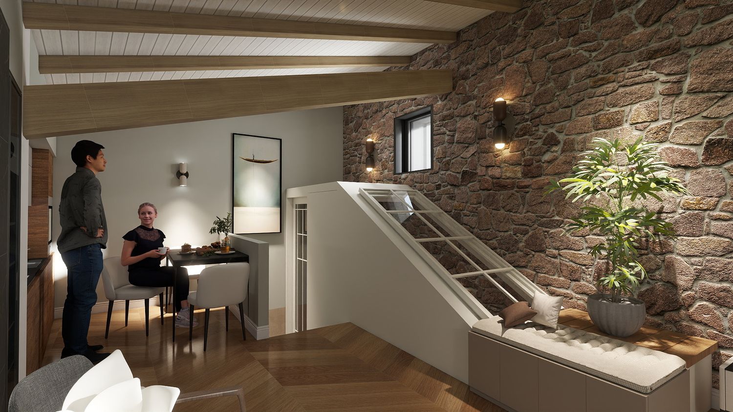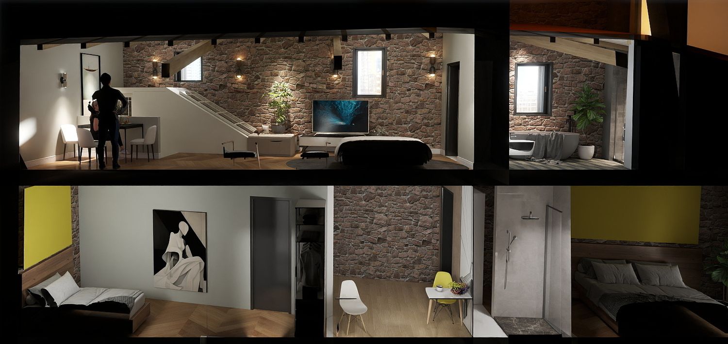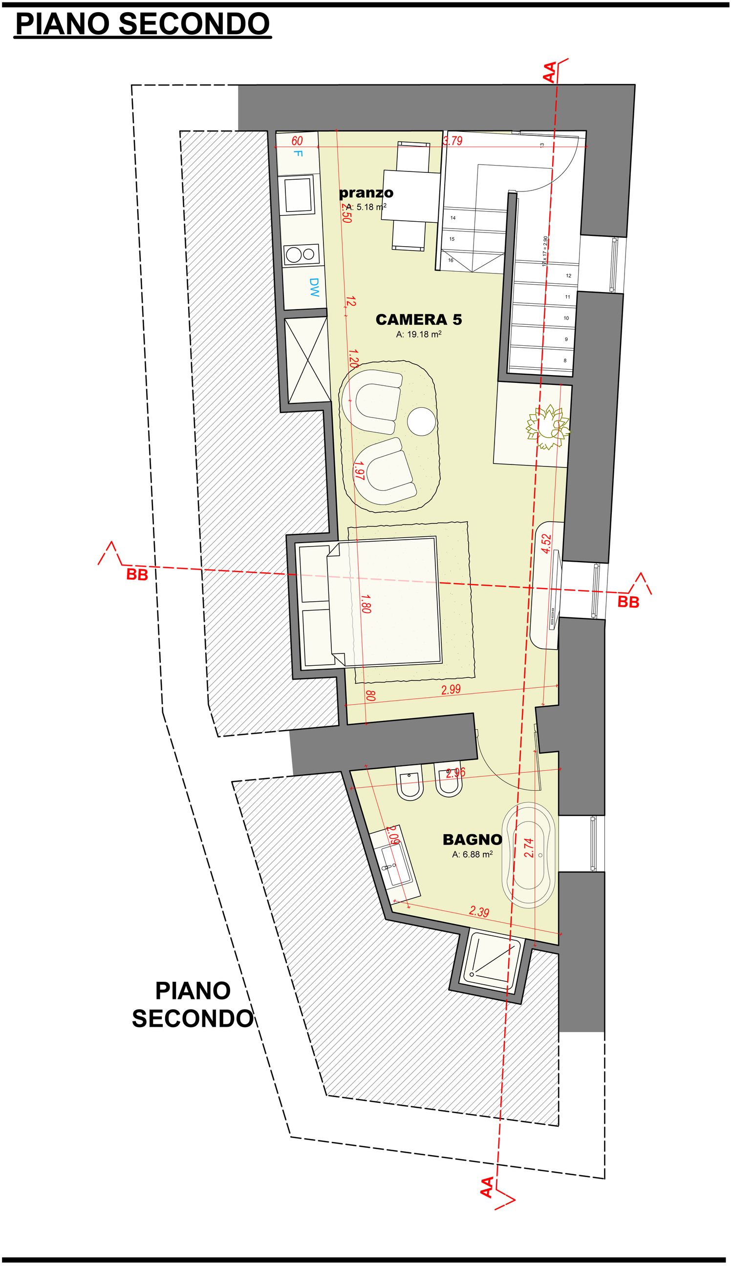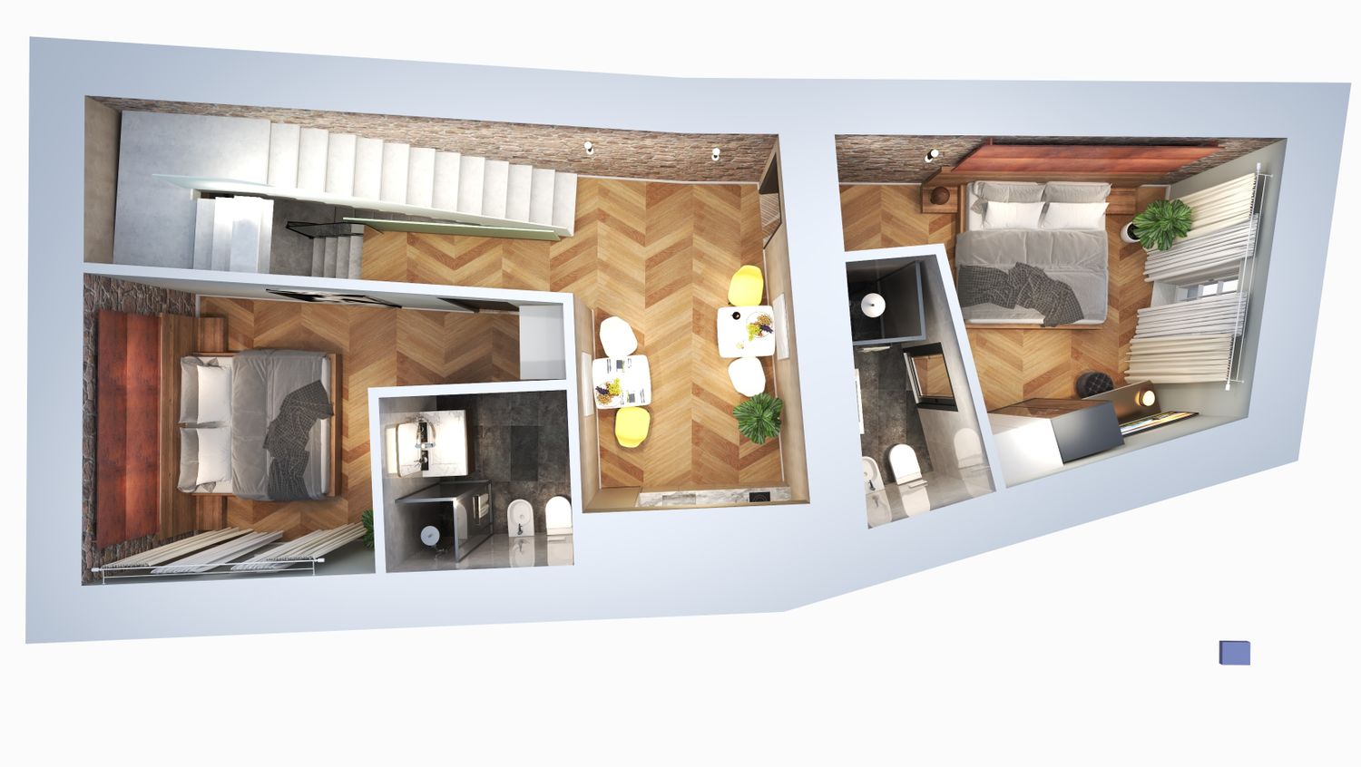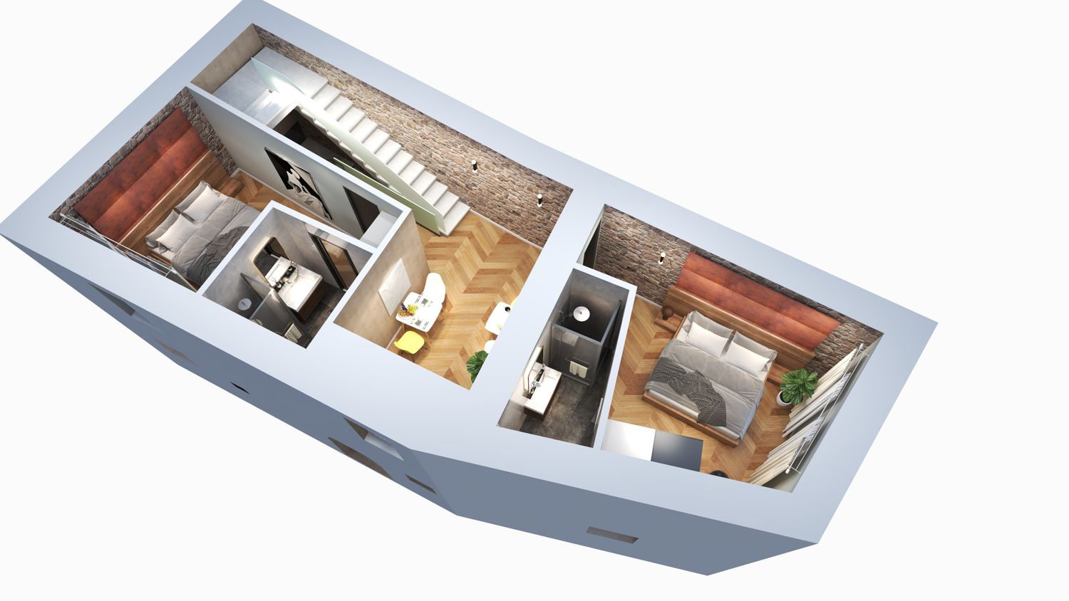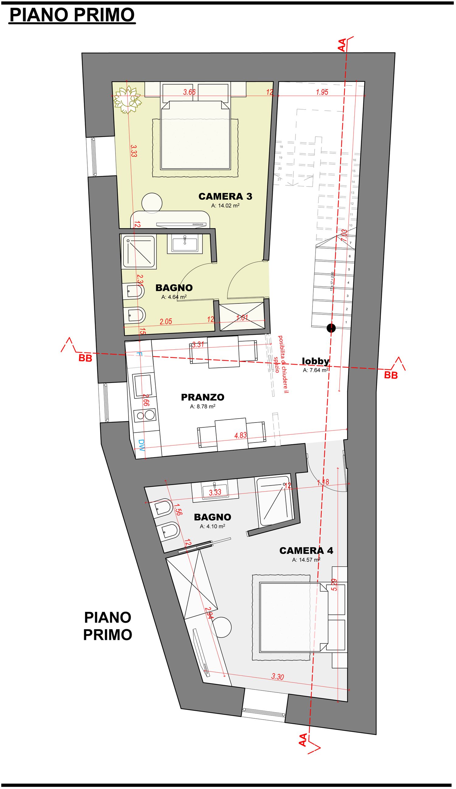 Nel corso dello studio sono state sviluppate diverse varianti distributive, alcune delle quali prevedevano fino a sei camere. In una delle soluzioni è stata inserita una scala elicoidale per l’accesso alla grotta al piano interrato: fino alla sua completa riqualificazione, l’apertura può essere temporaneamente coperta con un elemento in vetro, offrendo comunque una vista scenografica verso il basso.