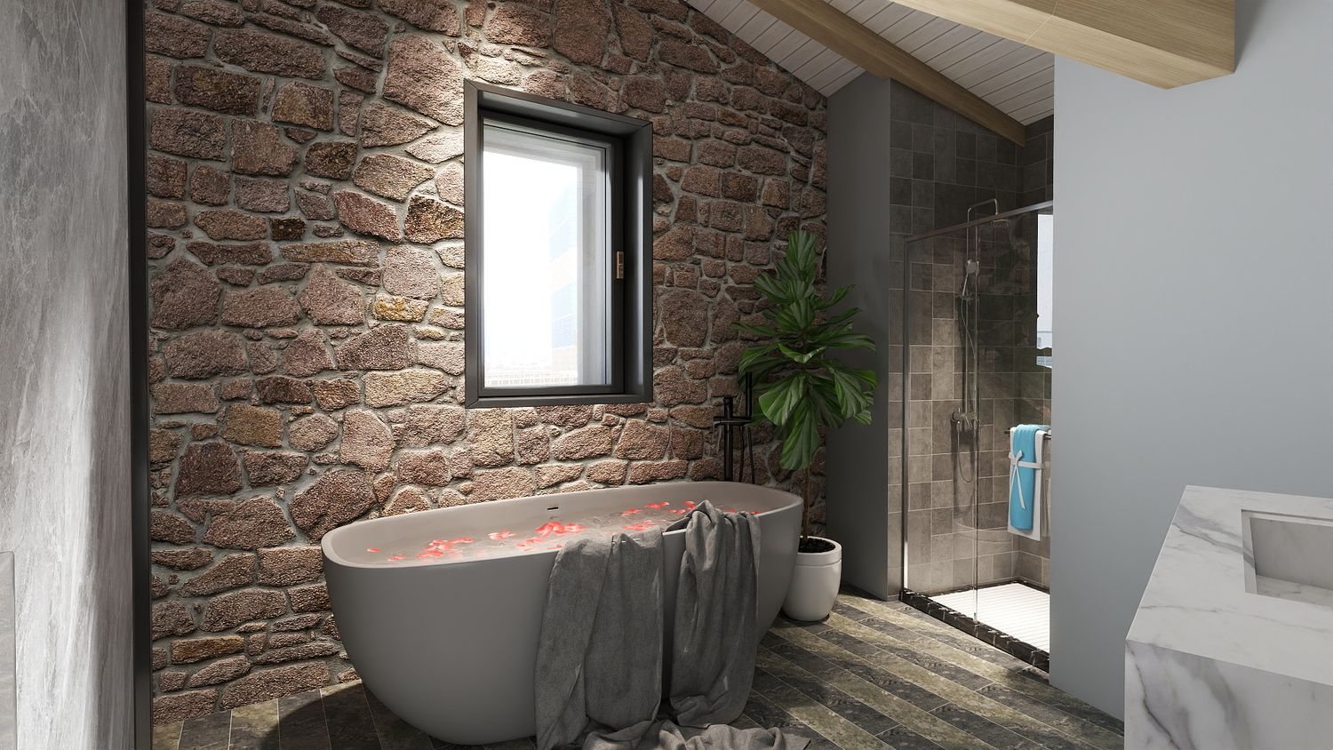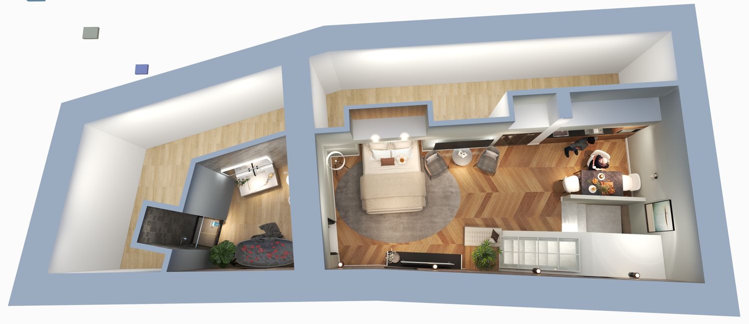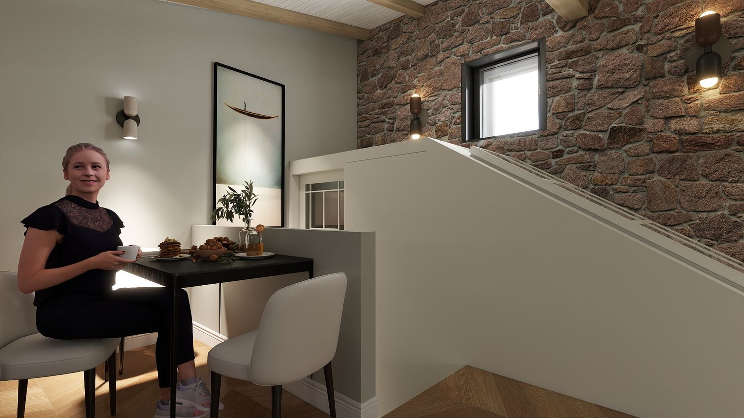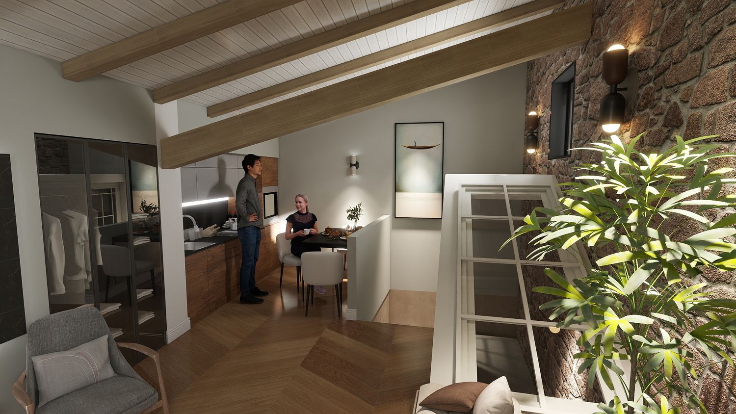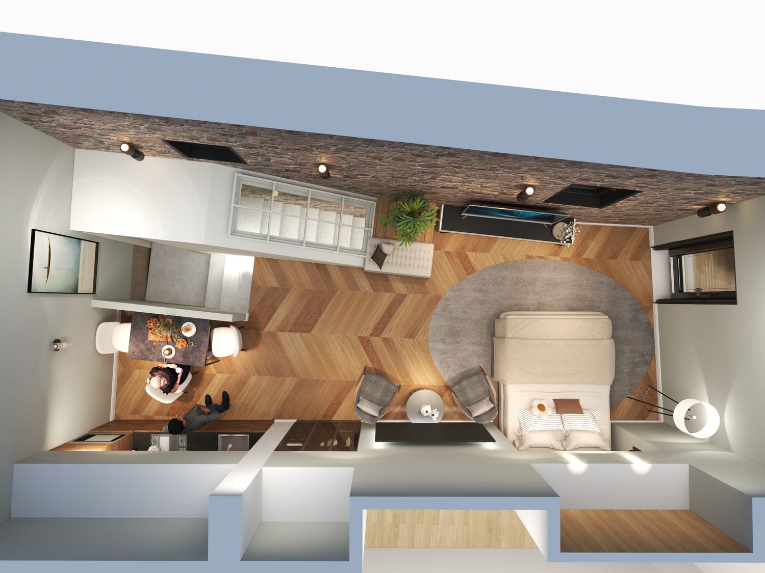 Nel corso dello studio sono state sviluppate diverse varianti distributive, alcune delle quali prevedevano fino a sei camere. In una delle soluzioni è stata inserita una scala elicoidale per l’accesso alla grotta al piano interrato: fino alla sua completa riqualificazione, l’apertura può essere temporaneamente coperta con un elemento in vetro, offrendo comunque una vista scenografica verso il basso.