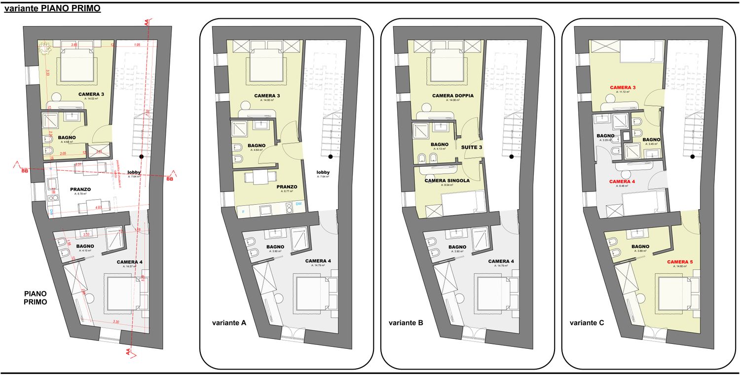 Sono state analizzate configurazioni con e senza kitchenette, camere singole, suite familiari, e proposte con o senza lobby e piccola area comune per la colazione o il pranzo.