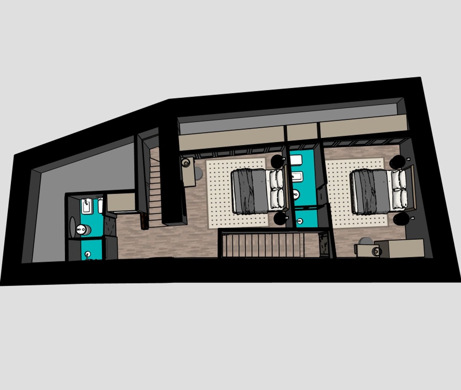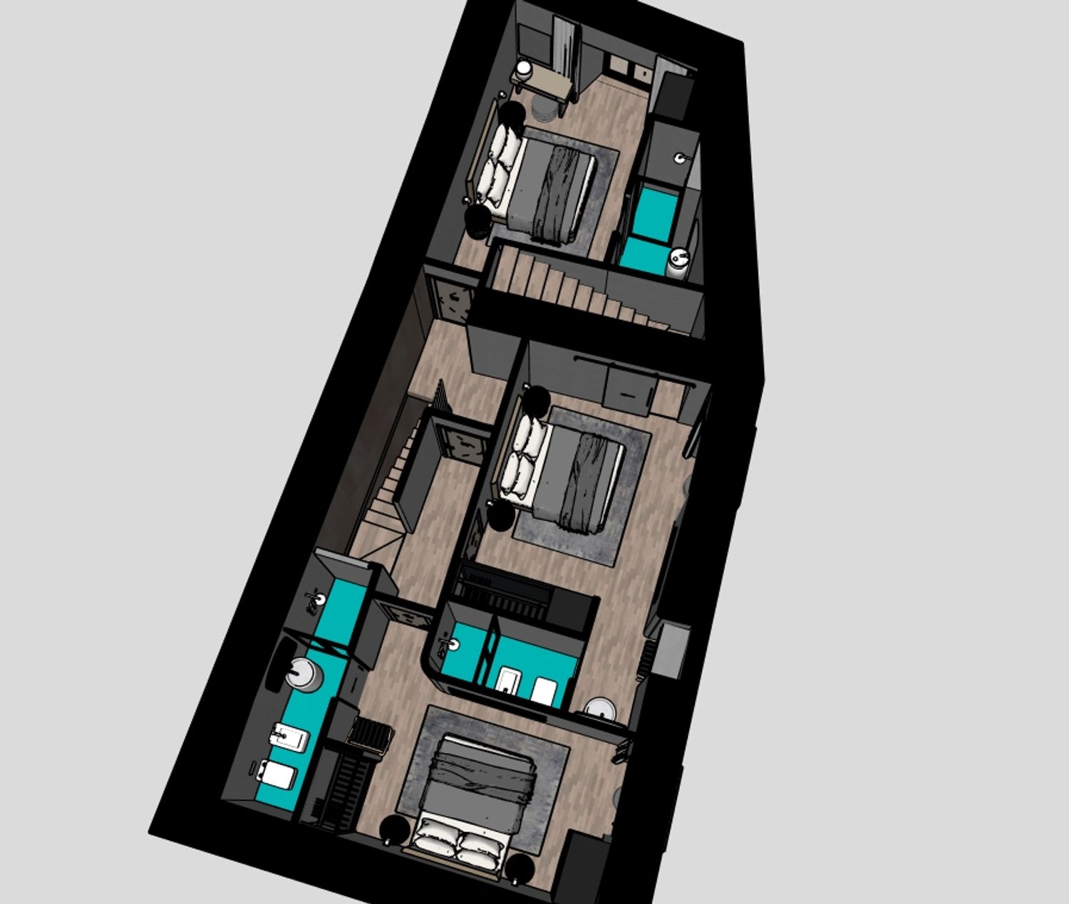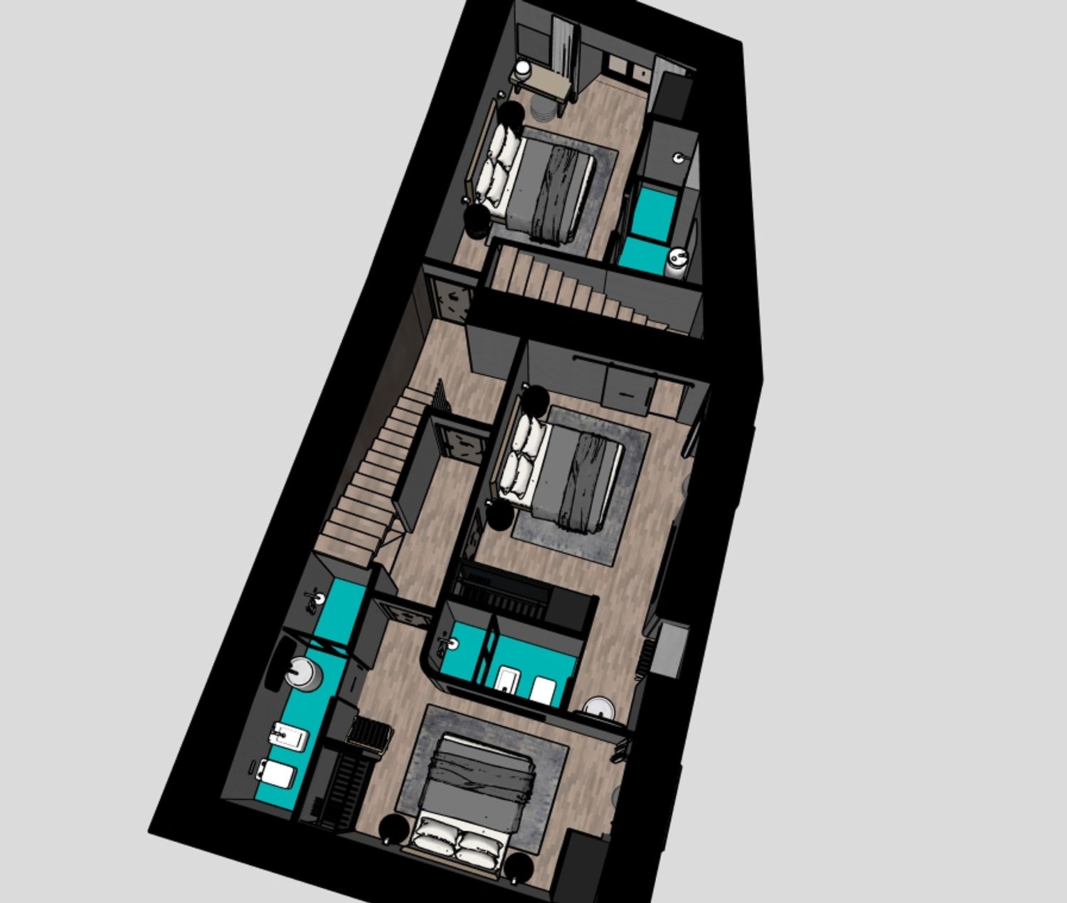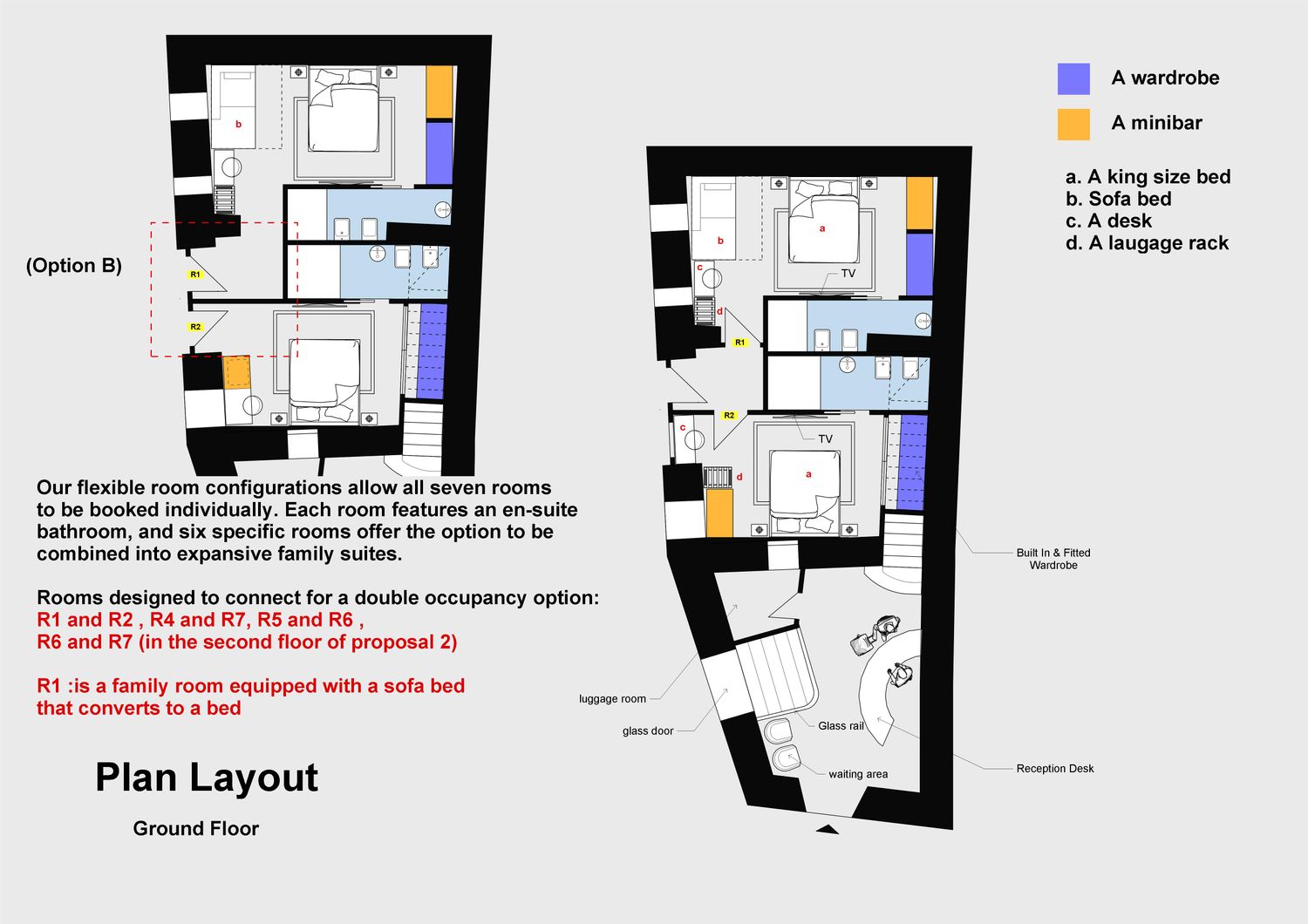 Flexible Room Configurations (7 Rooms Total): The hotel will feature a total of seven rooms, each designed for individual booking and equipped with its own luxurious en-suite bathroom. A core aspect of the design is the flexibility to cater to varying guest needs: