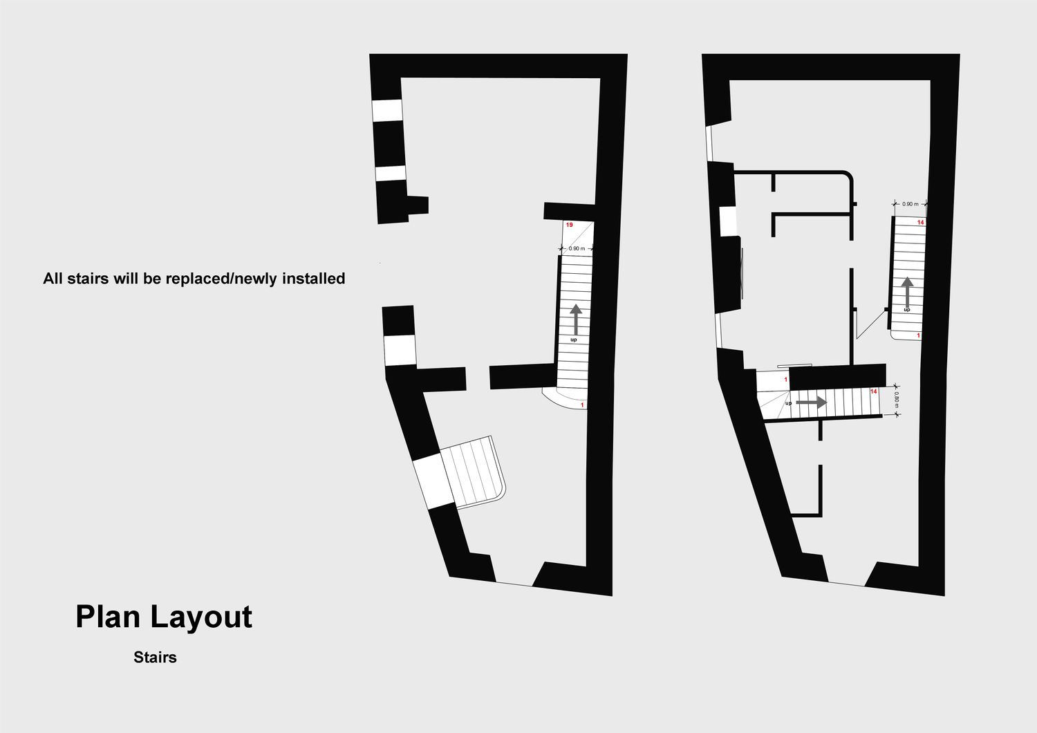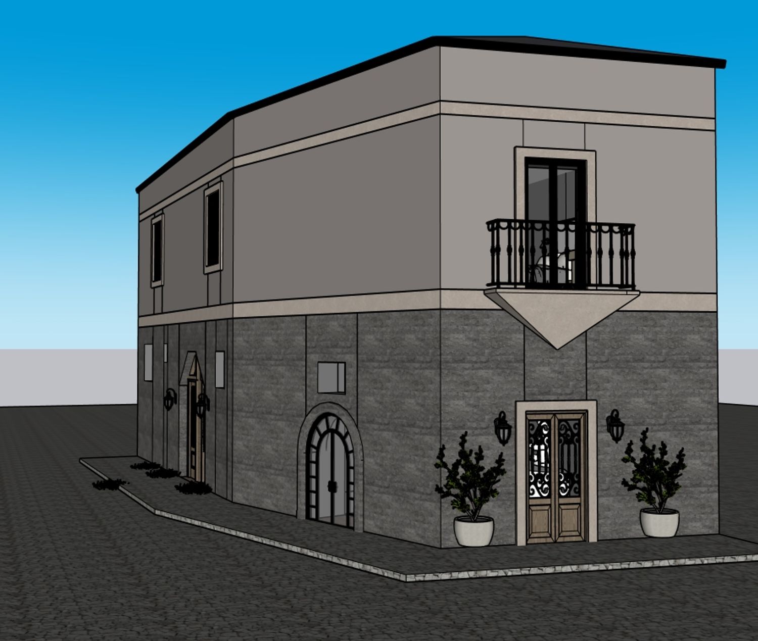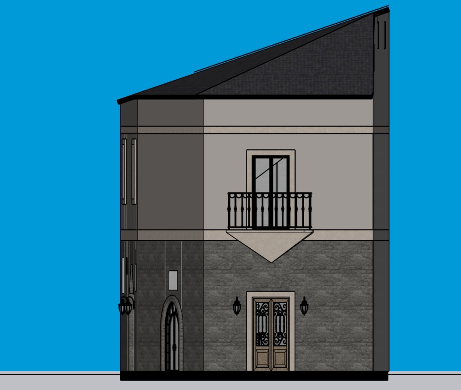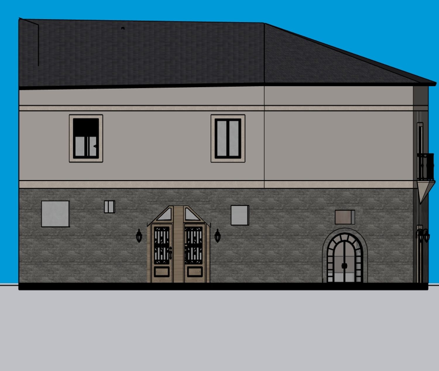 Exterior Renovation Concept: The exterior renovation focuses on respecting and enhancing the building's heritage. The facade will feature a sophisticated approach with restored natural stone on the side elevation (reflecting original construction) and a tasteful, smooth gray stucco render on the main front elevation. All original architectural details, such as windows, doors, and the balcony, will be meticulously restored or replaced with historically sensitive, energy-efficient equivalents. Exterior lighting will be thoughtfully integrated, employing a simple, understated horizontal strip lighting design to define the building's contours and provide a warm, inviting glow, complemented by subtle interior lighting visible from windows.