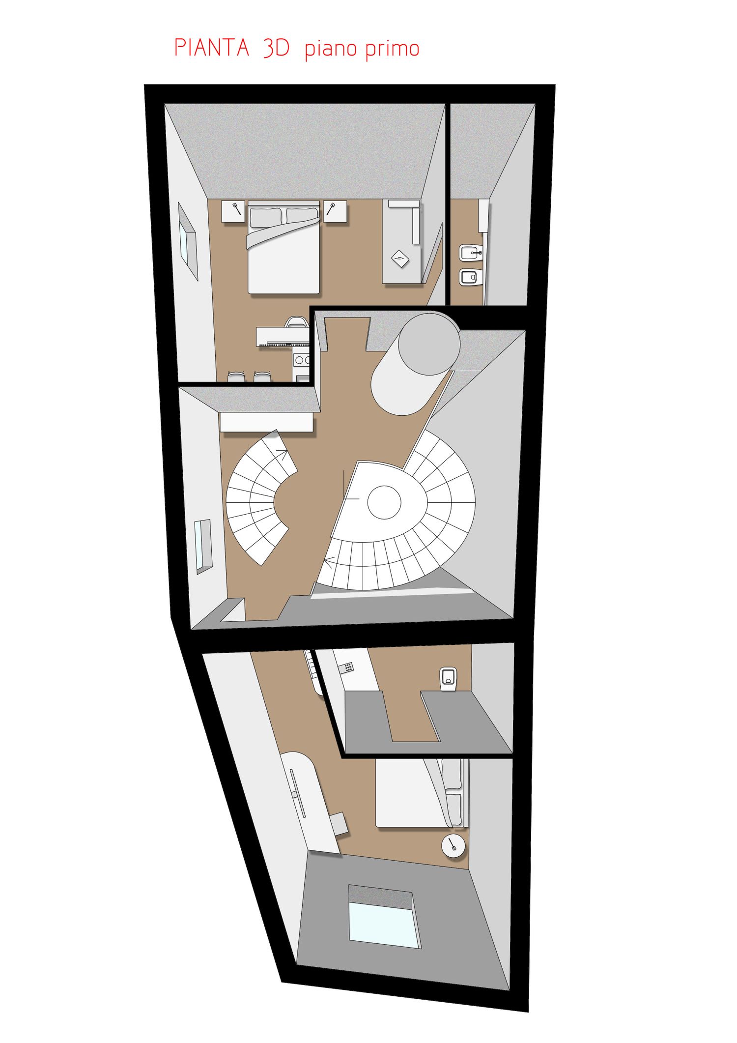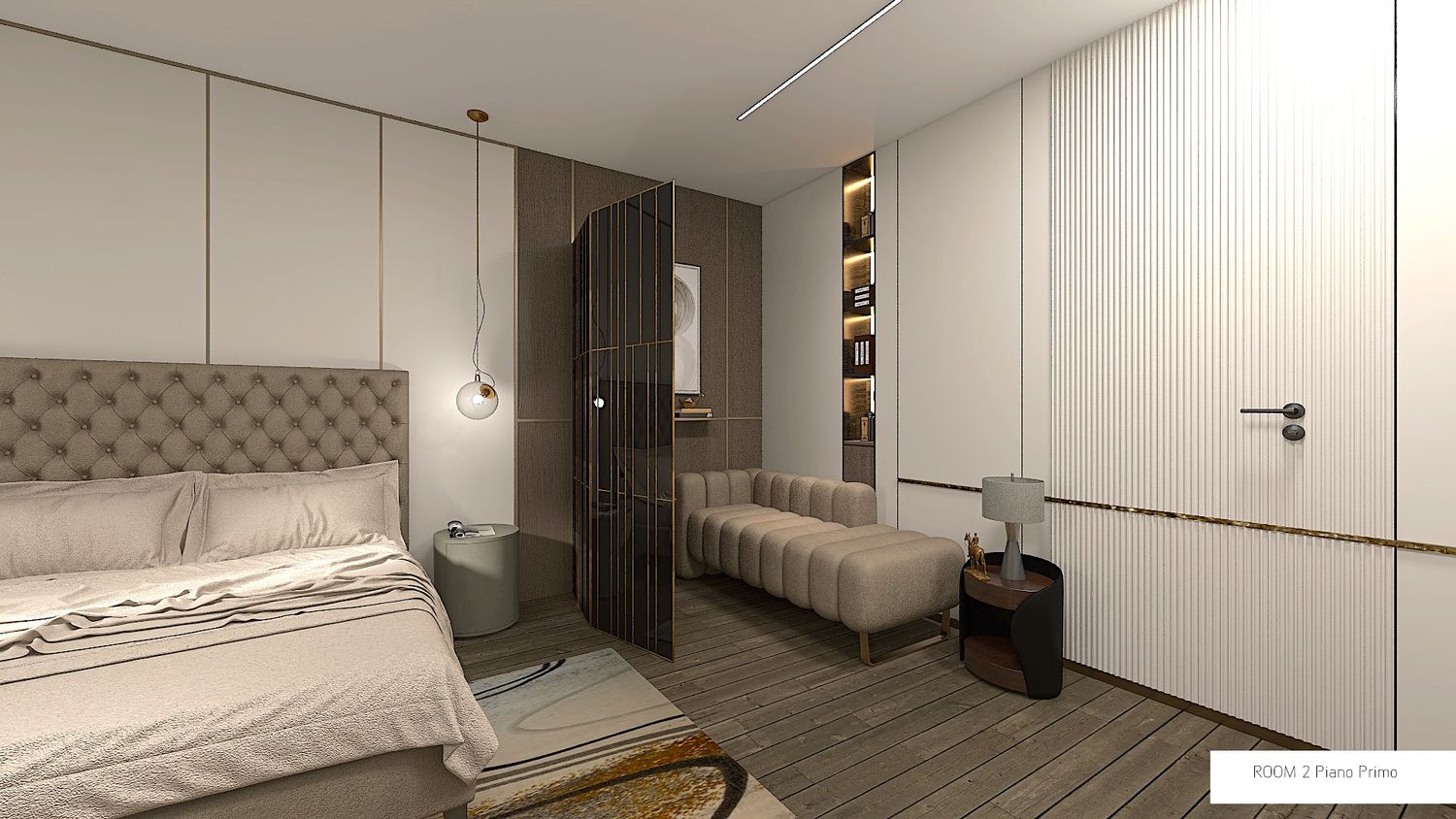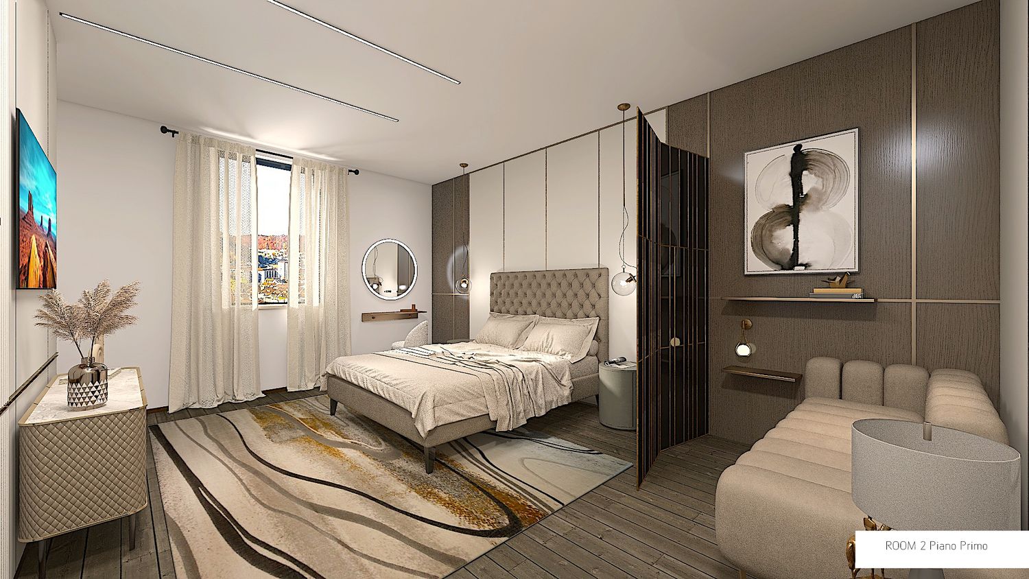 The proposed solution stems from an in-depth initial analysis to understand how to optimize space and make the structure both attractive and comfortable. The new entrance is airy and bright, with a designer staircase extending through the various floors, flanked by a circular elevator that seamlessly connects the levels. Two options are offered for the ground floor, the main difference being access from the plaza or the side street. This floor accommodates the entrance hall, a breakfast/relaxation room, a bedroom with bathroom, and a utility area with a toilet and storage/pantry. The upper floors accommodate four additional bedrooms, each with a private bathroom, all designed to offer the amenities sought after in a structure of this type. Finally, the basement level is being redeveloped to host events such as wine tastings. To emphasize this, circular openings are inserted into the floor of the hall, allowing a direct view of the cellars below. The furnishings are simple and linear, with neutral tones paired with bolder color details to enhance the spaces.