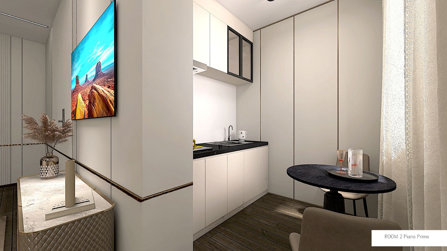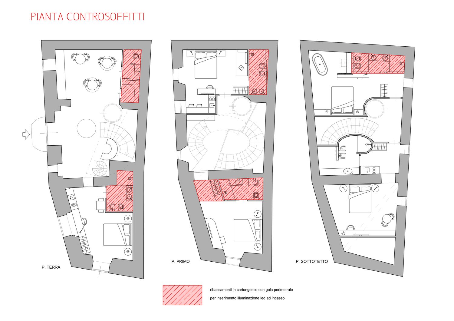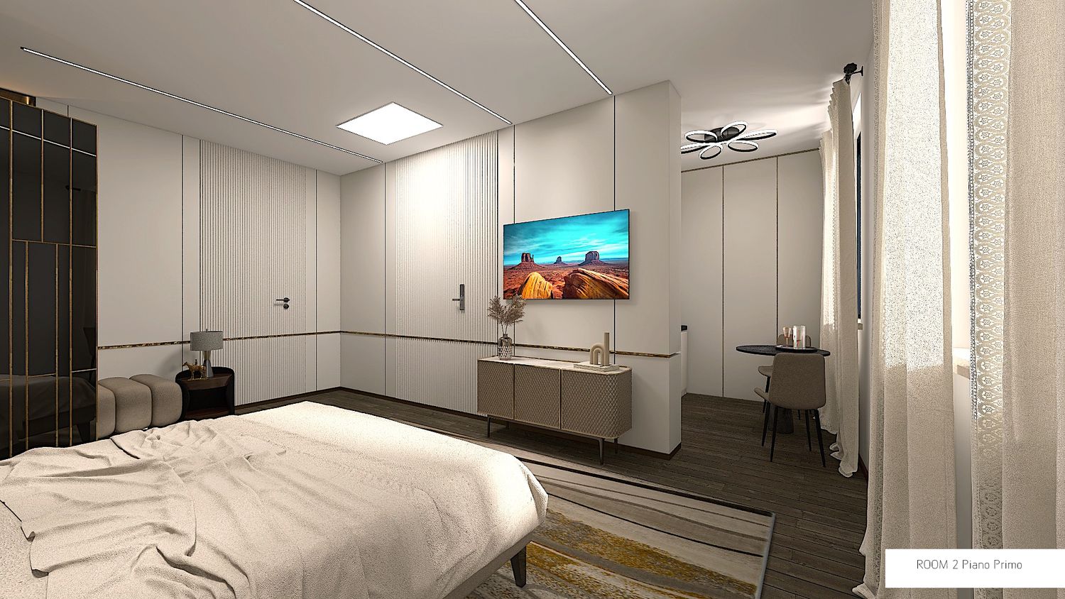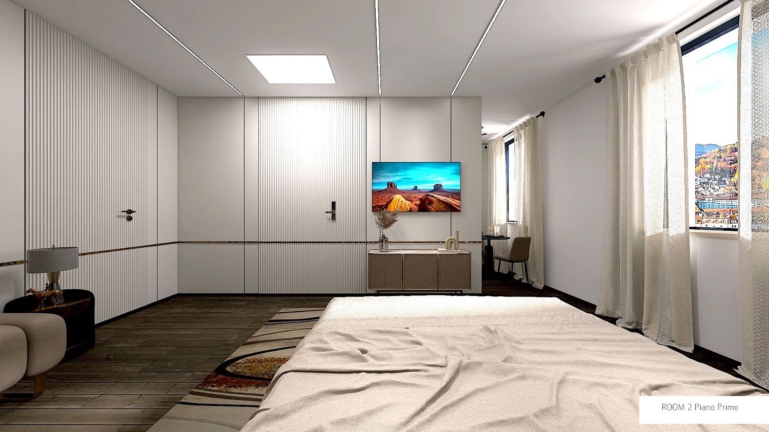 The proposed solution stems from an in-depth initial analysis to understand how to optimize space and make the structure both attractive and comfortable. The new entrance is airy and bright, with a designer staircase extending through the various floors, flanked by a circular elevator that seamlessly connects the levels. Two options are offered for the ground floor, the main difference being access from the plaza or the side street. This floor accommodates the entrance hall, a breakfast/relaxation room, a bedroom with bathroom, and a utility area with a toilet and storage/pantry. The upper floors accommodate four additional bedrooms, each with a private bathroom, all designed to offer the amenities sought after in a structure of this type. Finally, the basement level is being redeveloped to host events such as wine tastings. To emphasize this, circular openings are inserted into the floor of the hall, allowing a direct view of the cellars below. The furnishings are simple and linear, with neutral tones paired with bolder color details to enhance the spaces.