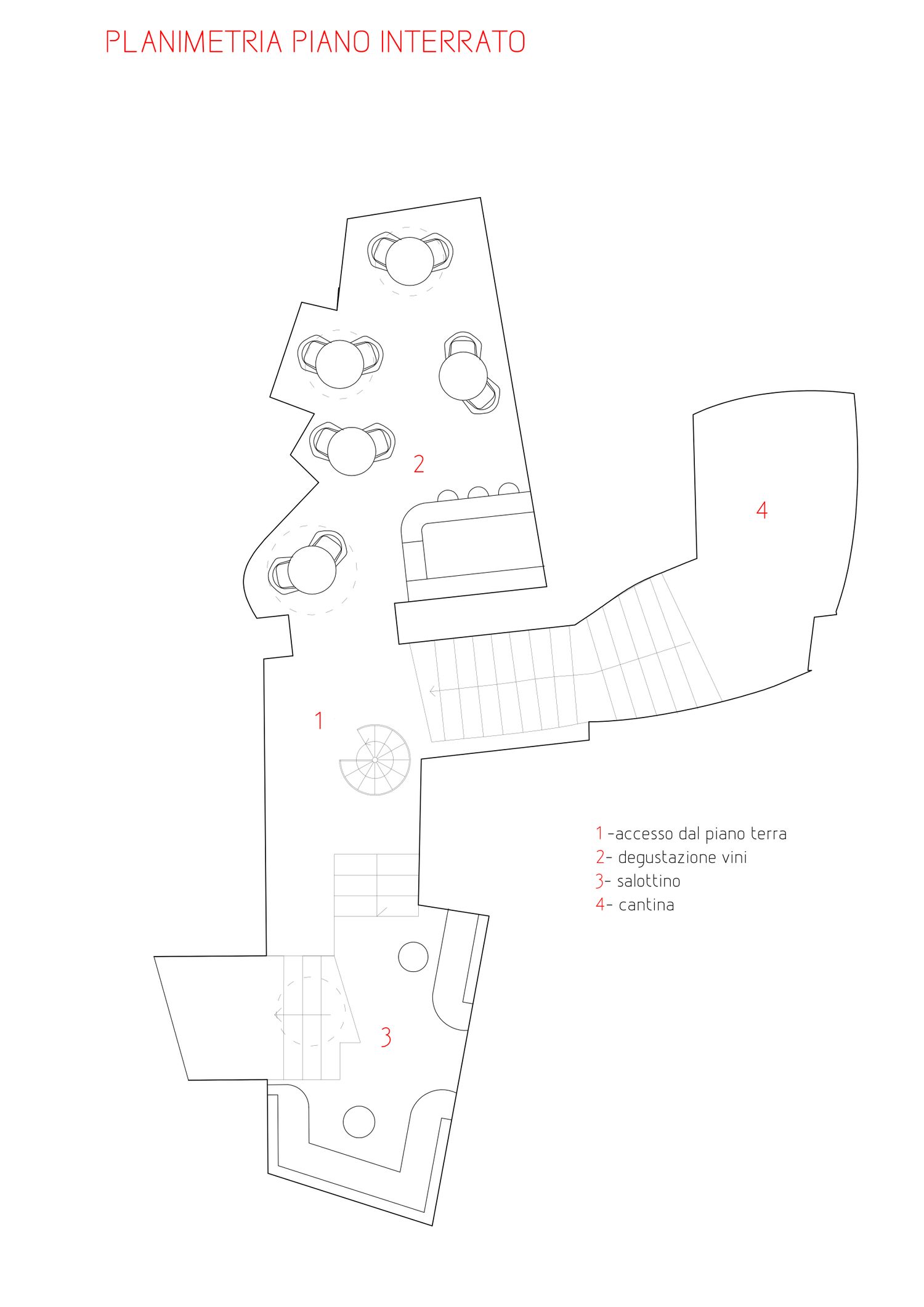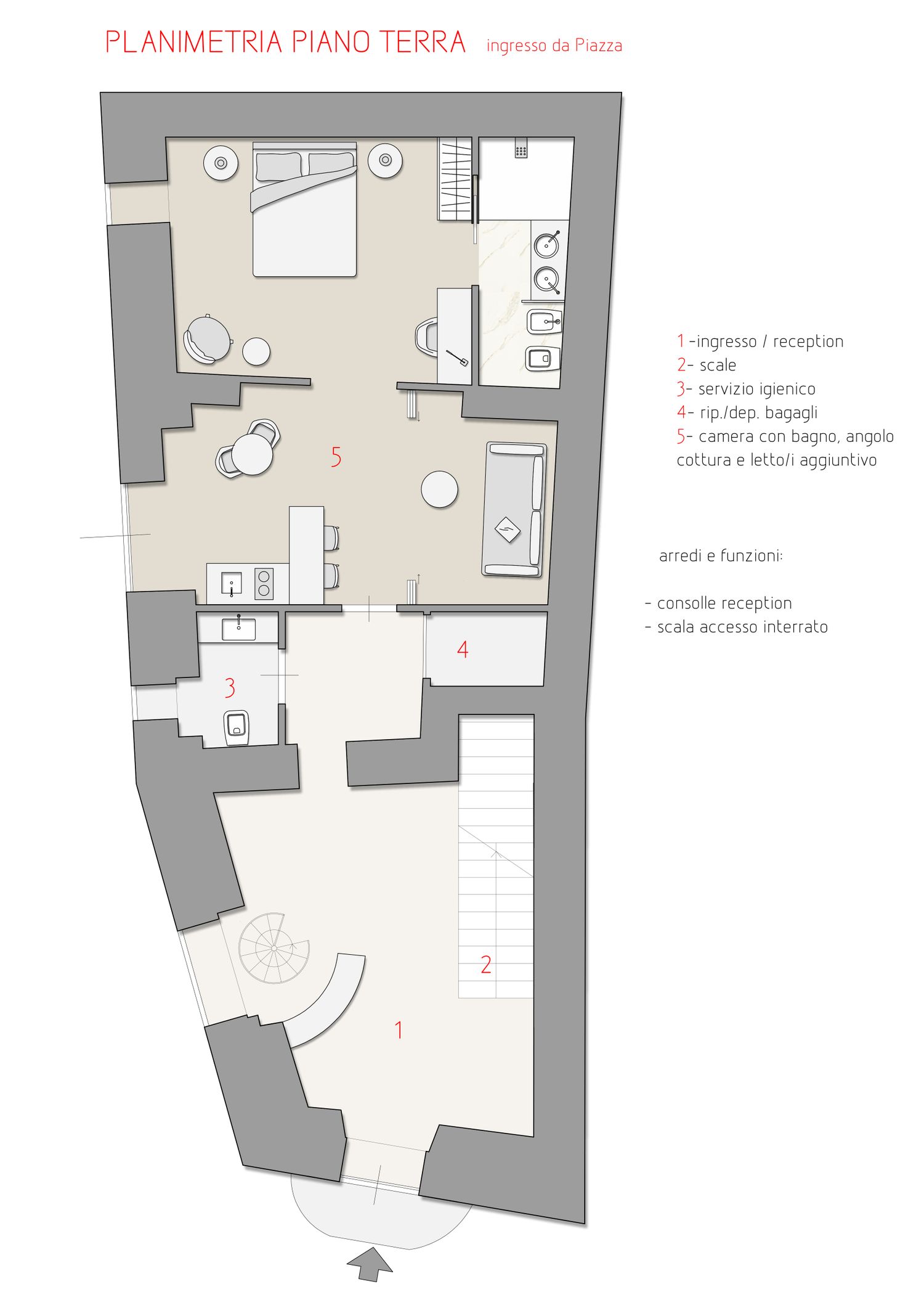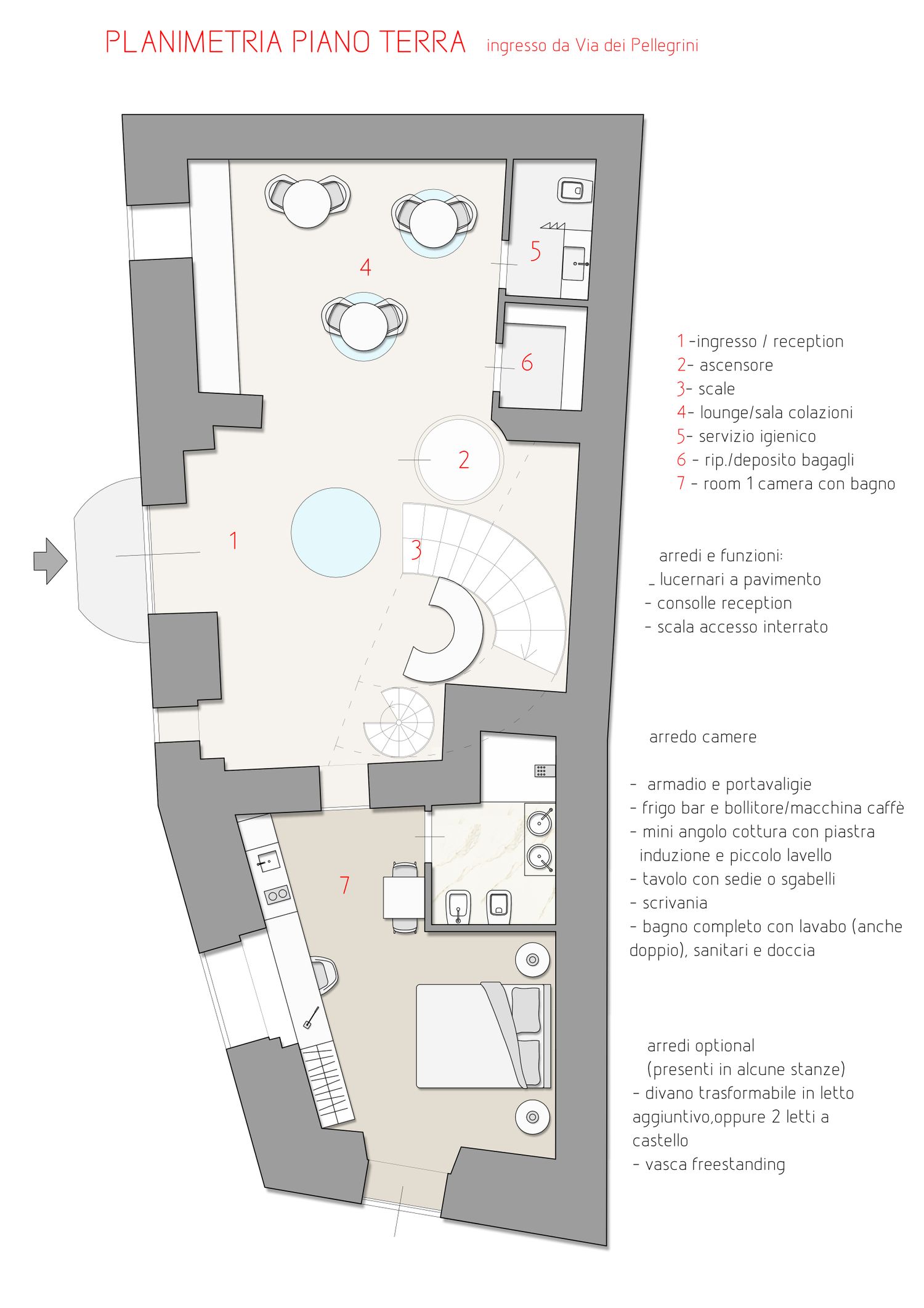 La soluzione presentata nasce da un’approfondita analisi iniziale per capire come ottimizzare gli spazi e rendere accattivante oltre che confortevole l’impatto e la permanenza all’interno della struttura. Il nuovo ingresso si presenta arioso e ben luminoso con una scala di design che si sviluppa sui vari piani e viene affiancata dall’ascensore tondo che collega agilmente i livelli. Per quanto riguarda il piano terra vengono offerte due soluzioni il cui cambiamento principale riguarda l’accesso che può essere dalla piazza oppure dalla strada laterale; a questo piano trovano spazio oltre alla hall d’ingresso, la saletta colazioni / relax, una camera con bagno, e una zona servizio con wc e ripostiglio / dispensa. Ai piani superiori trovano invece spazio altre quattro camere ognuna con bagno privato e tutte studiate per offrire quelli che sono i servizi ricercati in una struttura di questo genere. Infine il piano seminterrato viene riqualificato per ospitare eventi come degustazioni di vini e per enfatizzarlo vengono inseriti come dei fori circolari sul pavimento della hall che permettono una visuale diretta sulle cantine sottostanti. Gli arredi sono semplici e lineari con toni neutri abbinati a dettagli dai colori più marcati così da valorizzare gli ambienti.