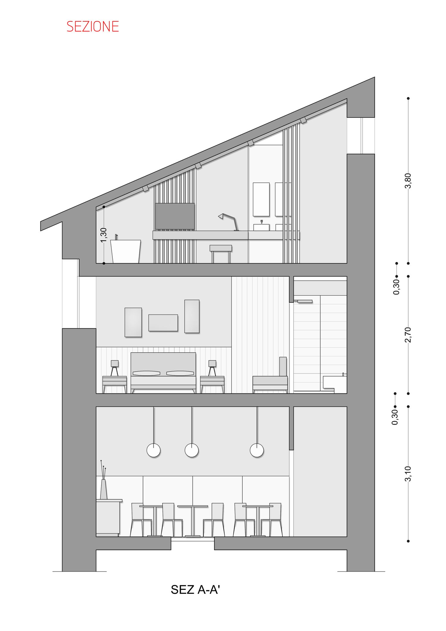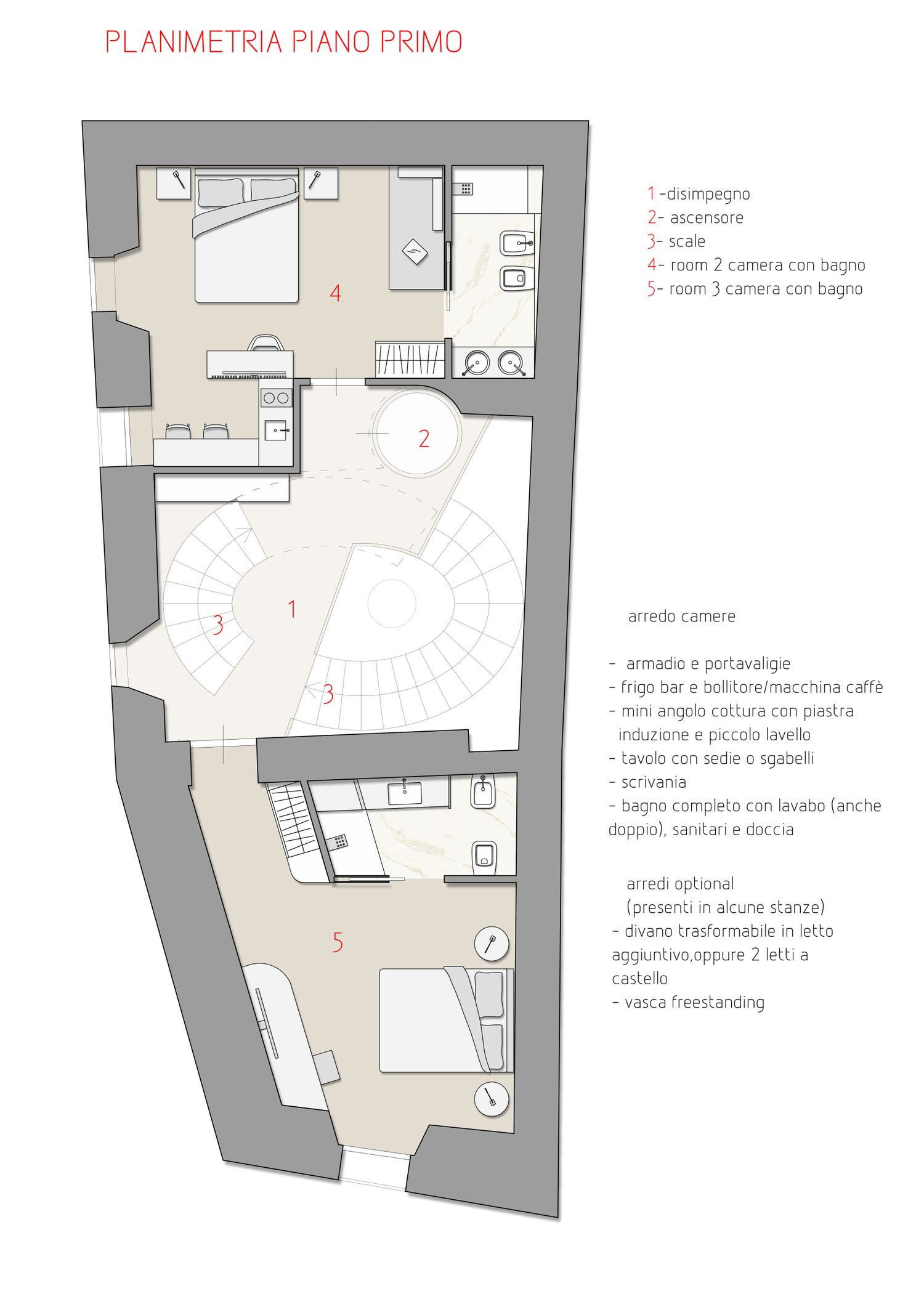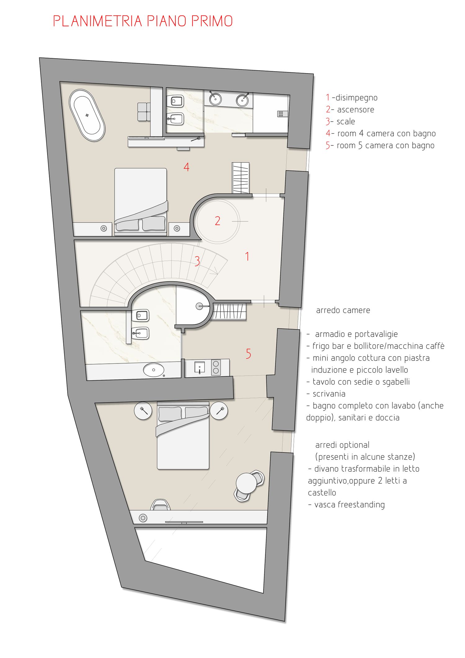 La soluzione presentata nasce da un’approfondita analisi iniziale per capire come ottimizzare gli spazi e rendere accattivante oltre che confortevole l’impatto e la permanenza all’interno della struttura. Il nuovo ingresso si presenta arioso e ben luminoso con una scala di design che si sviluppa sui vari piani e viene affiancata dall’ascensore tondo che collega agilmente i livelli. Per quanto riguarda il piano terra vengono offerte due soluzioni il cui cambiamento principale riguarda l’accesso che può essere dalla piazza oppure dalla strada laterale; a questo piano trovano spazio oltre alla hall d’ingresso, la saletta colazioni / relax, una camera con bagno, e una zona servizio con wc e ripostiglio / dispensa. Ai piani superiori trovano invece spazio altre quattro camere ognuna con bagno privato e tutte studiate per offrire quelli che sono i servizi ricercati in una struttura di questo genere. Infine il piano seminterrato viene riqualificato per ospitare eventi come degustazioni di vini e per enfatizzarlo vengono inseriti come dei fori circolari sul pavimento della hall che permettono una visuale diretta sulle cantine sottostanti. Gli arredi sono semplici e lineari con toni neutri abbinati a dettagli dai colori più marcati così da valorizzare gli ambienti.