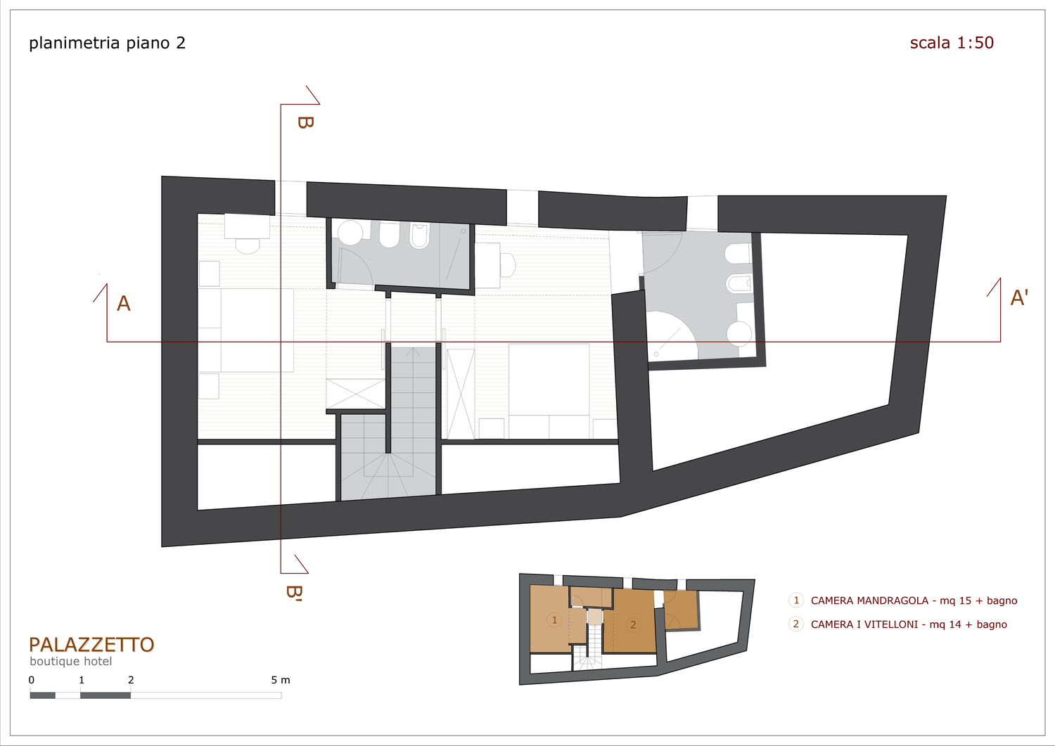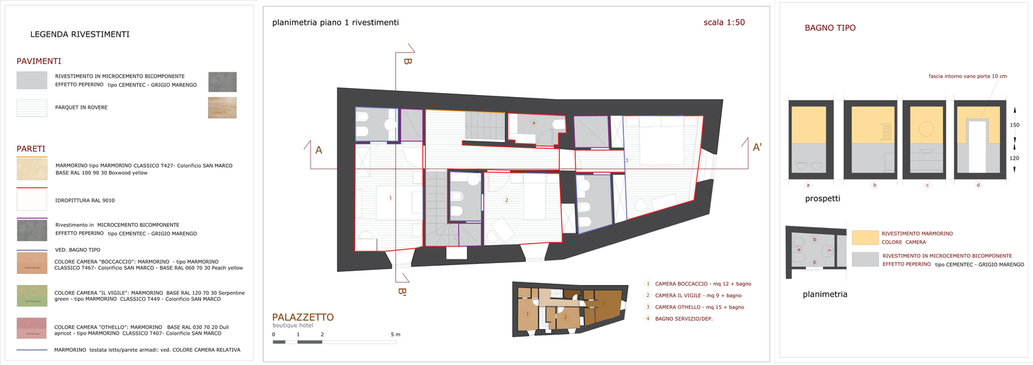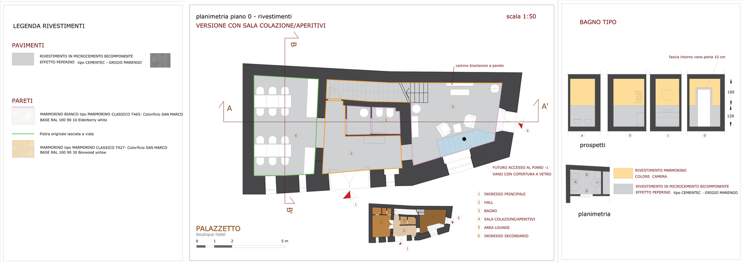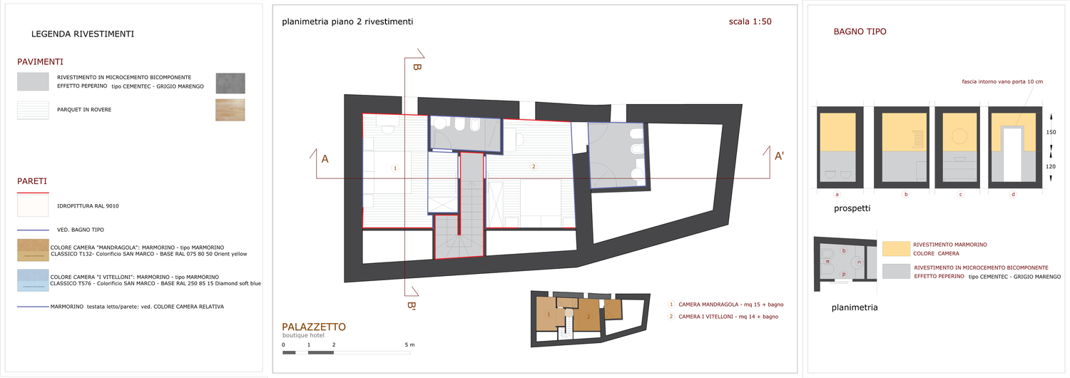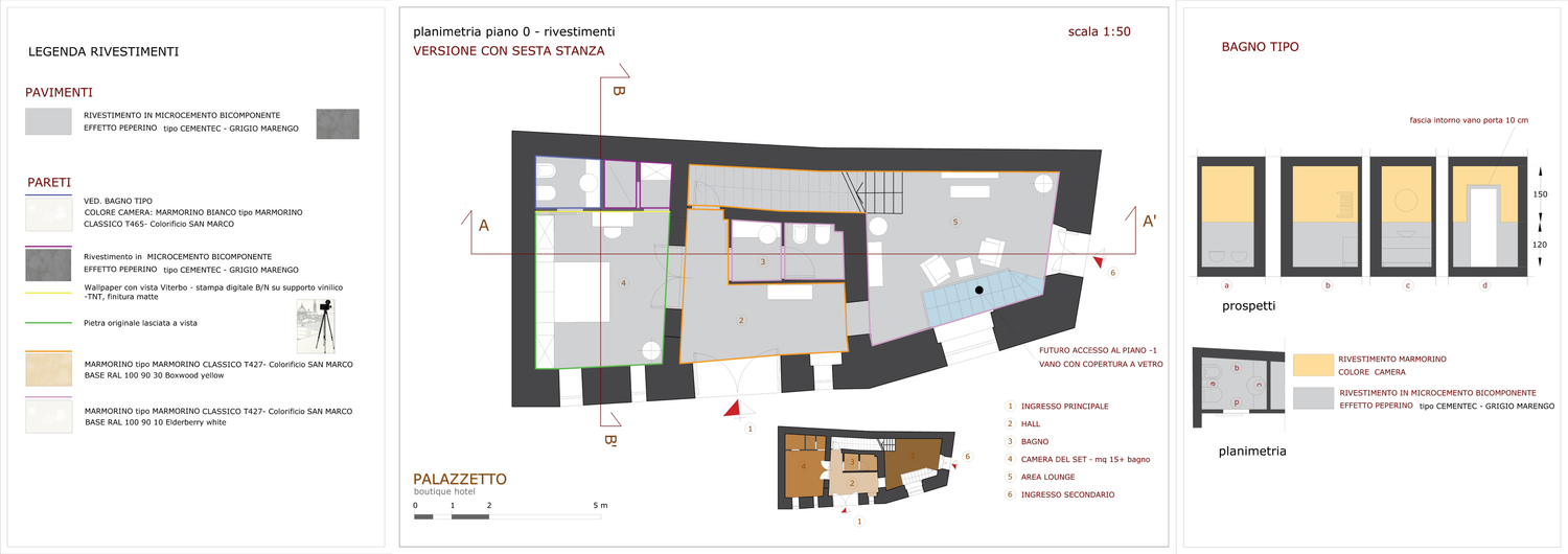 Il progetto dell’Hotel Boutique "Palazzetto" si sviluppa intorno a due temi guida: il territorio locale, inteso come identità storica e materica della città di Viterbo, e il cinema, elemento suggerito dalla committenza come caratterizzazione distintiva della struttura.