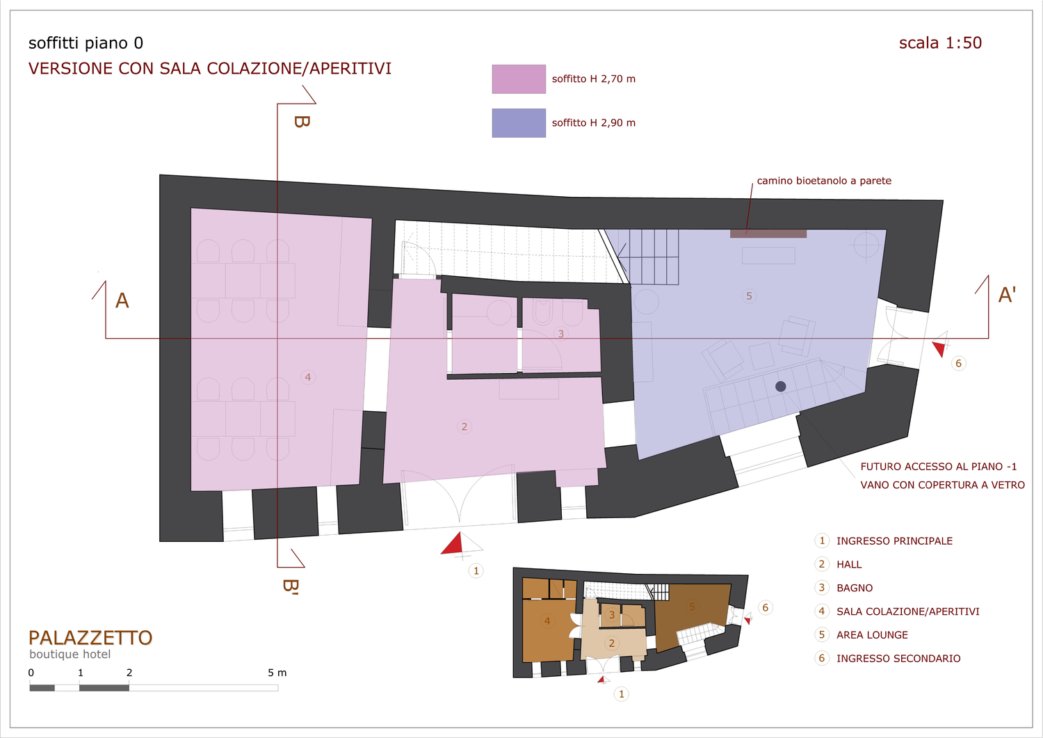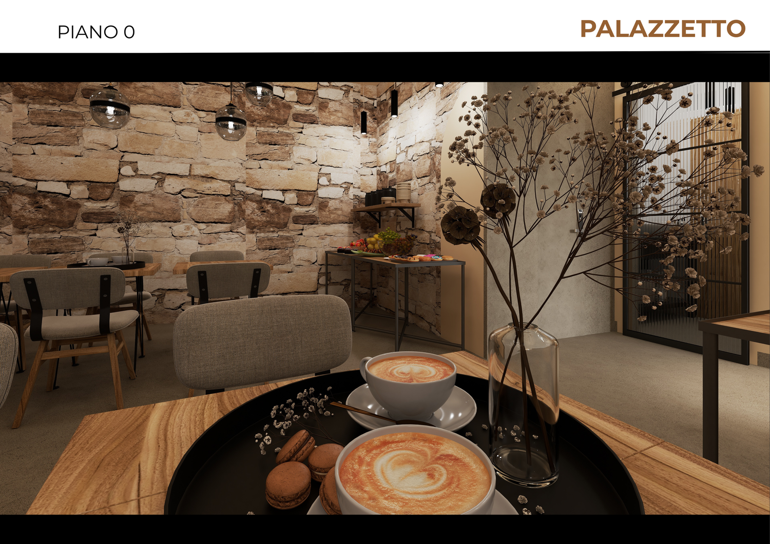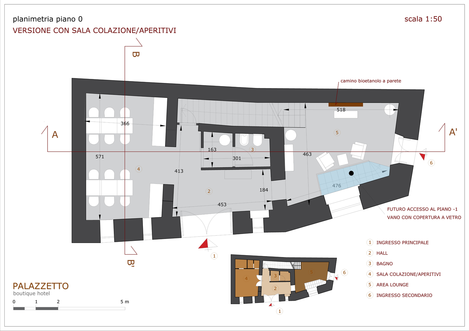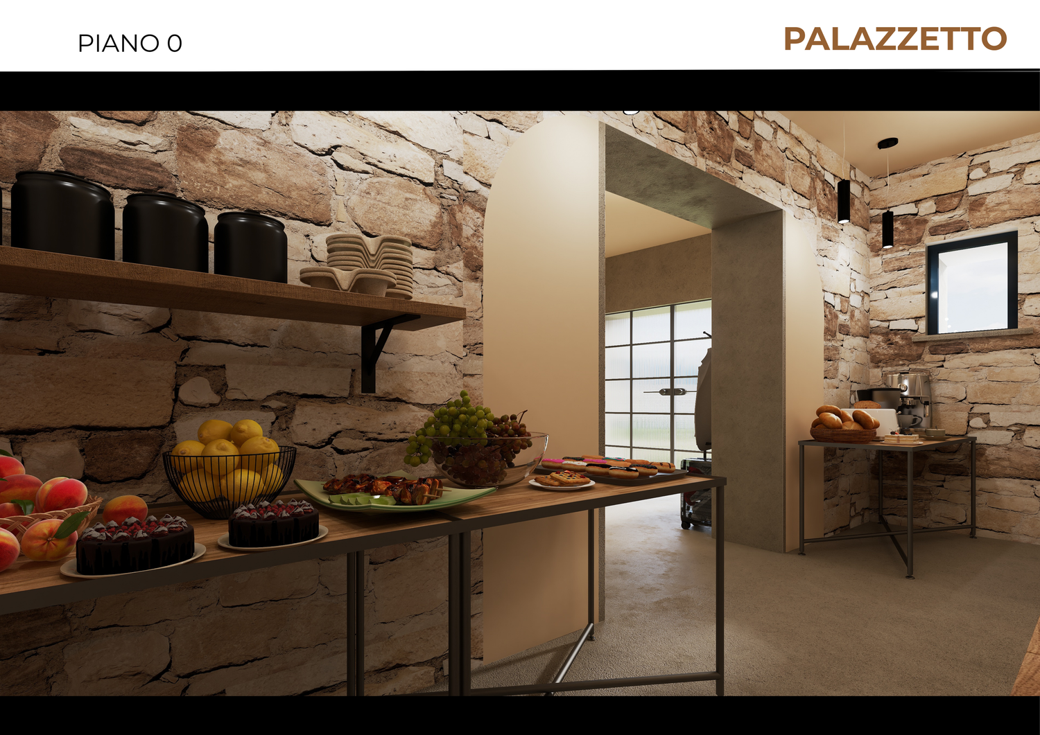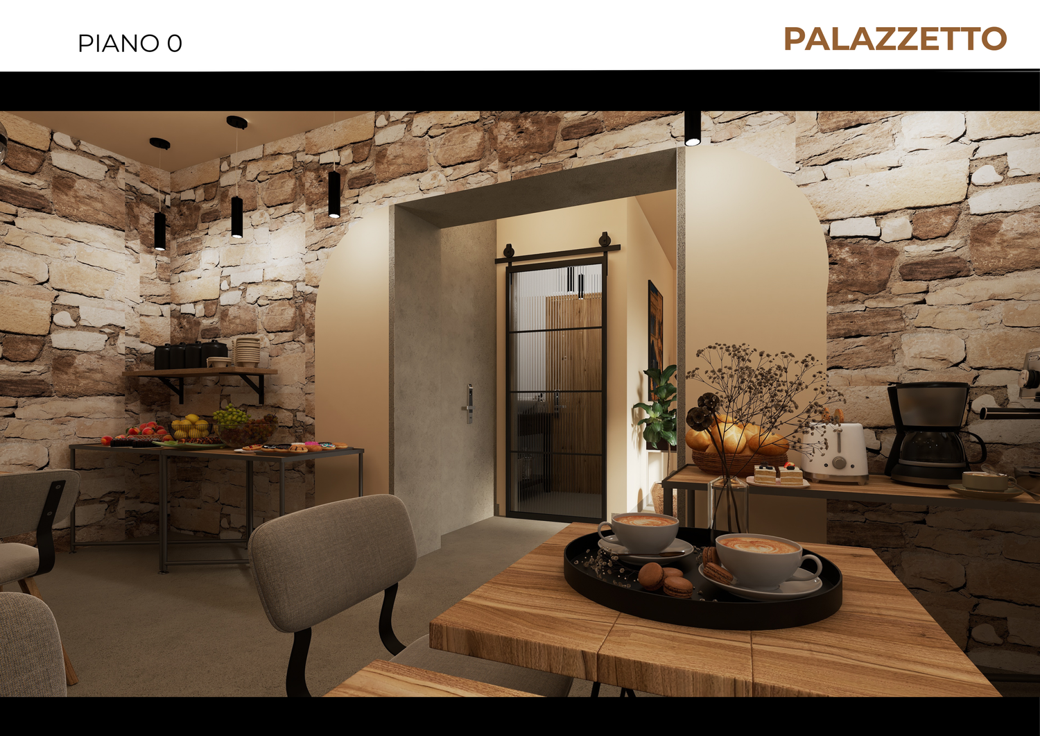 1. Sala colazioni convertibile in wine bar, aperto anche ai non ospiti per incrementare flussi e visibilità;