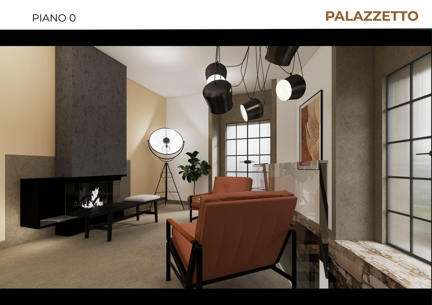 • area lounge con biocamino e accesso alla scala che porta al piano superiore, mantenuta nella posizione originaria.