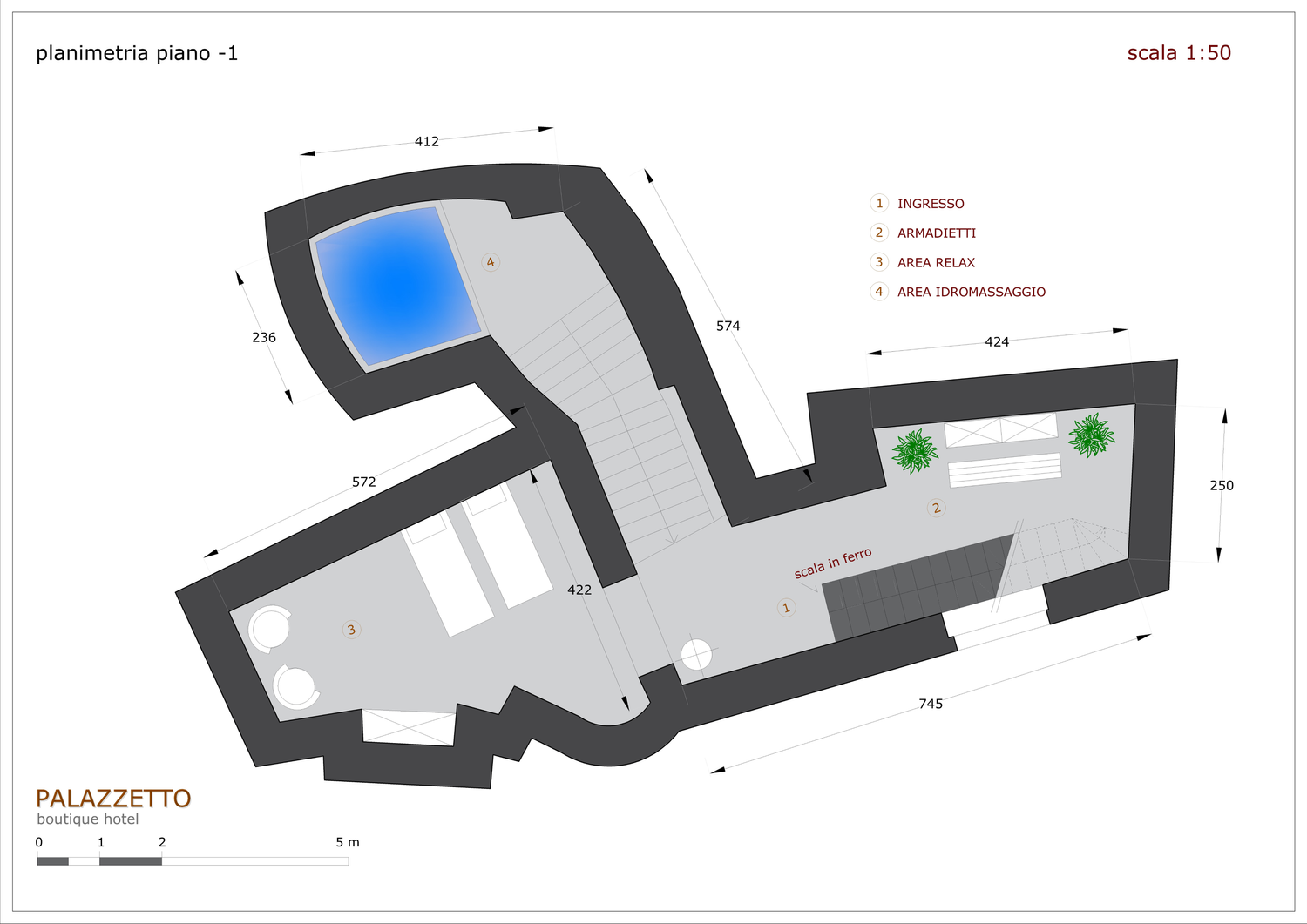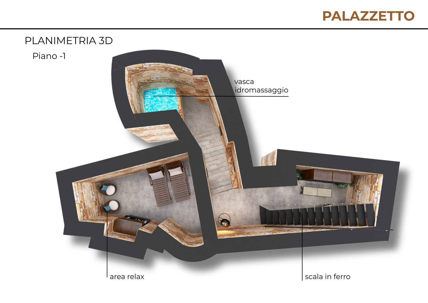 La committenza non ha richiesto una progettazione definitiva per questo livello; tuttavia è stata proposta (solo a livello planimetrico) una futura destinazione d’uso come piccola SPA, comprensiva di area relax e vasca idromassaggio.