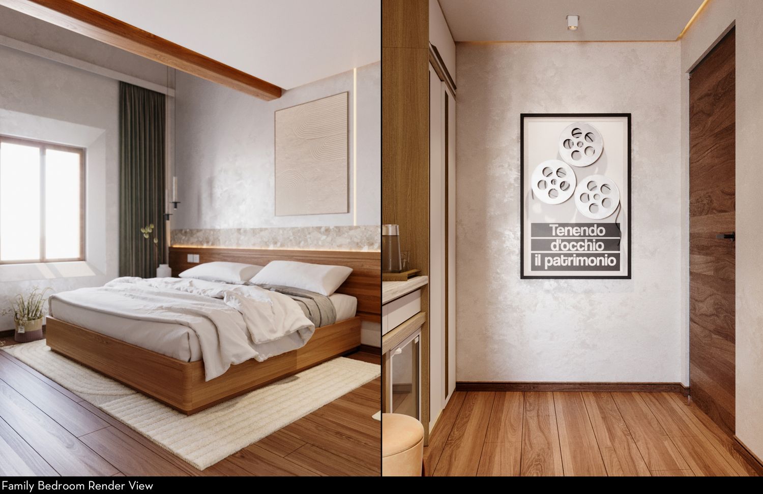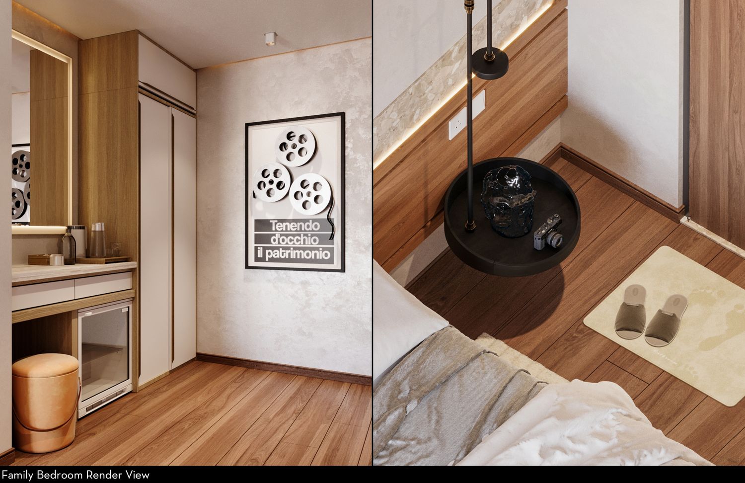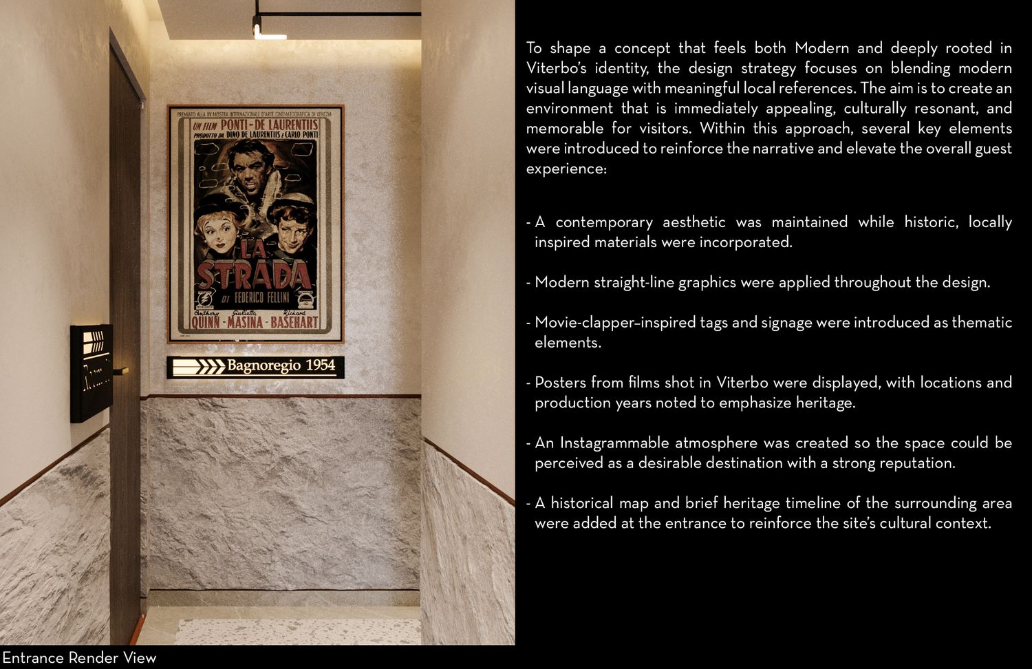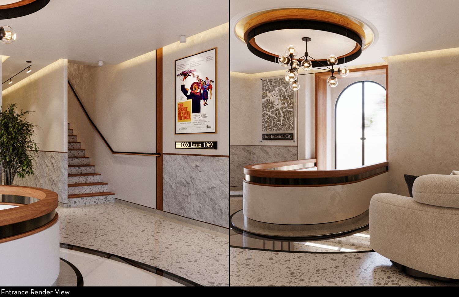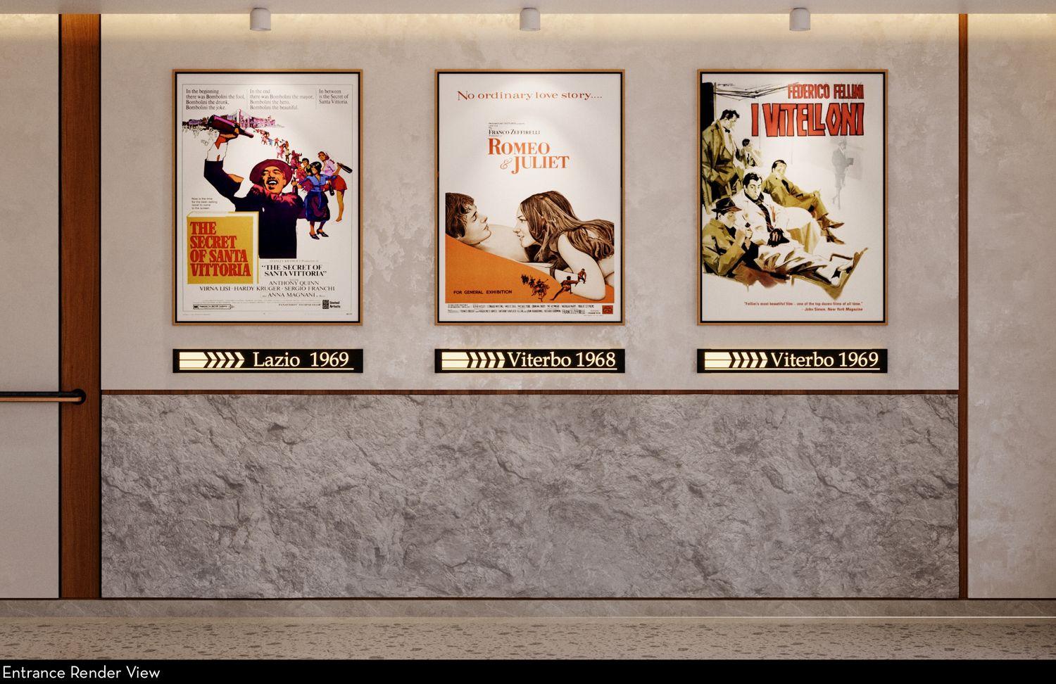 A modern visual language was maintained throughout the project, using straight-line graphics, calm finishes, and materials inspired by local heritage. Subtle cinematic elements were integrated, including movie clapper tags, directional signage, and curated posters from films shot in Viterbo. These elements reflect the client's connection to the film industry and give the space a recognizable identity.