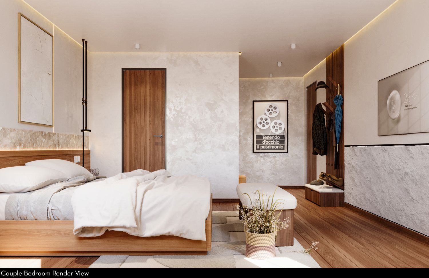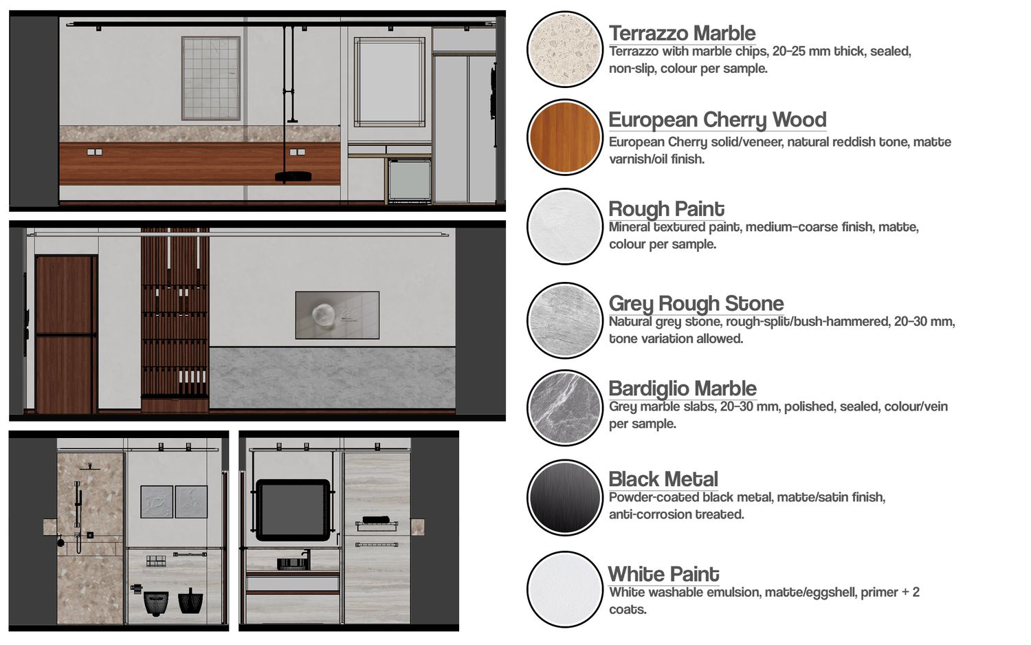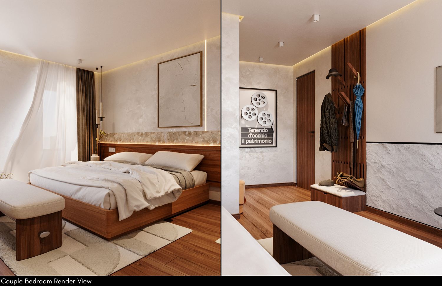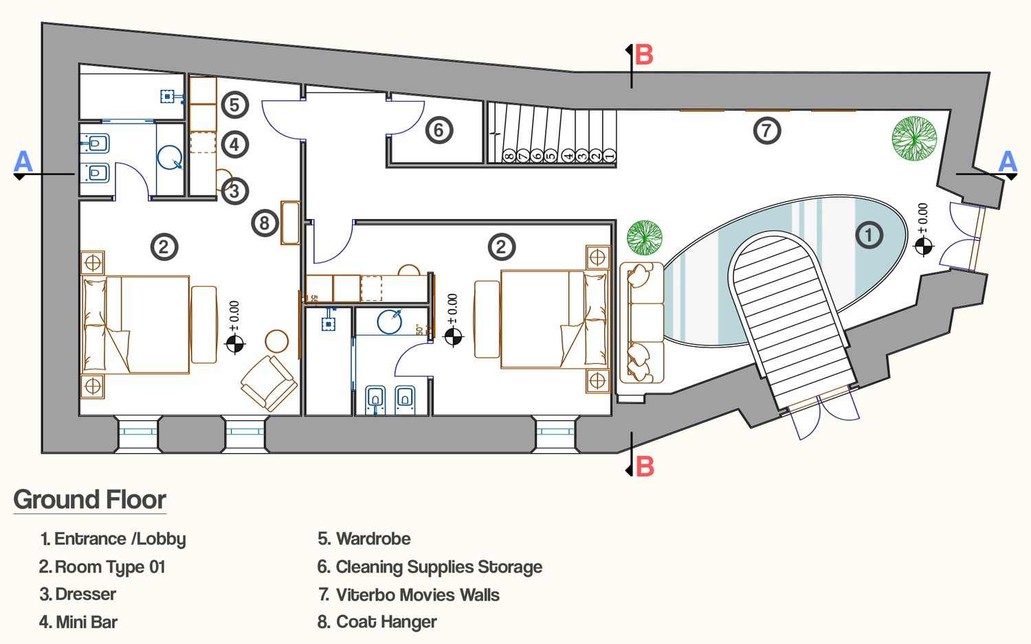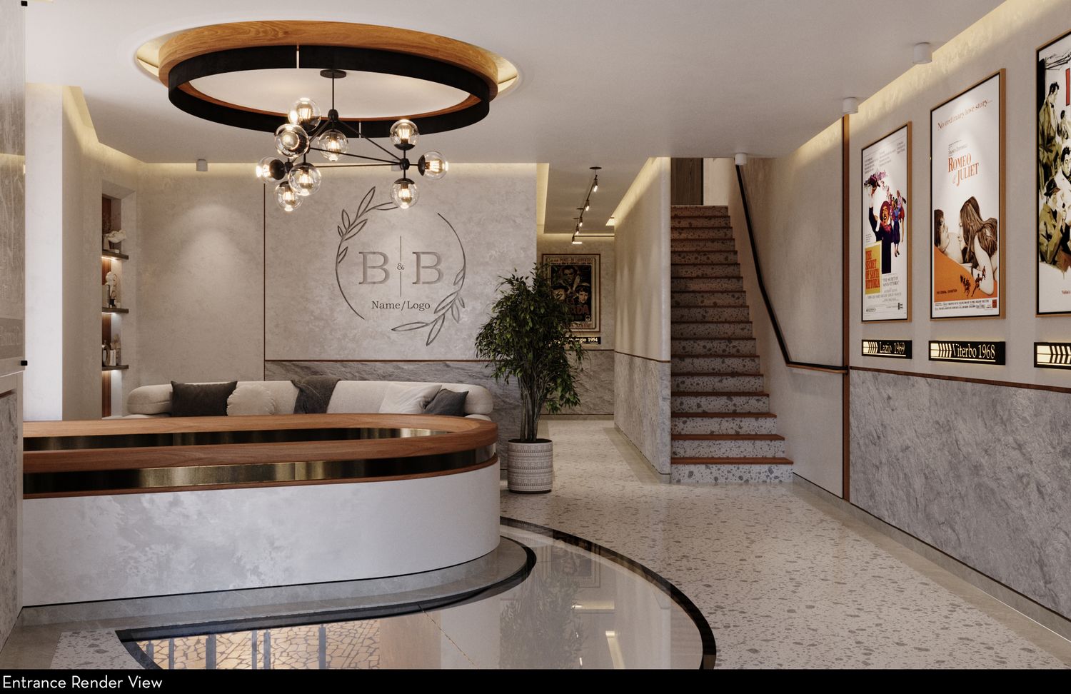 A modern visual language was maintained throughout the project, using straight-line graphics, calm finishes, and materials inspired by local heritage. Subtle cinematic elements were integrated, including movie clapper tags, directional signage, and curated posters from films shot in Viterbo. These elements reflect the client's connection to the film industry and give the space a recognizable identity.