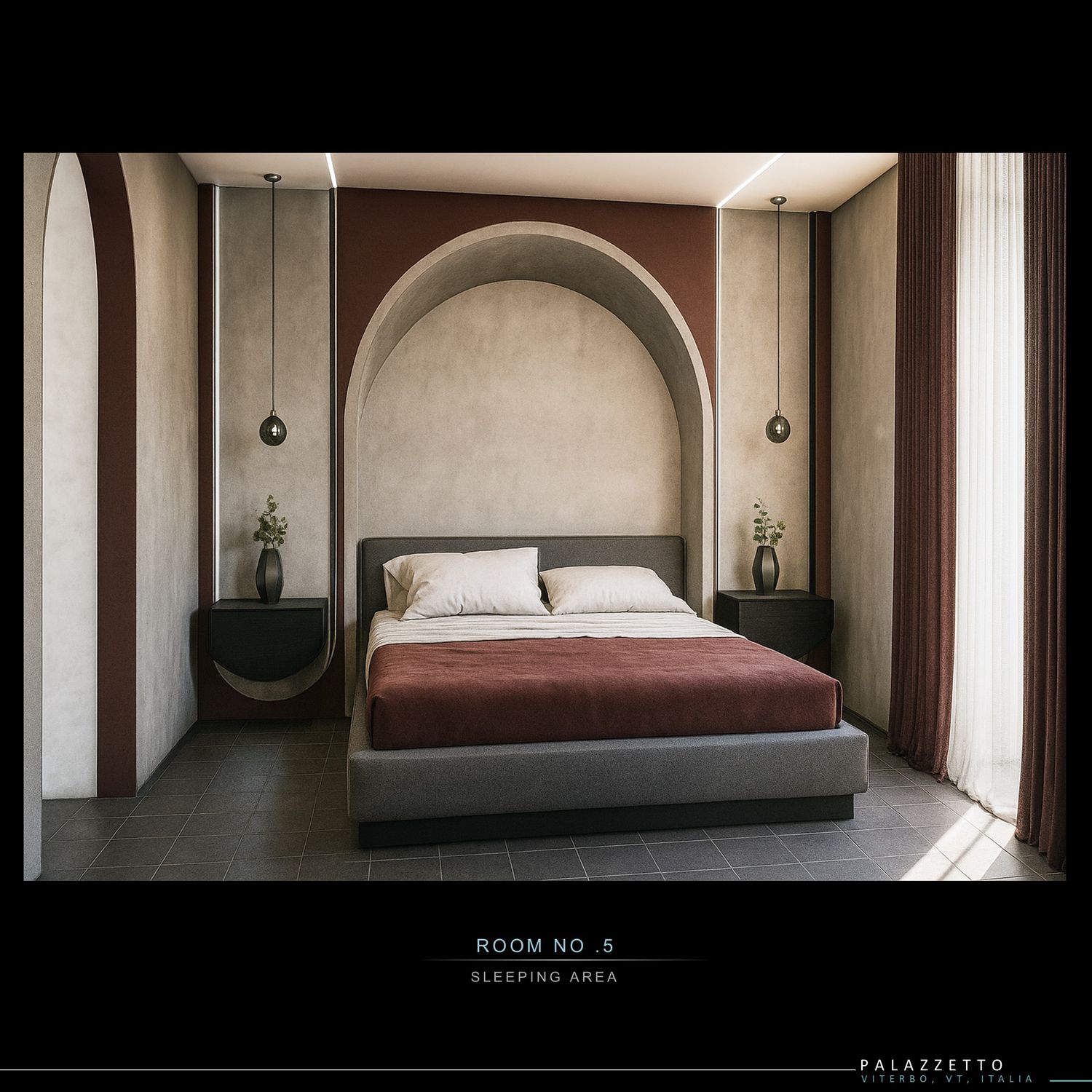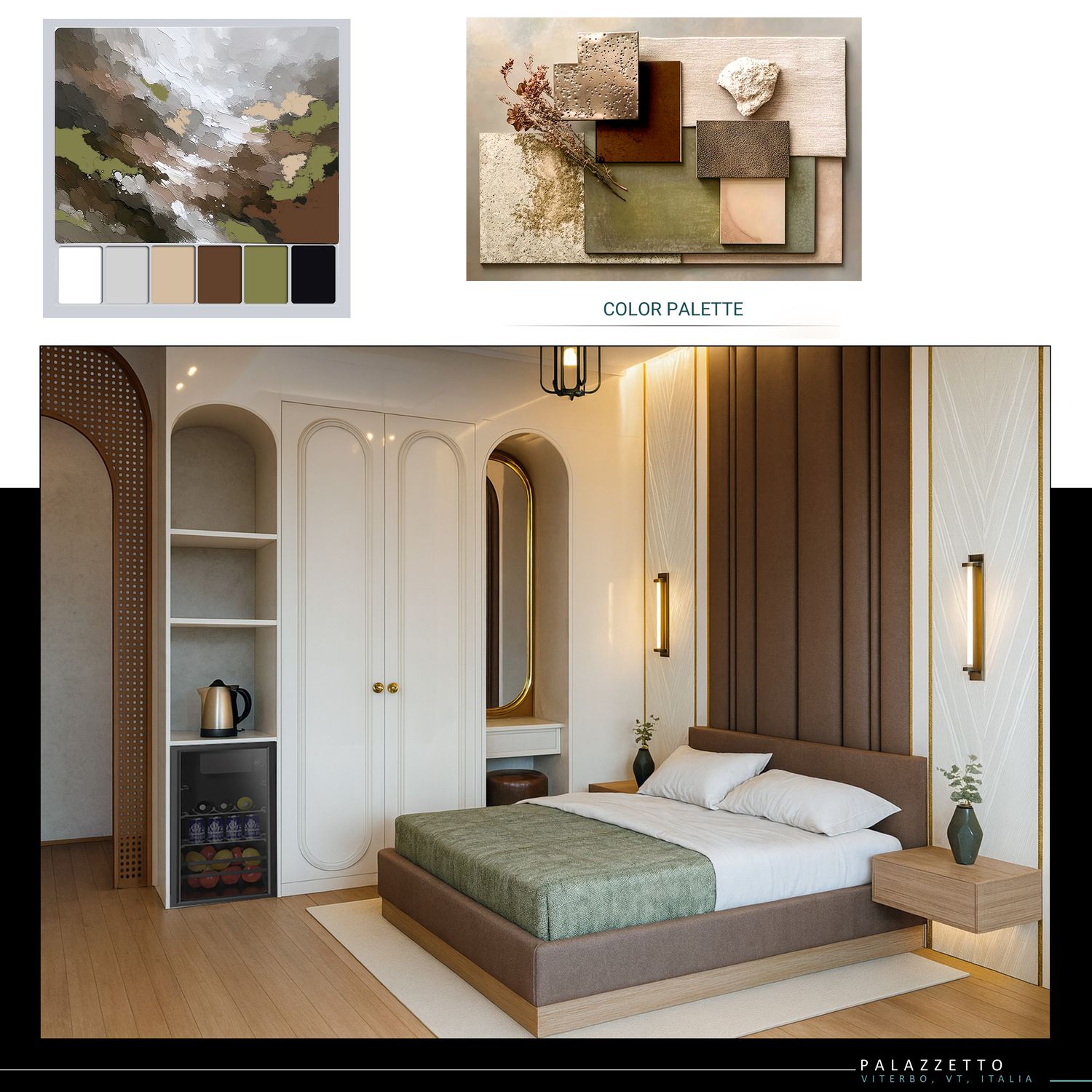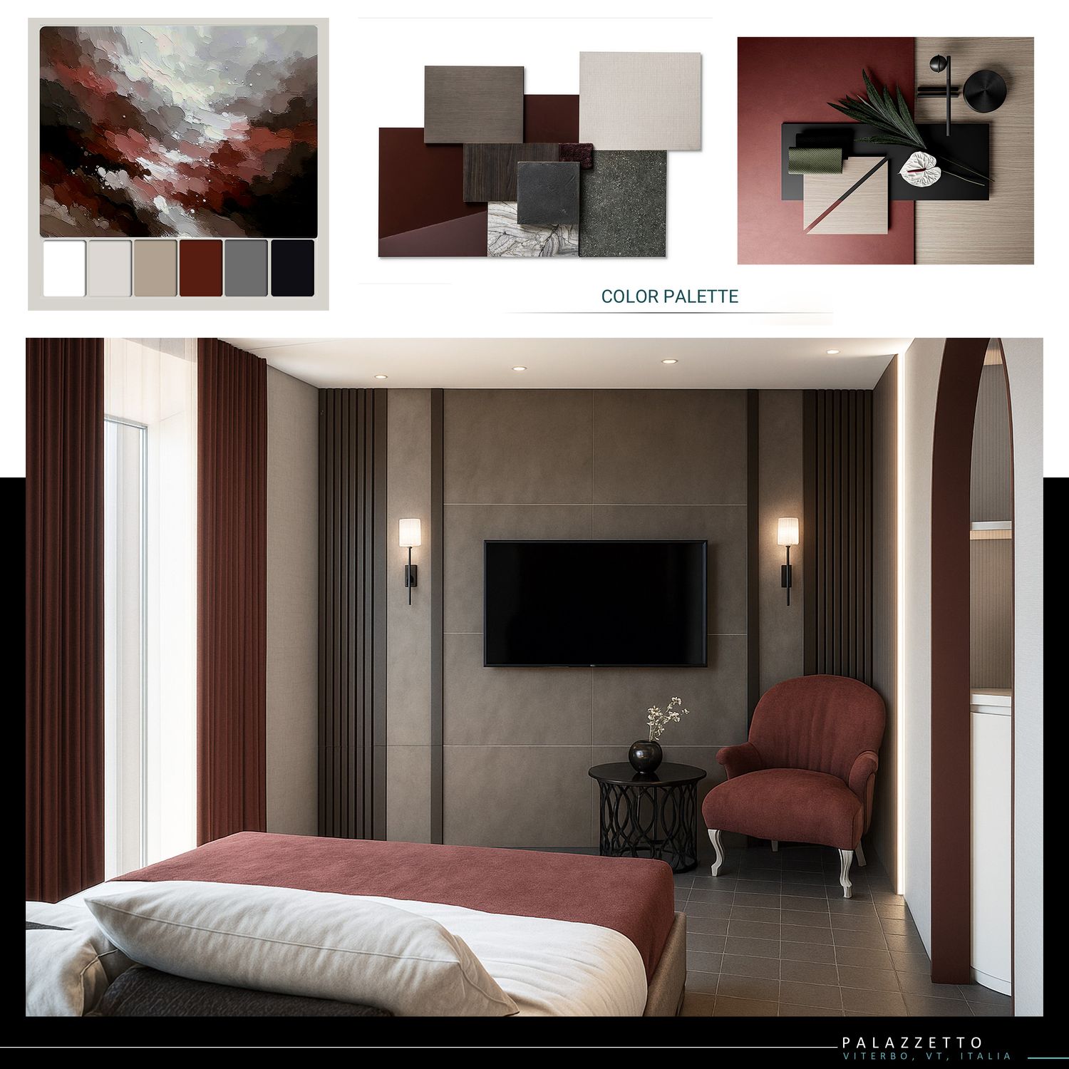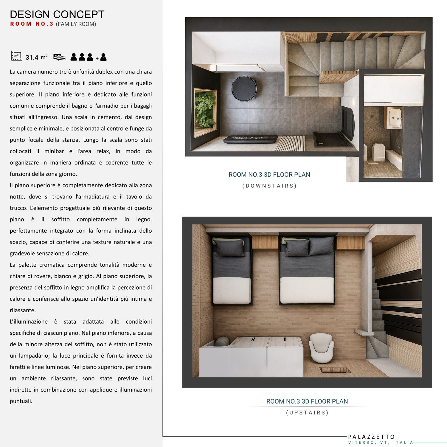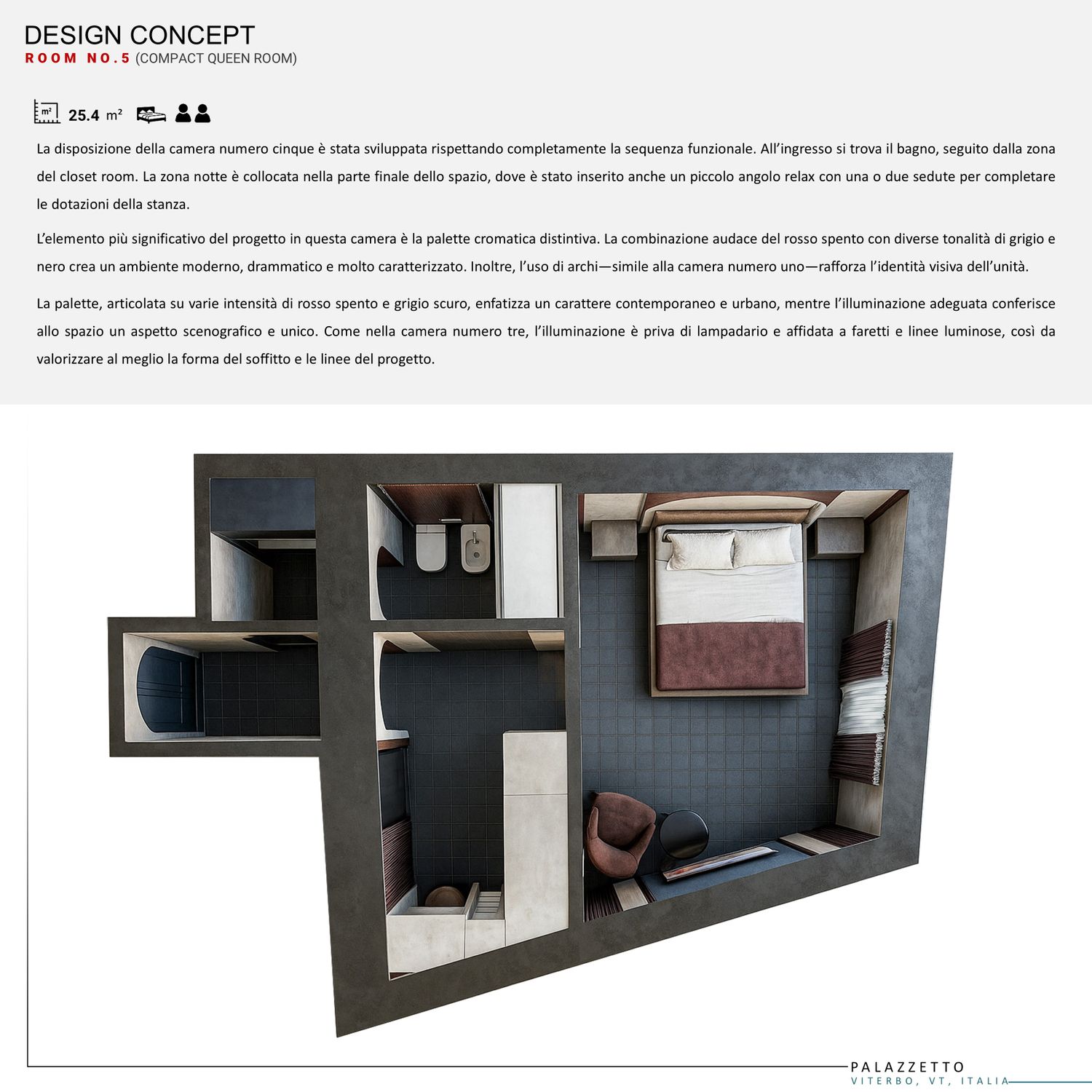 La proposta presentata è il risultato di un processo approfondito, coerente e basato sulla ricerca, sull’aderenza agli standard e sul pieno rispetto del contesto storico del sito. Il progetto comprende cinque unità ricettive caratterizzate da diversità funzionale ed estetica, una lobby progettata in funzione delle esigenze attuali e future, e soluzioni pratiche per l’utilizzo del piano interrato — il tutto sviluppato con un approccio che integra funzionalità, identità del marchio e strategie di marketing sostenibile.