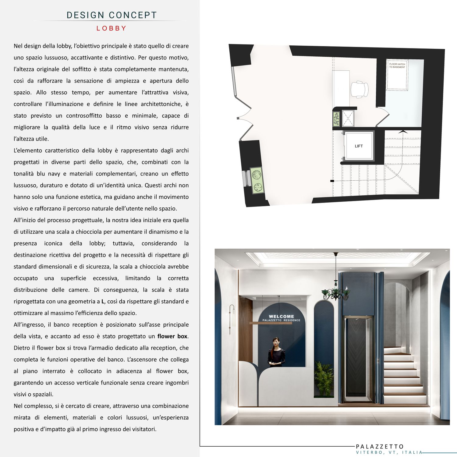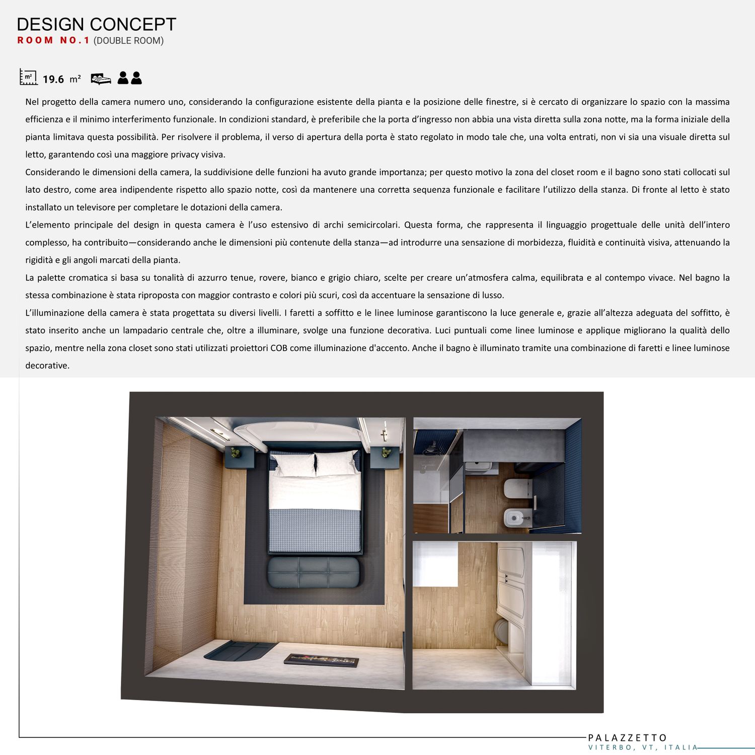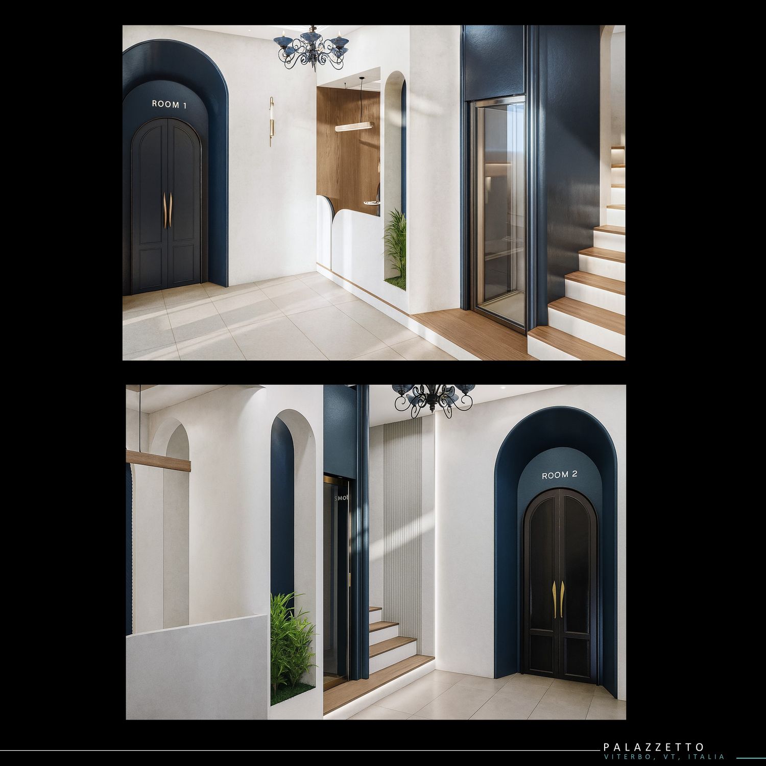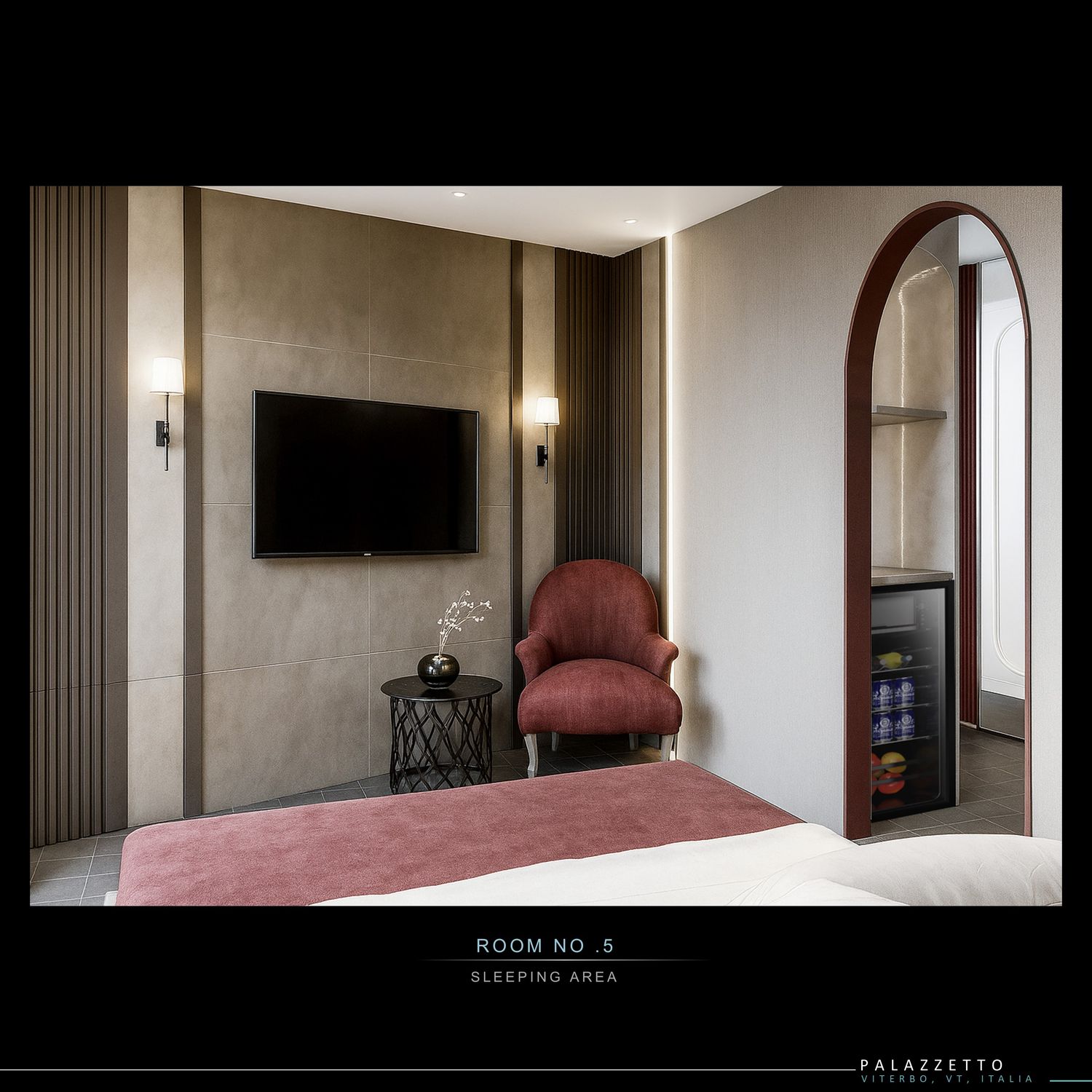 La proposta presentata è il risultato di un processo approfondito, coerente e basato sulla ricerca, sull’aderenza agli standard e sul pieno rispetto del contesto storico del sito. Il progetto comprende cinque unità ricettive caratterizzate da diversità funzionale ed estetica, una lobby progettata in funzione delle esigenze attuali e future, e soluzioni pratiche per l’utilizzo del piano interrato — il tutto sviluppato con un approccio che integra funzionalità, identità del marchio e strategie di marketing sostenibile.