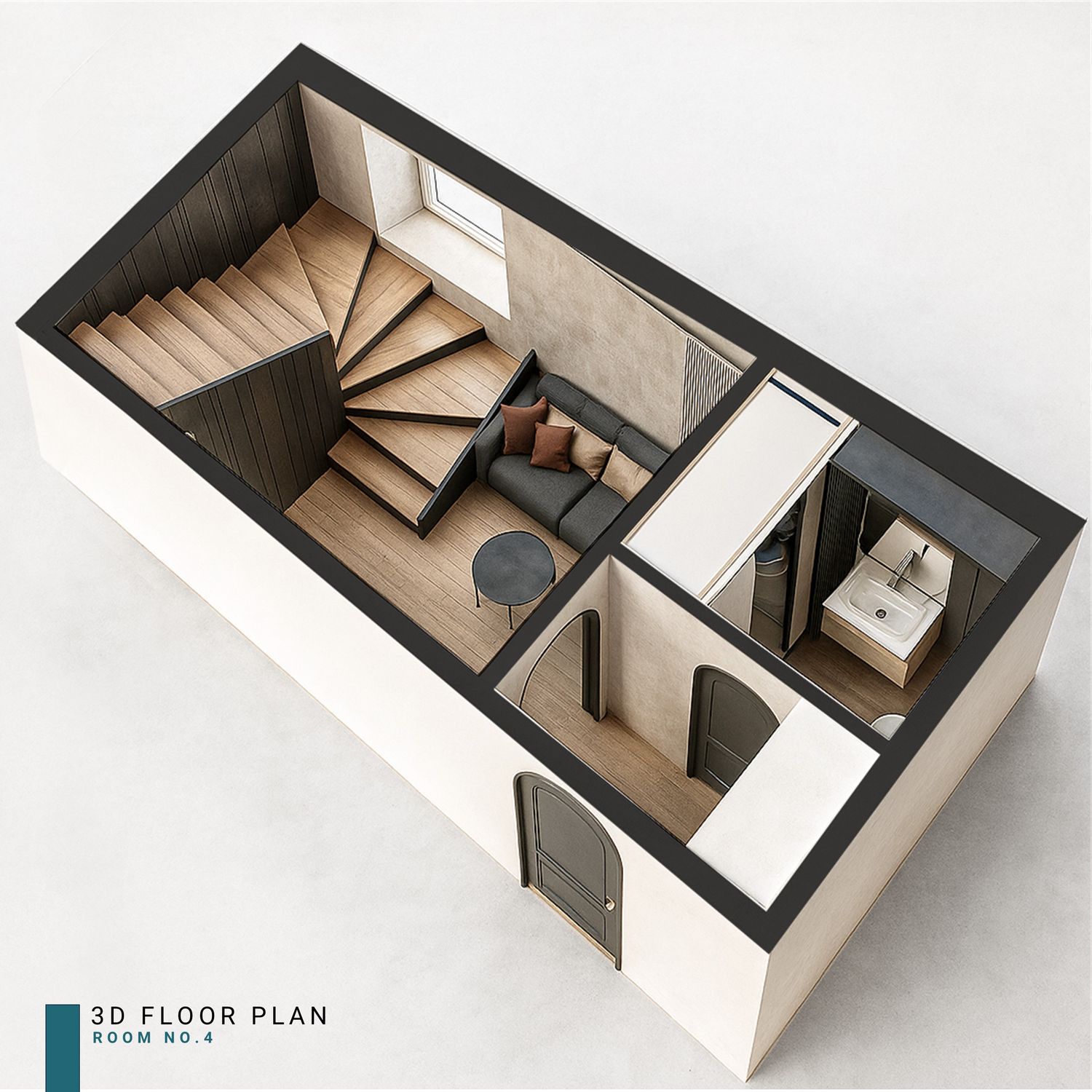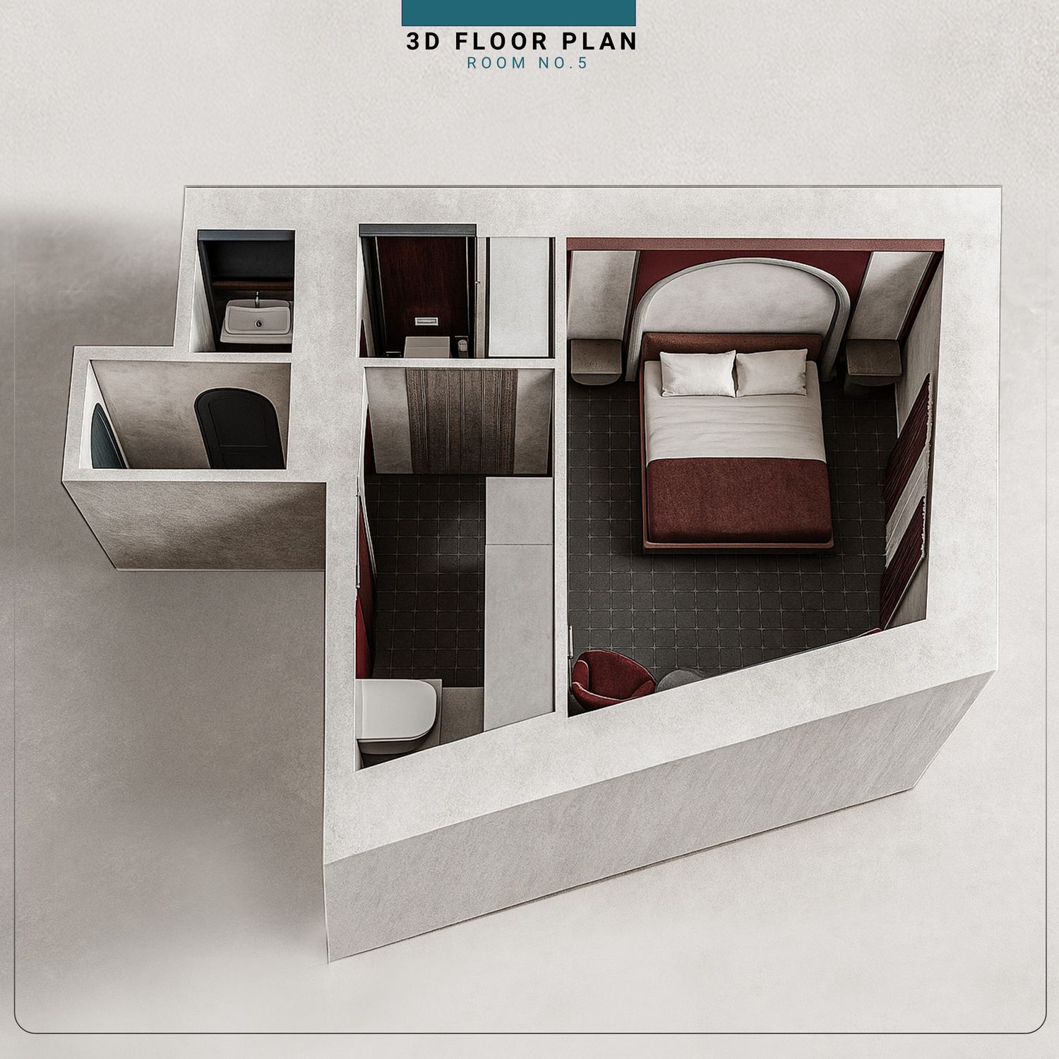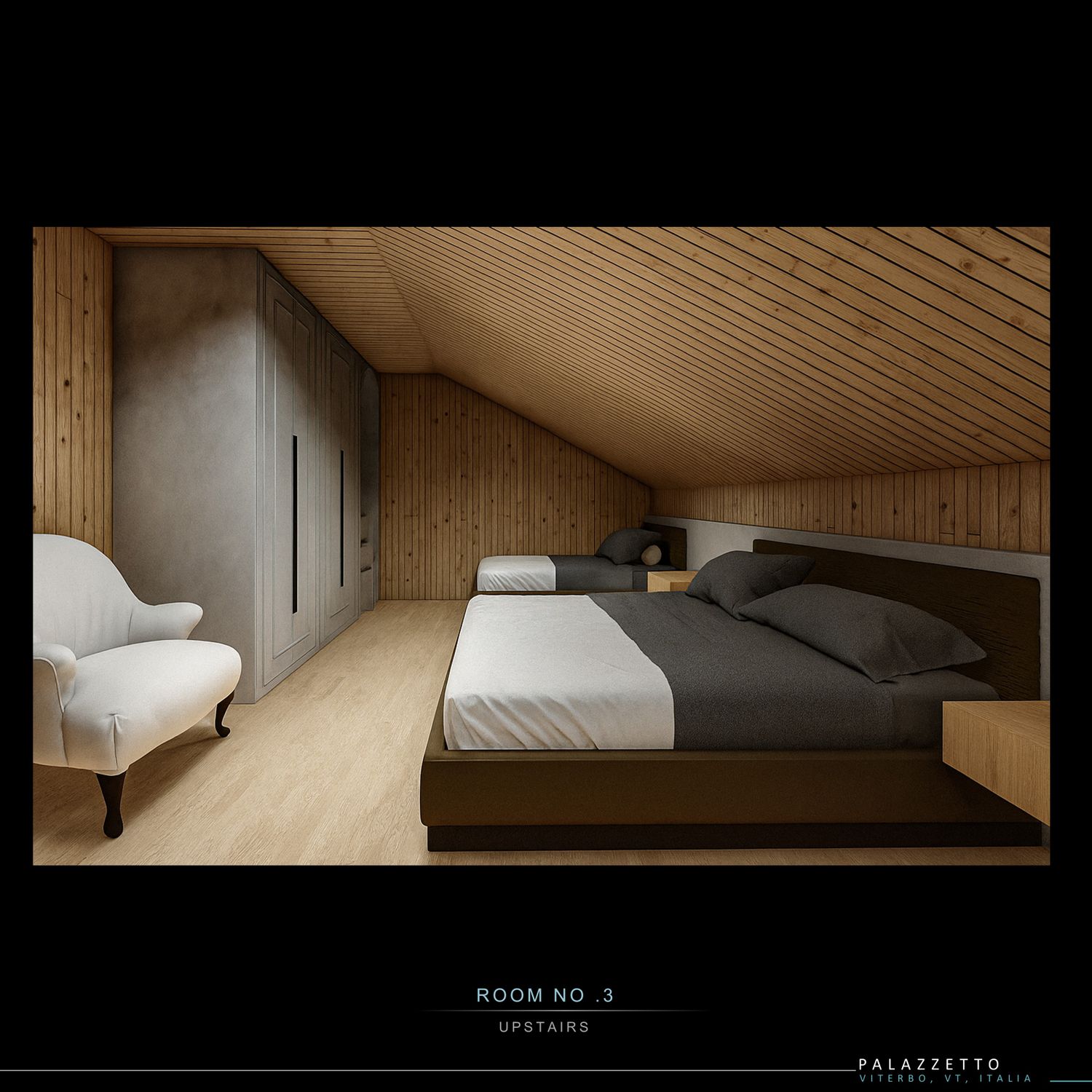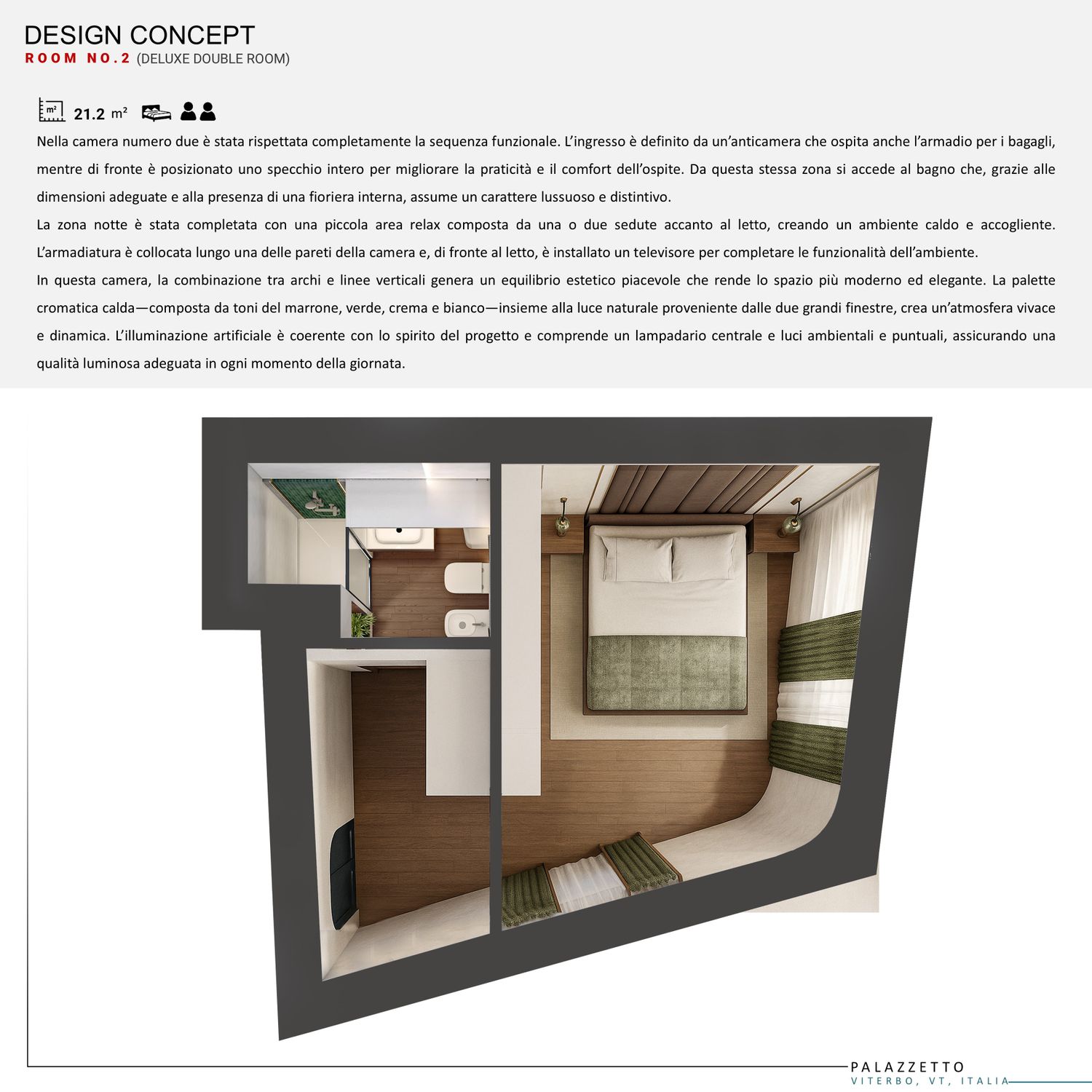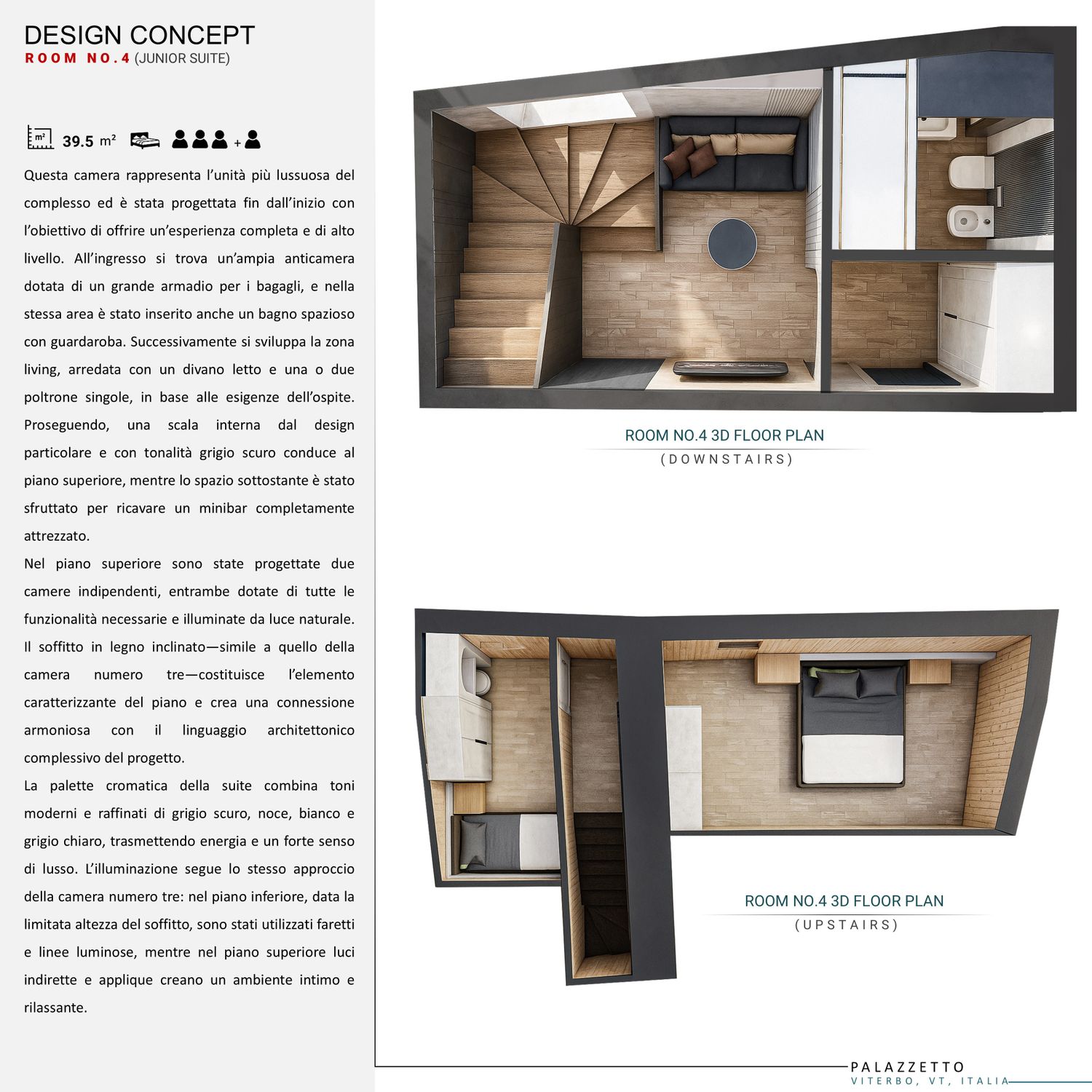 La proposta presentata è il risultato di un processo approfondito, coerente e basato sulla ricerca, sull’aderenza agli standard e sul pieno rispetto del contesto storico del sito. Il progetto comprende cinque unità ricettive caratterizzate da diversità funzionale ed estetica, una lobby progettata in funzione delle esigenze attuali e future, e soluzioni pratiche per l’utilizzo del piano interrato — il tutto sviluppato con un approccio che integra funzionalità, identità del marchio e strategie di marketing sostenibile.