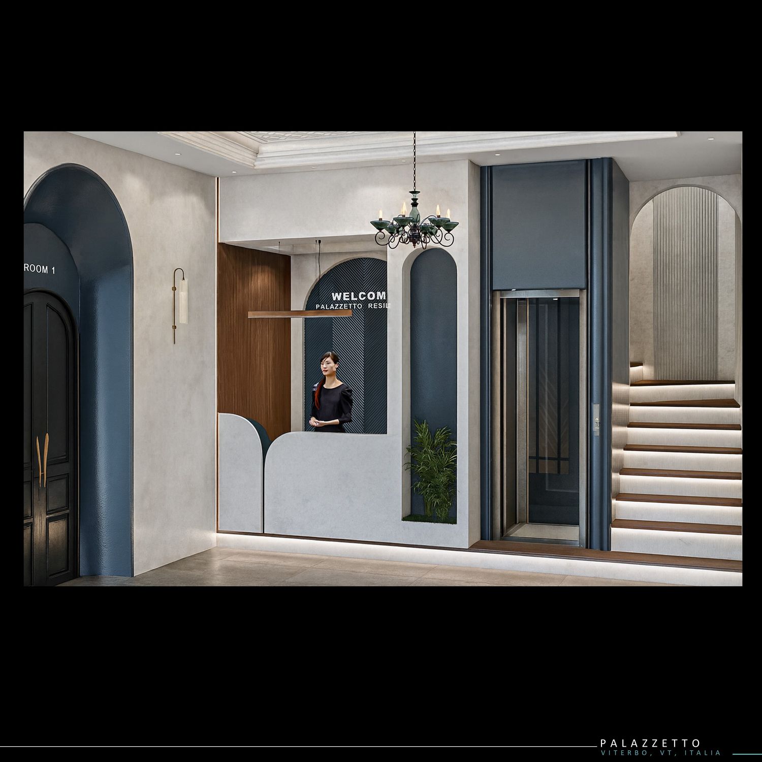 Il team ha quindi pianificato in modo che il percorso di ingresso, il banco reception, gli elementi visivi e la geometria dello spazio siano perfettamente allineati agli standard alberghieri e alle esigenze operative future della struttura.