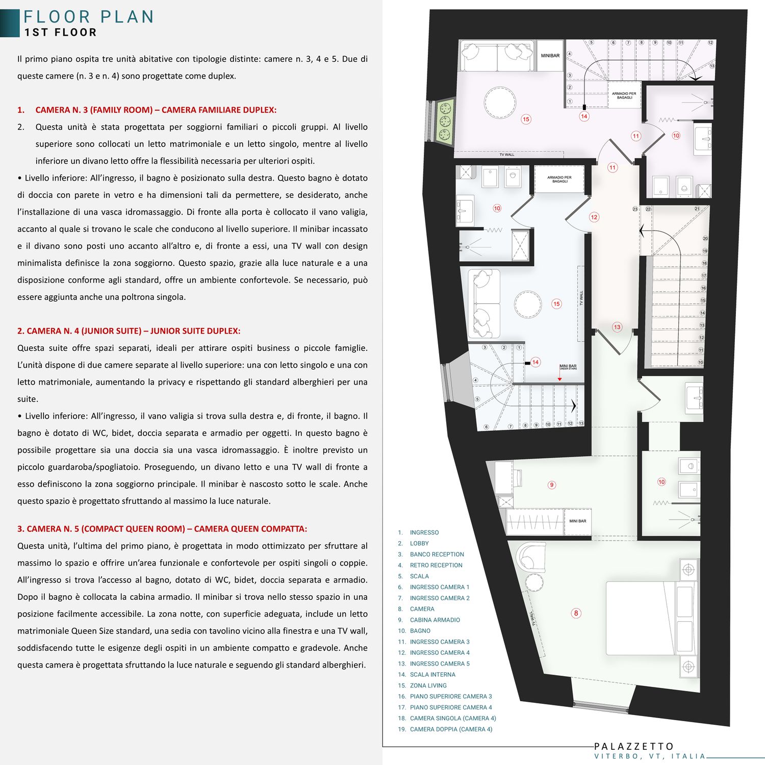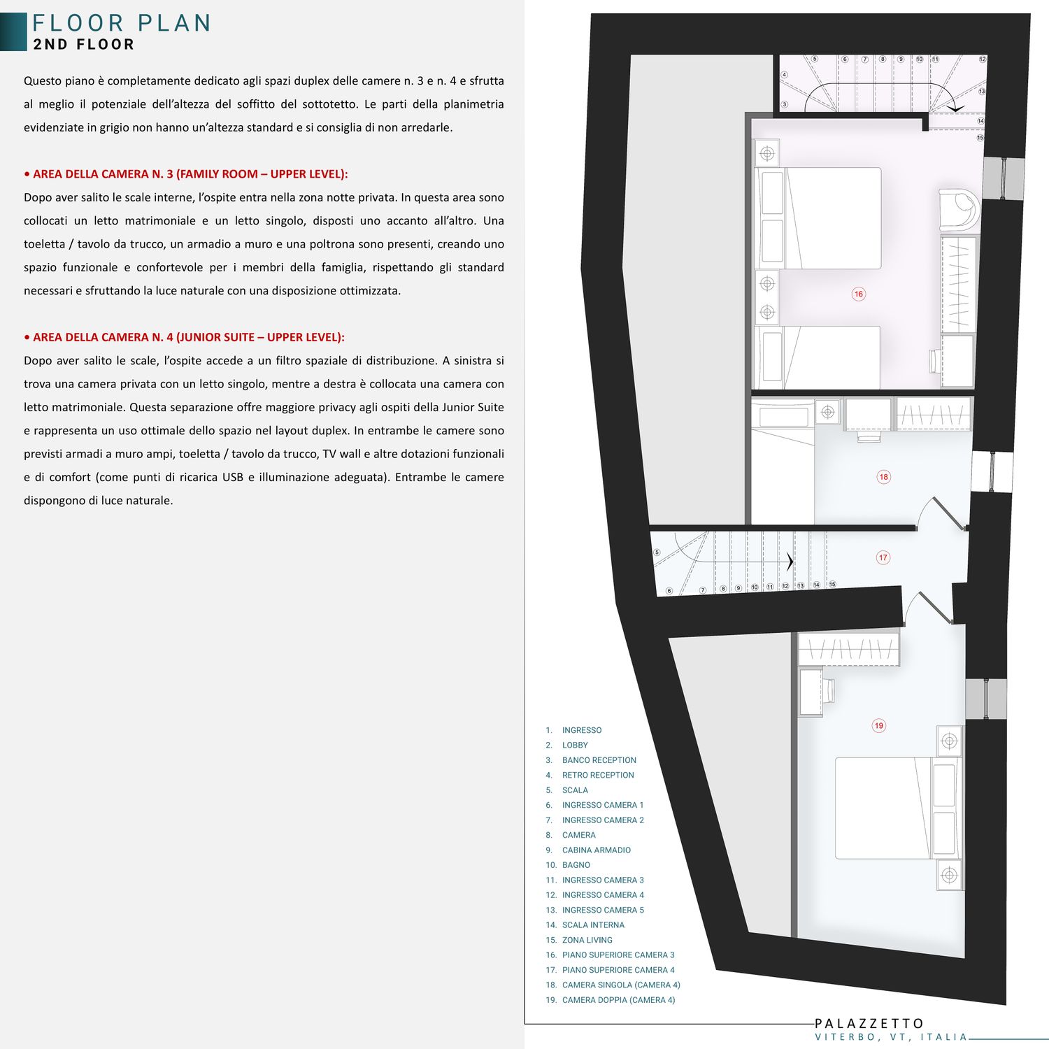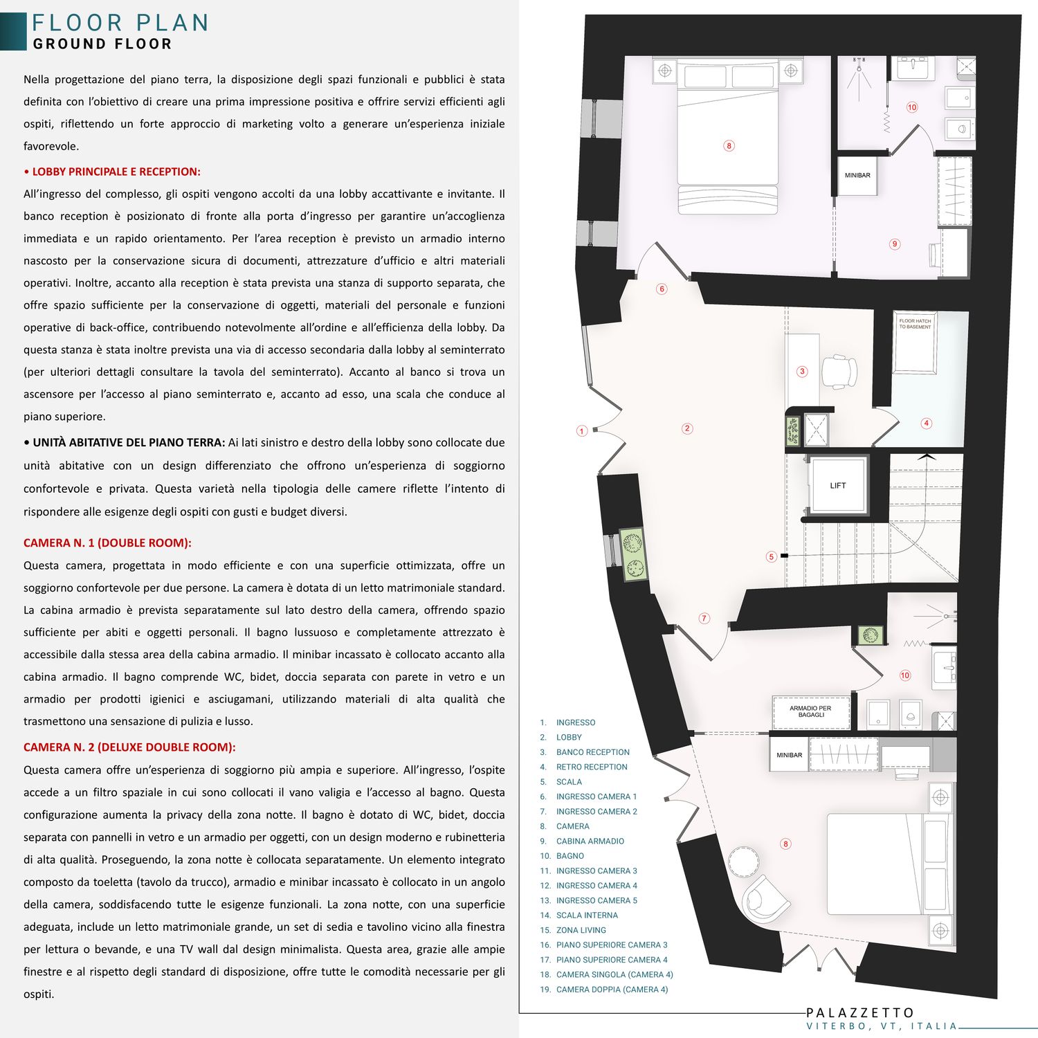 Tutti i dettagli relativi a ciascuna area — incluse lobby, camere, spazi di servizio e percorsi di distribuzione — sono illustrati nelle tavole di progetto (sezione FLOORPLAN) in modo preciso e completo.
