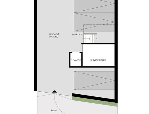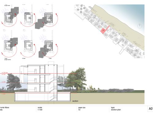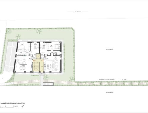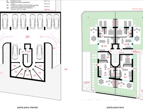ENG: Demolition of existing building, with reconstruction of a residential building, consisting of 4 two-room units per floor on 3 floors (the top floor is the attic) and the basement used as a garage. The 4 two-room apartments should be designed to be easily marged to create only 2 units per floor. The 2 units on the floor must contain 2 bedrooms (1 double and 1 single bedroom), 2 bathrooms, a living room and a kitchen.