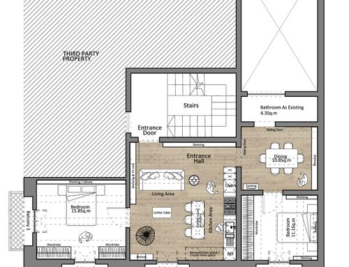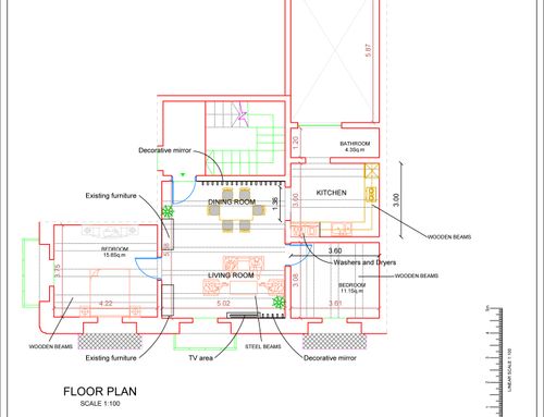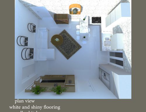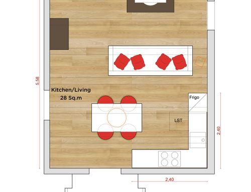 I need to renovate the living-dining area of my holiday house. Mainly, I’d like to reduce the existing kitchen area and to give the space a fresh and simple look.