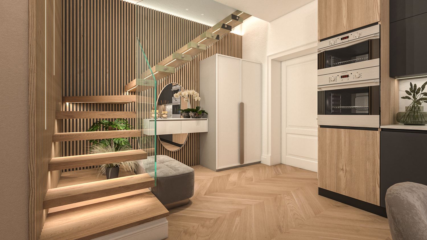 Zona Giorno (Appartamento 1): Focus sulla scala leggera e l'open space conviviale.