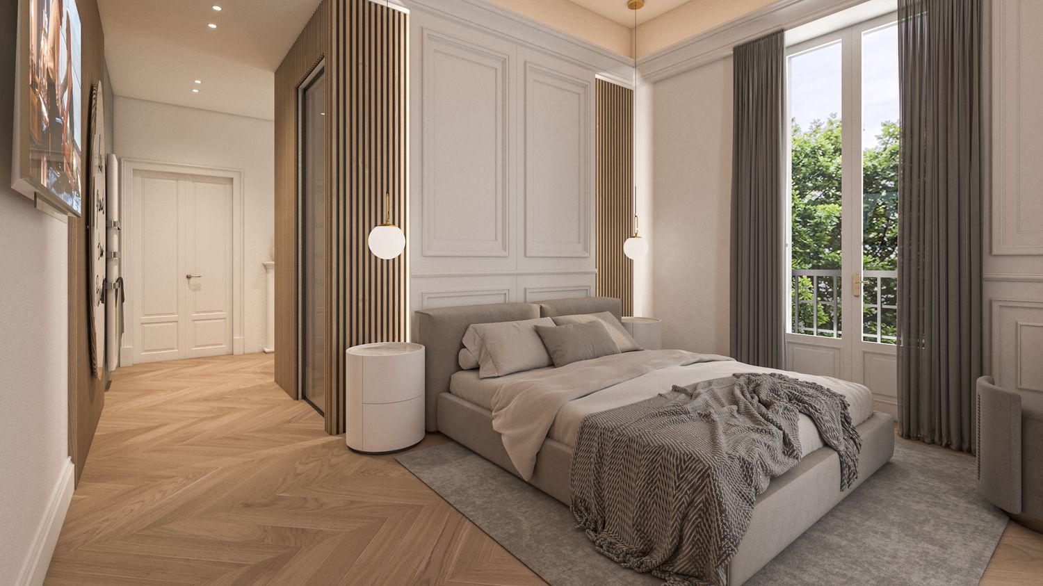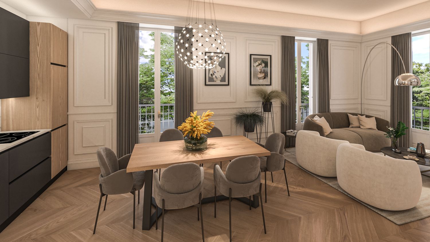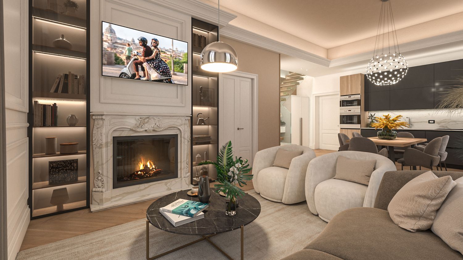 Per illustrare lo stile che fonde il classico Liberty (cornici, camini, parquet a spina) con il design contemporaneo, abbiamo allegato due viste fotorealistiche chiave: