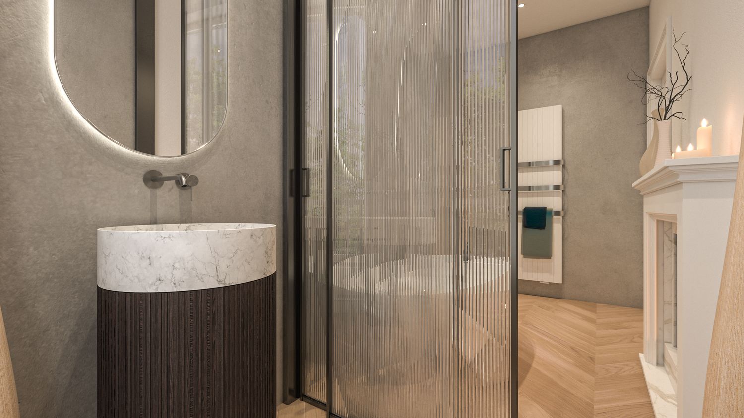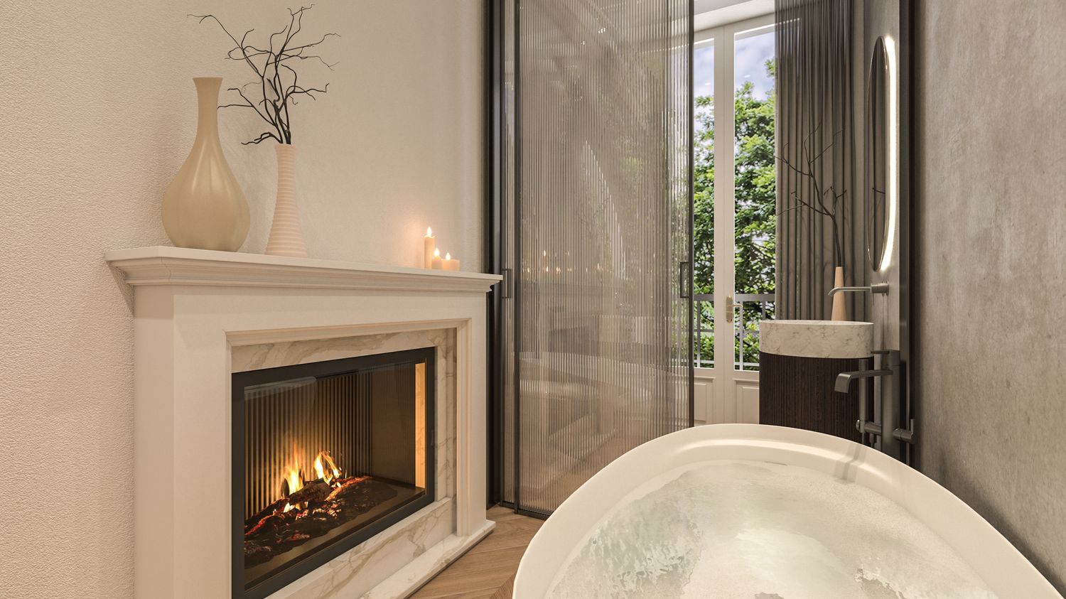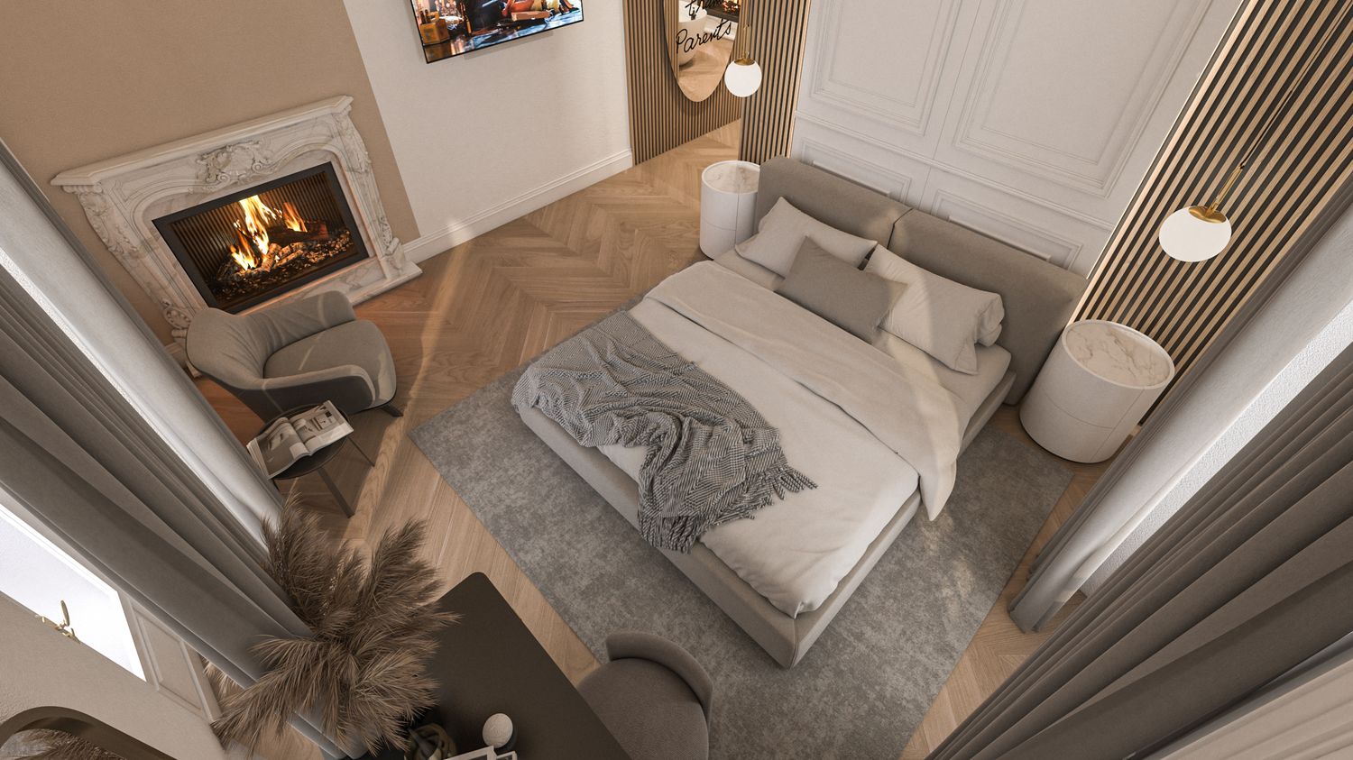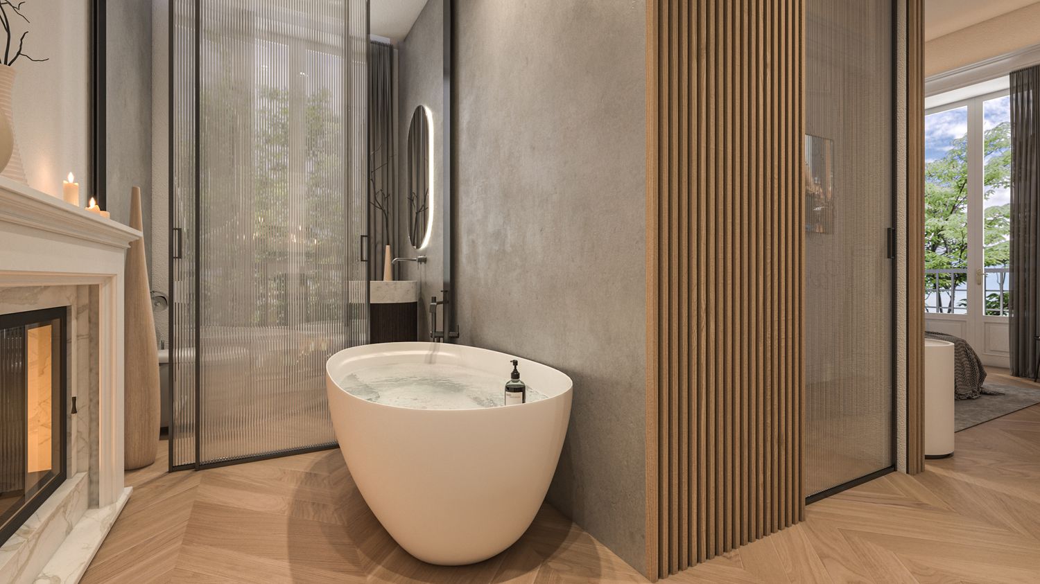 Camera Padronale (Appartamento 2): Focus sull'atmosfera intima creata dai camini in camera/vasca da bagno e dall'uso della boiserie classica accostata a listelli in legno contemporaneo.