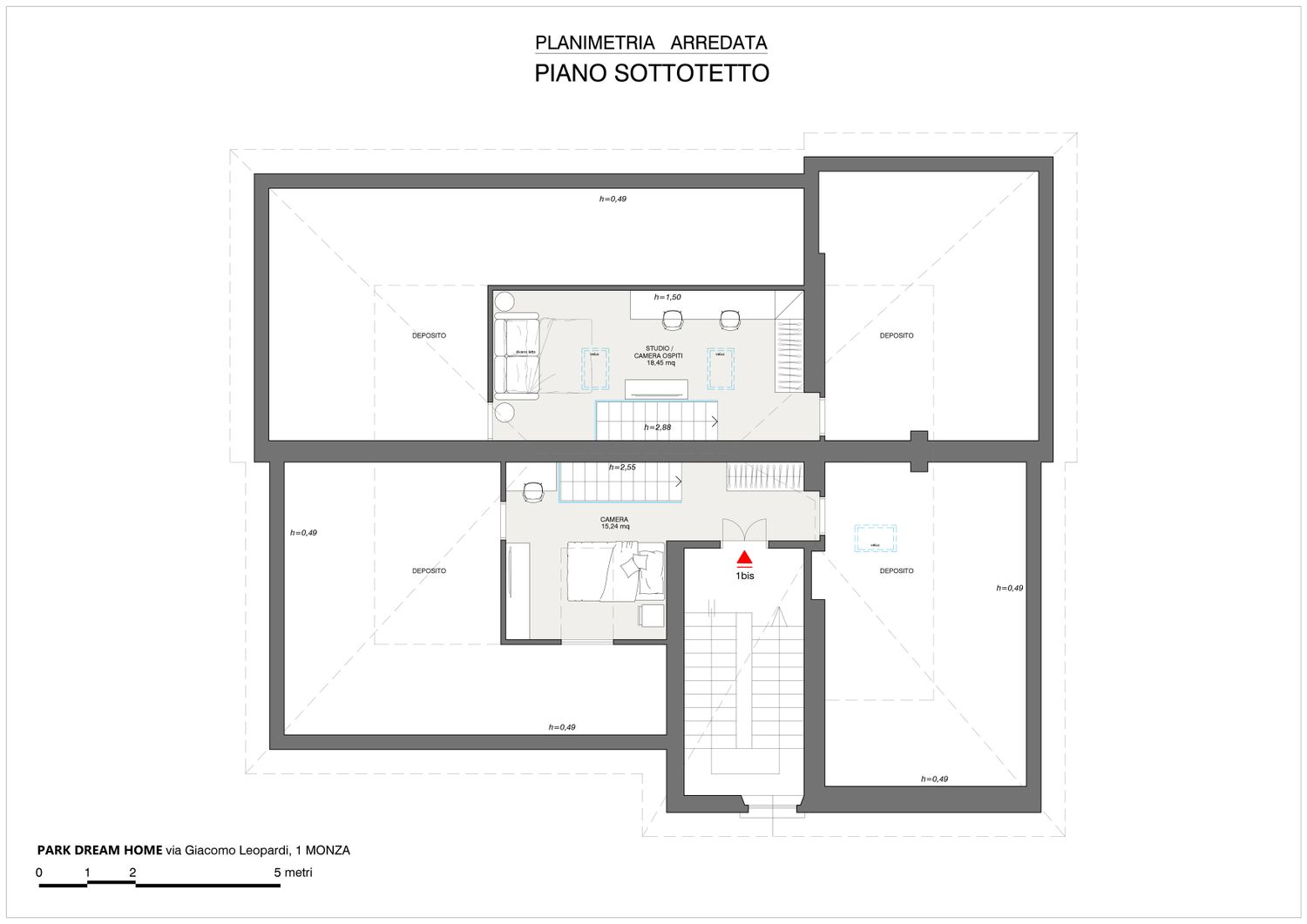 Abbiamo trasformato l'ingresso angusto in un grande Open Space luminoso, unendo la vecchia cucina alla Camera 01. Questo crea una zona giorno di rappresentanza con doppio affaccio. La zona notte padronale resta privata, mentre il sottotetto ospita la seconda camera.