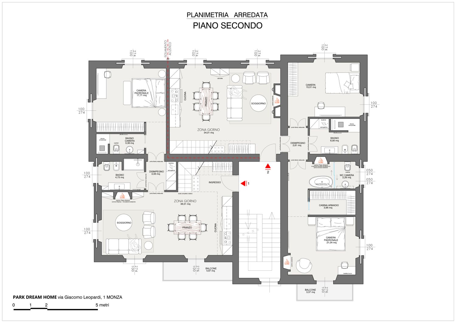 Questa unità acquisisce l'ex salone centrale, guadagnando una zona living spettacolare. Nella zona notte si ricava una vera Master Suite con doppio camino, cabina armadio e bagno privato.