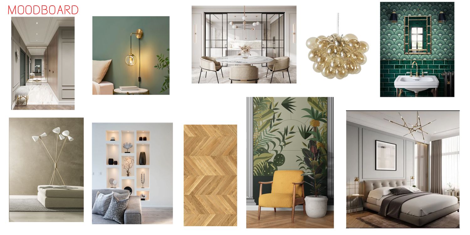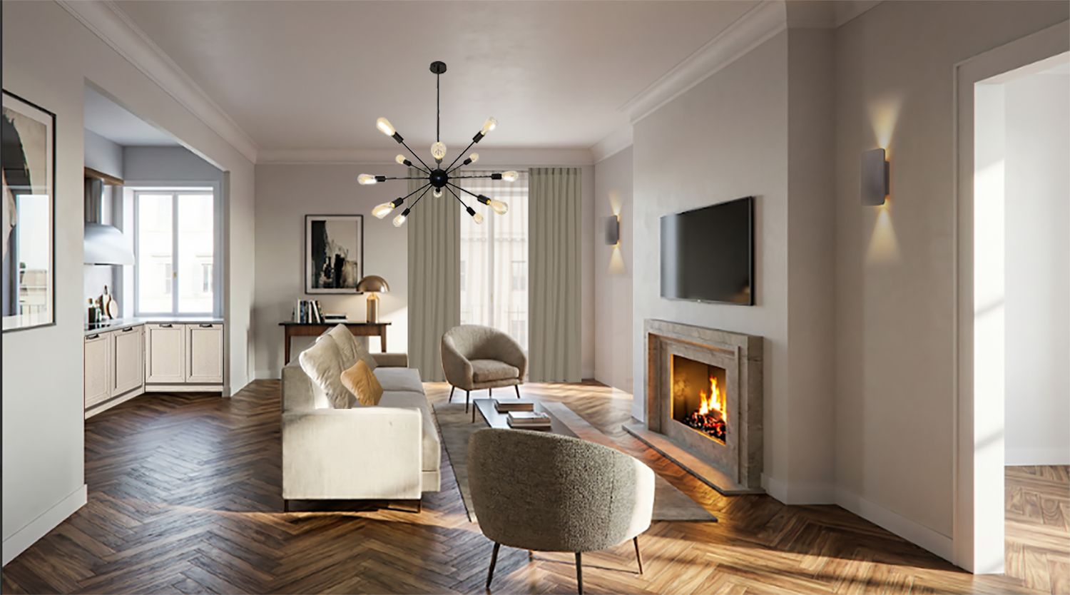 To better highlight the potential offered by the new internal layout, two solutions are proposed, similar in terms of their functions, but with different layouts. Due to the reduced height of the attic, both feature an internal staircase leading to the attic floor, which houses a study and a TV room or guest bedroom. Upon entering, an open-plan space was created, with a possible separable kitchen, creating a bright and welcoming environment with all the necessary touches, such as a pantry and a wardrobe in the entrance hall. Both solutions feature two bathrooms, one of which can be used as a laundry room, and two bedrooms, both generously sized, one with a double bed and the other with a single or double bed. As can be seen, the colors are warm and welcoming, with a base of neutral tones and contrasting elements. There is also space for many wall-mounted wardrobes so as to organise the space without waste. Particular attention was paid to the materials, particularly the herringbone parquet flooring in the living areas.