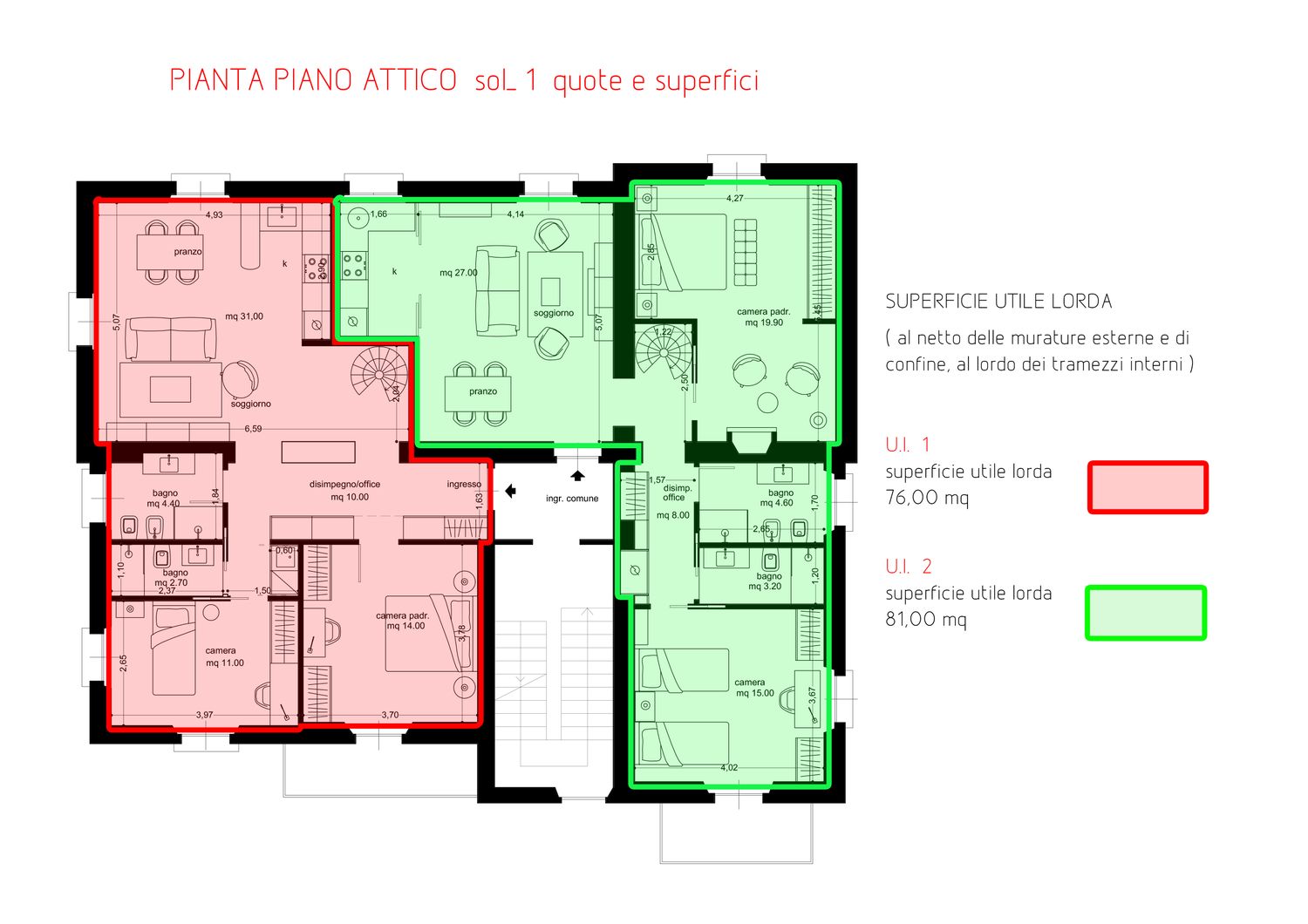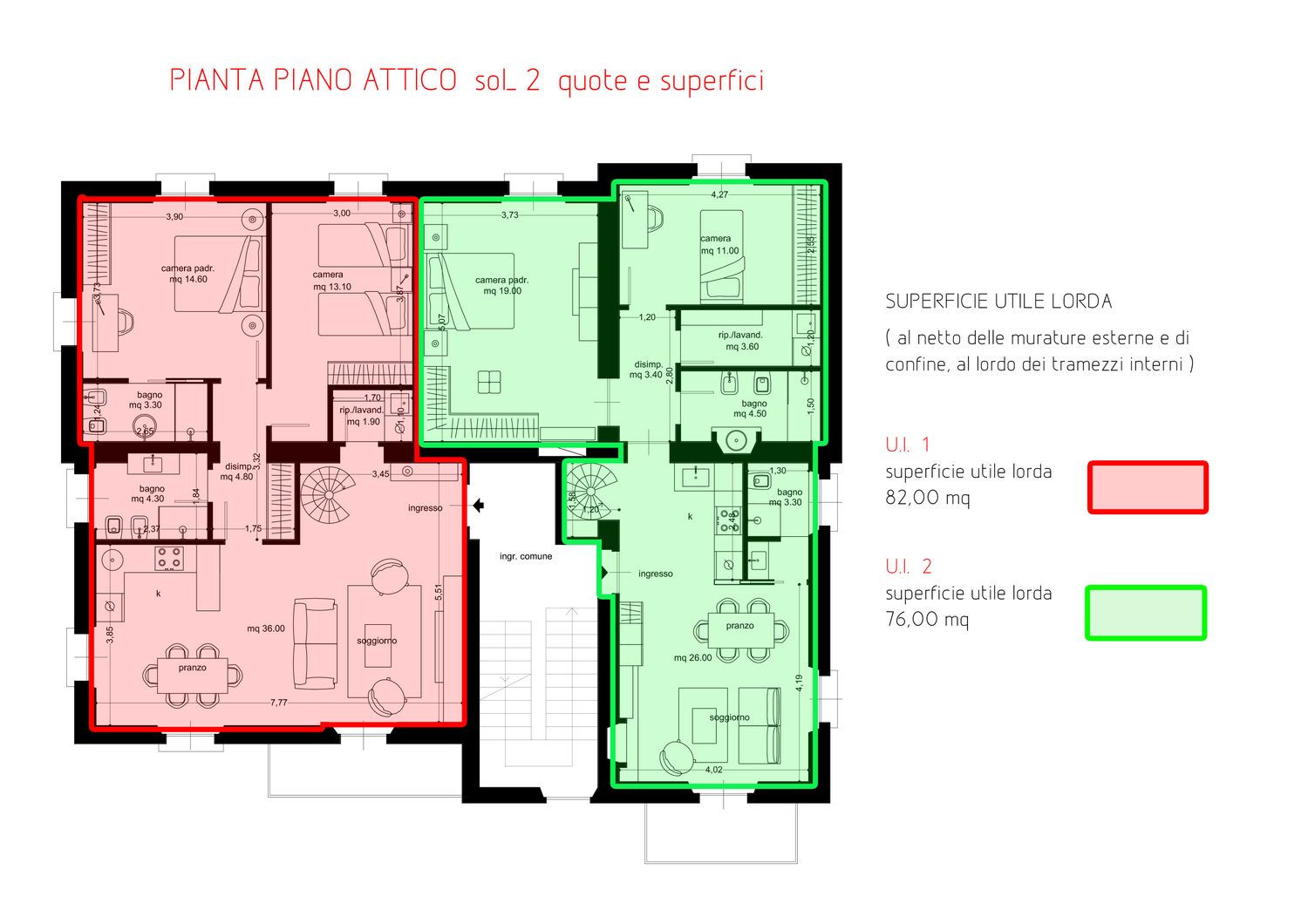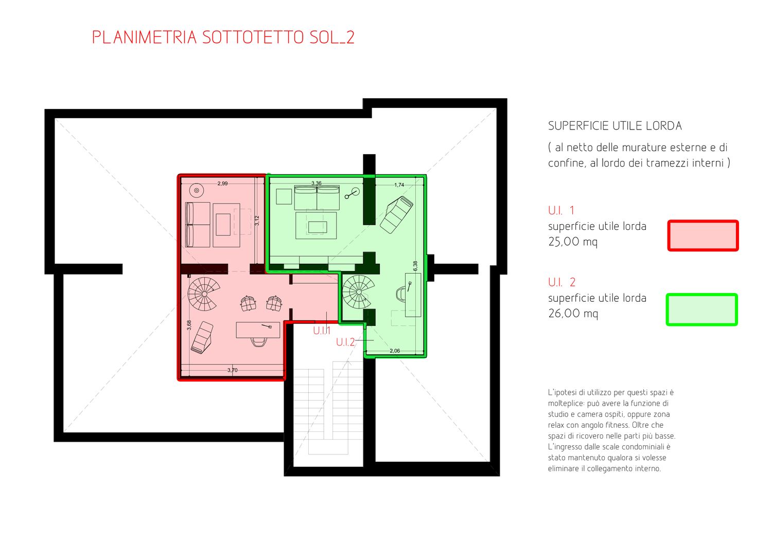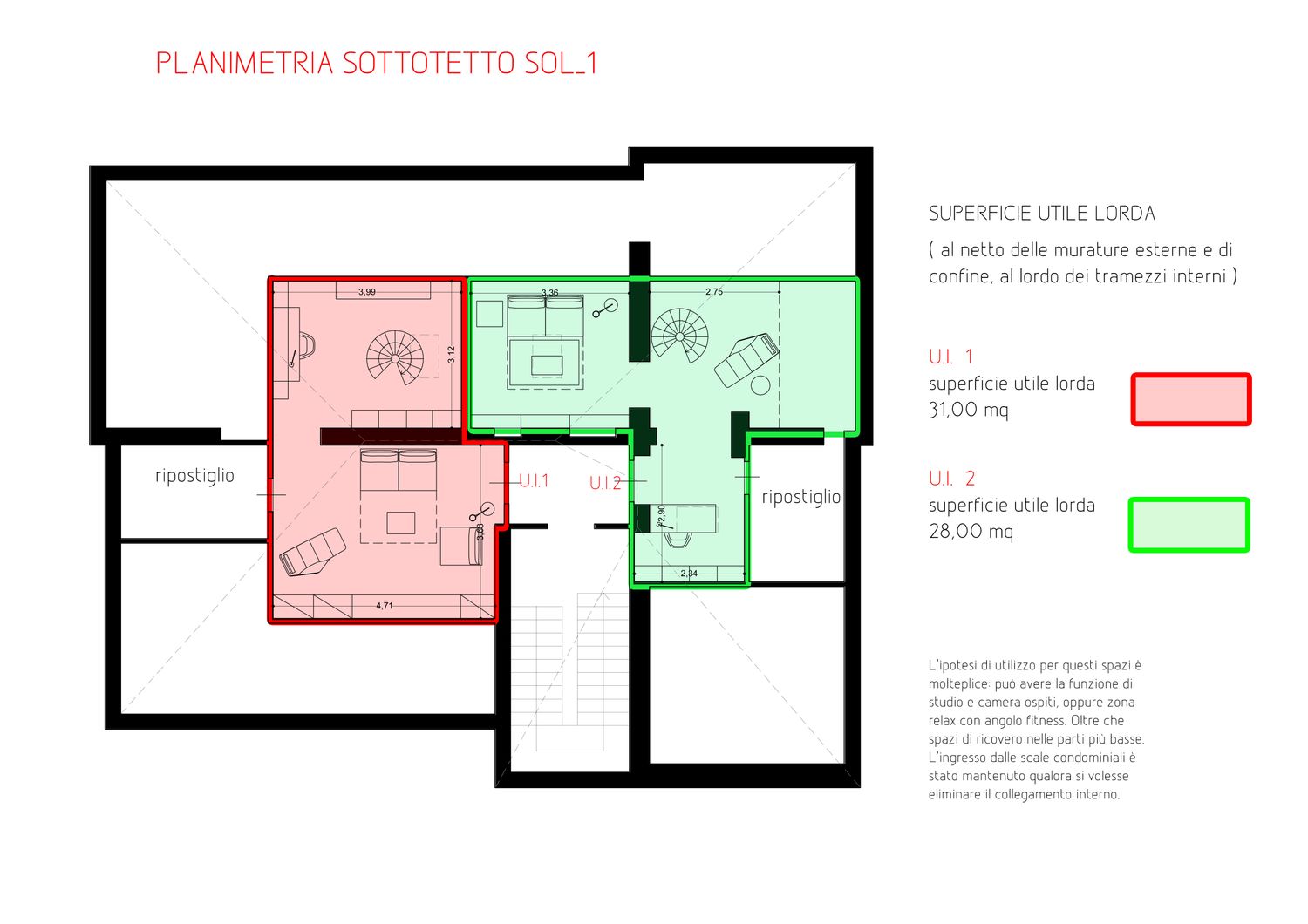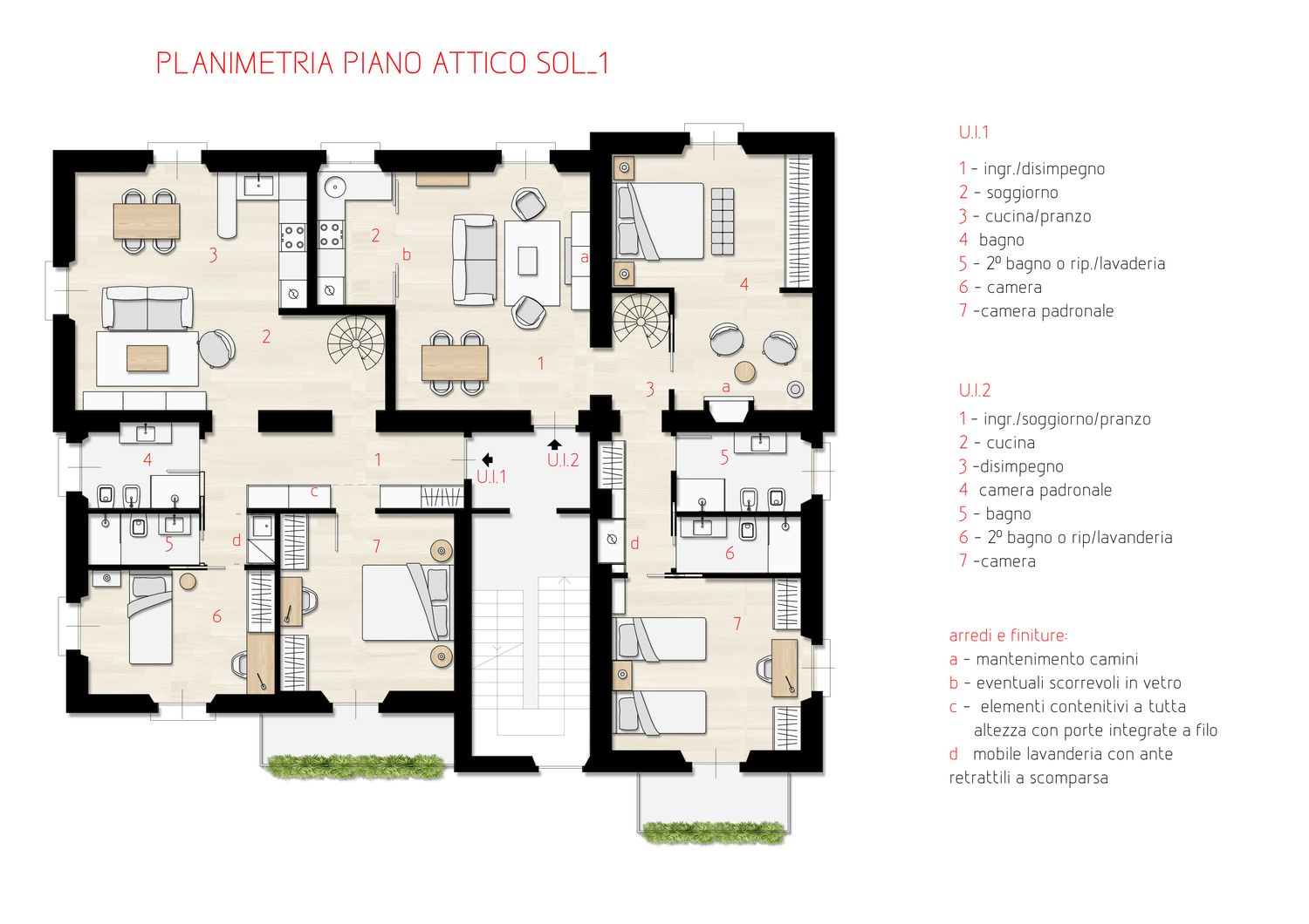 Per meglio evidenziare le potenzialità che può offrire la nuova distribuzione interna vengono proposte due soluzioni simili per le funzioni ospitate, ma con accorgimenti differenti per quanto riguarda la collocazione degli ambienti. Entrambe le soluzioni, a causa della ridotta altezza del piano sottotetto, ospitano una scala d’arredo interna che congiunge al piano mansarda dove trova spazio uno studio e una saletta TV o camera ospiti. Entrando si è cercato di realizzare un ambiente open e con eventuale cucina separabile in modo da risultare un ambiente luminoso e ben accogliente con tutti quegli accorgimenti ricercati come un ripostiglio dispensa ed un armadio porta abiti all’ingresso. In entrambe le soluzioni gli appartamenti sono poi dotati di due bagni di cui uno con possibilità di essere utilizzato come lavanderia oltra alle due camere entrambe di buona metratura e proposte una con letto matrimoniale ed una con letto singolo o doppio letto. Trovano spazio inoltre molte armadiature a filo parete in modo da organizzare lo spazio senza sprechi. Come visibile da rendere i colori sono caldi ed accogliente con base dei toni neutri ed elementi a contrasto; particolare attenzione è stata rivolta ai materiale ed in particolare la pavimentazione delle zone giorno presentata in parquet con la posa a spina.