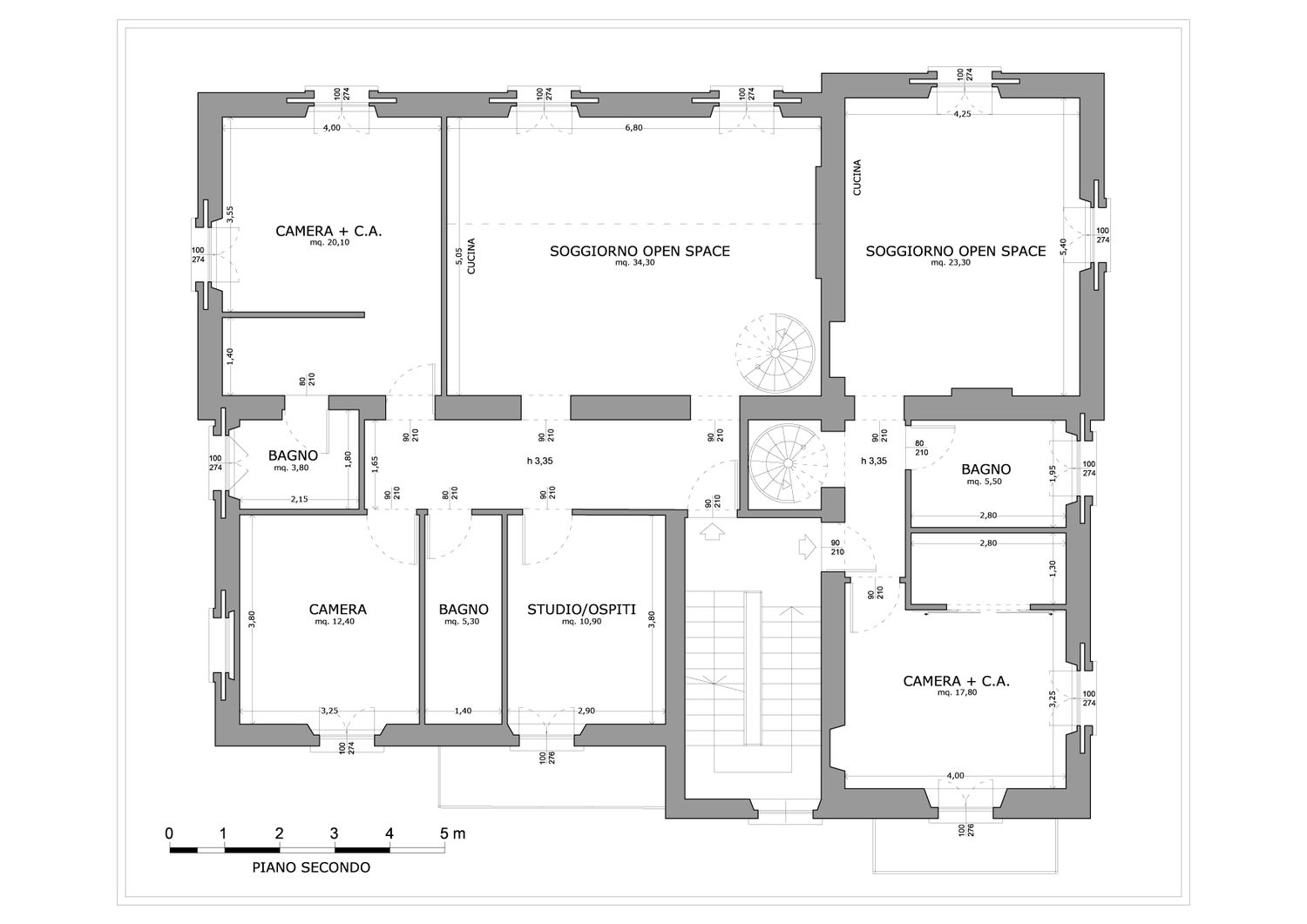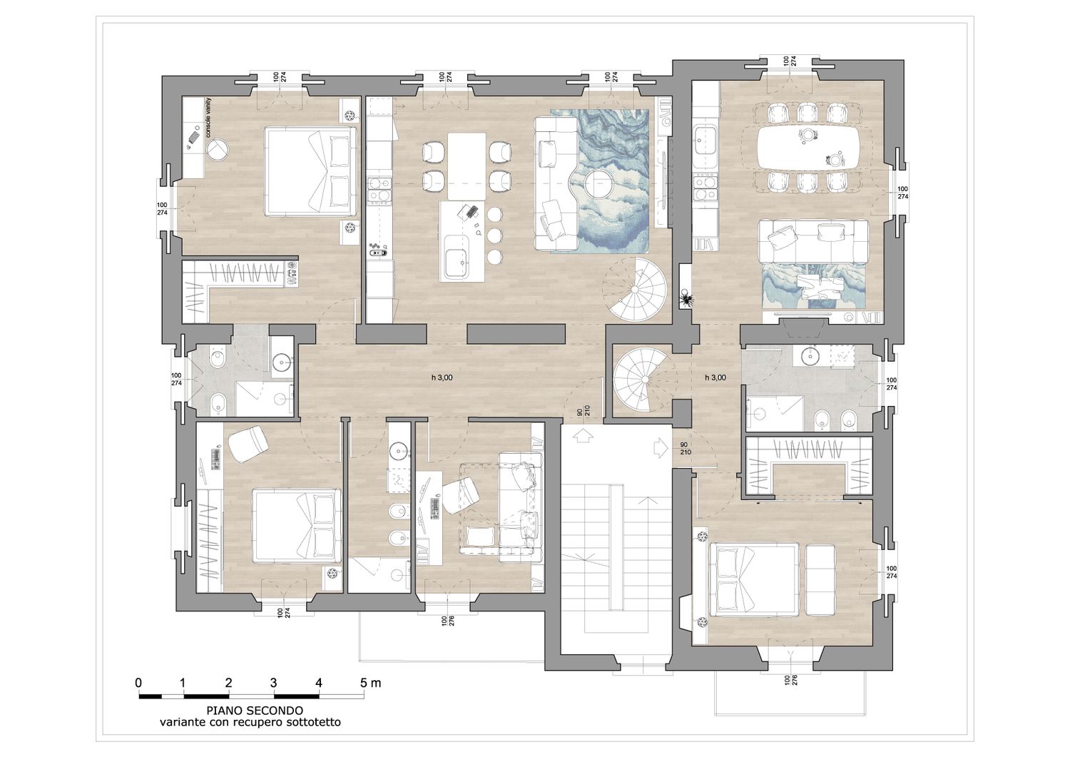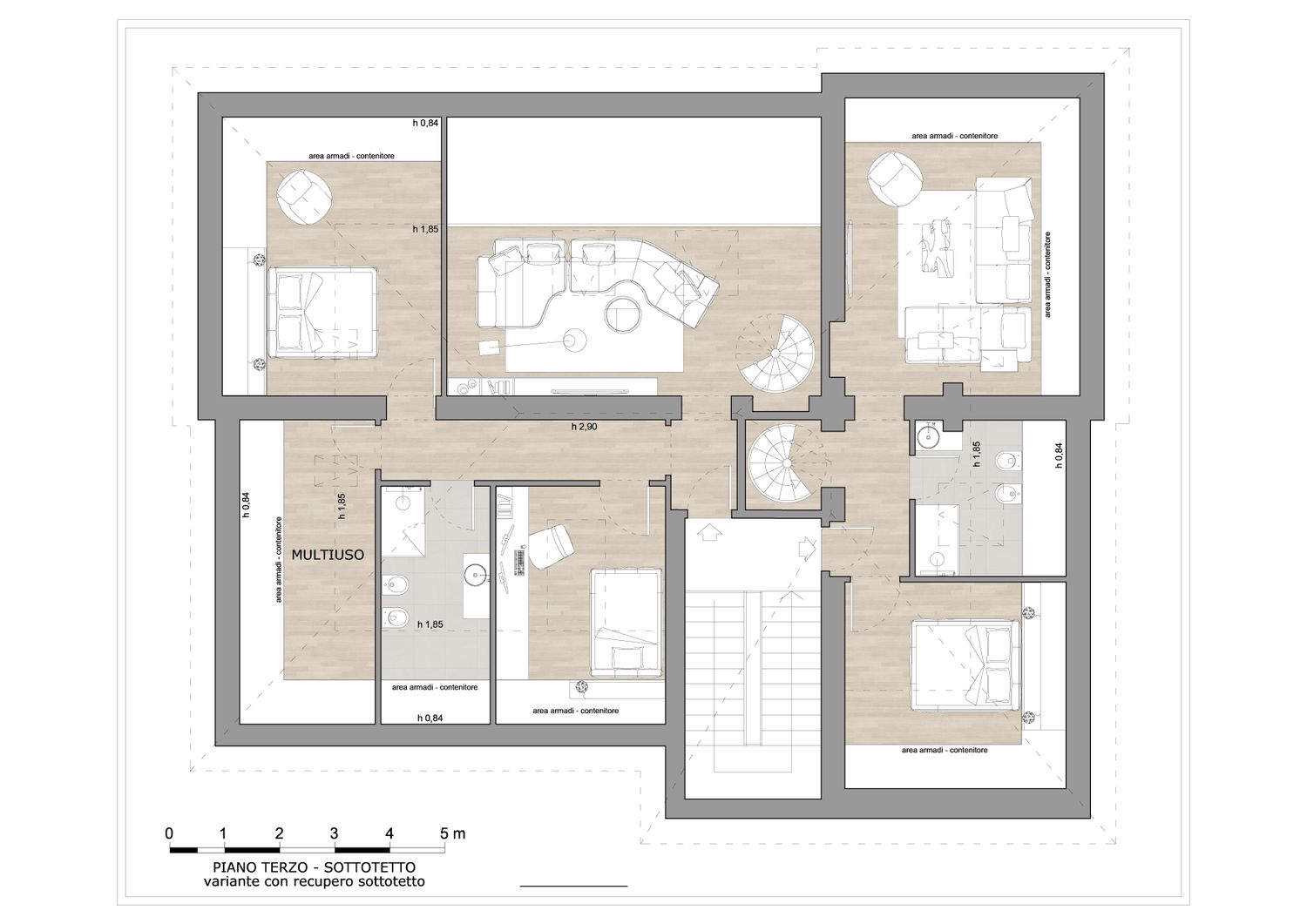 Doppia proposta per la ristrutturazione dei piani secondo e terzo della villa, unita al frazionamento richiesto dell'unità abitativa. Abbiamo ipotizzato sia una variante A in cui le opere edili rimangono più limitate, creando collegamenti verticali interni coi locali del sottotetto (che rimangono in buona parte destinabili a solo contenitore, in quanto non dotati delle altezze sufficienti per garantirne l'abitabilità a norma), ed una variante B in cui, sfruttando le notevoli altezze interne del secondo piano, si opera abbassando il solaio fra i due livelli e consentendo un recupero del sottotetto, tale da alzare la sua altezza media interna e renderlo almeno parzialmente abitabile. Nell'ipotesi B, le opere saranno più importanti e onerose, ma garantiranno un notevole aumento di superficie per entrambe le unità abitative, generando un maggiore appetibilità dal punto di vista commerciale.