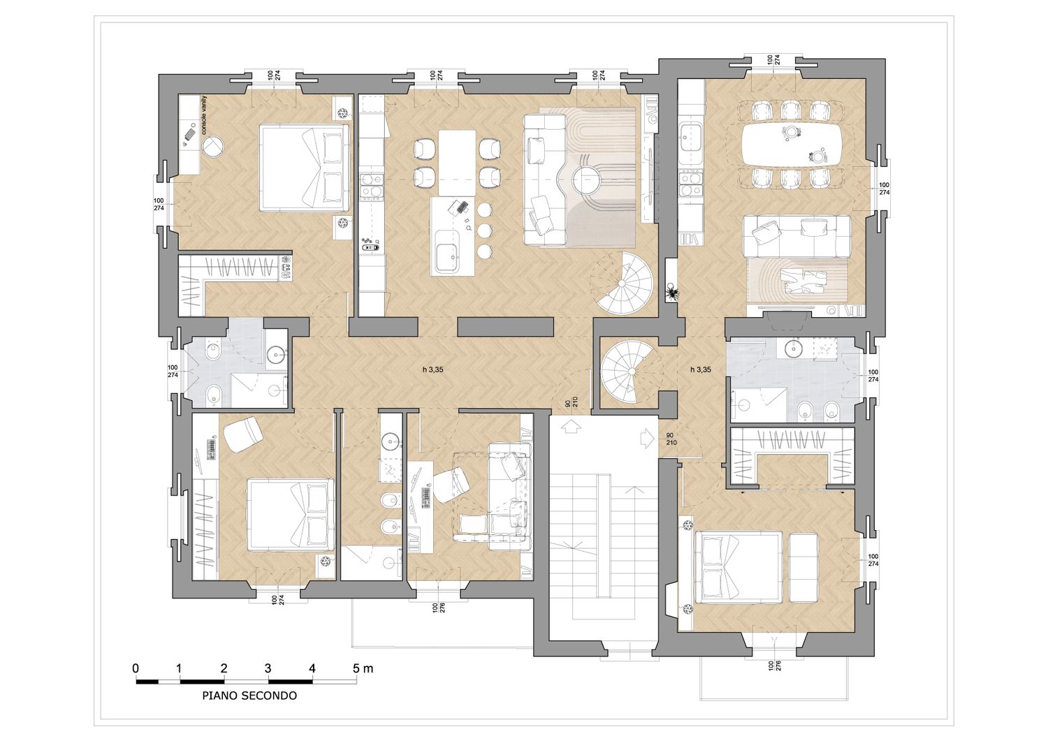 ⦁ una unità abitativa con: ingresso in ampio disimpegno, salone open space con cucina ad isola e parete attrezzata con camino, camera master con cabina armadio e bagno en suite, seconda camera, studio e secondo bagno; accesso interno a piano mansardato con area soppalcata, in cui è realizzabile un secondo spazio lounge/salotto, due camere, un bagno e uno spazio multiuso.