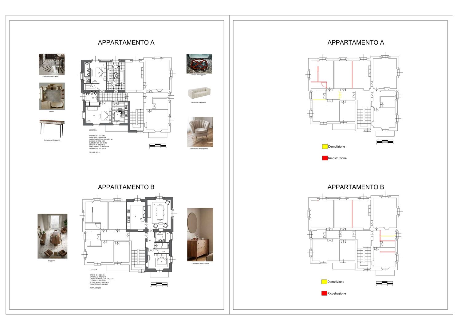 Appartamento A: il progetto è rispettoso della storia e delle caratteristiche morfologiche dell'edificio. Ogni cambiamento proposto è compatibile con il periodo storico e i canoni abitativi odierni.Si sceglie di mantenere la pavimentazione originale. Tuttavia un miglioramento estetico è ancora possibile, non è raro in interventi simili integrarlo con materiali moderni, si veda il nuovo pavimento proposto per la cucina.Le finiture faranno la differenza di risultato mentre il restauro degli infissi originali è possibile ed auspicabile.L'intervento migliora la distribuzione con un nuovo bagno e un nuovo ambiente.