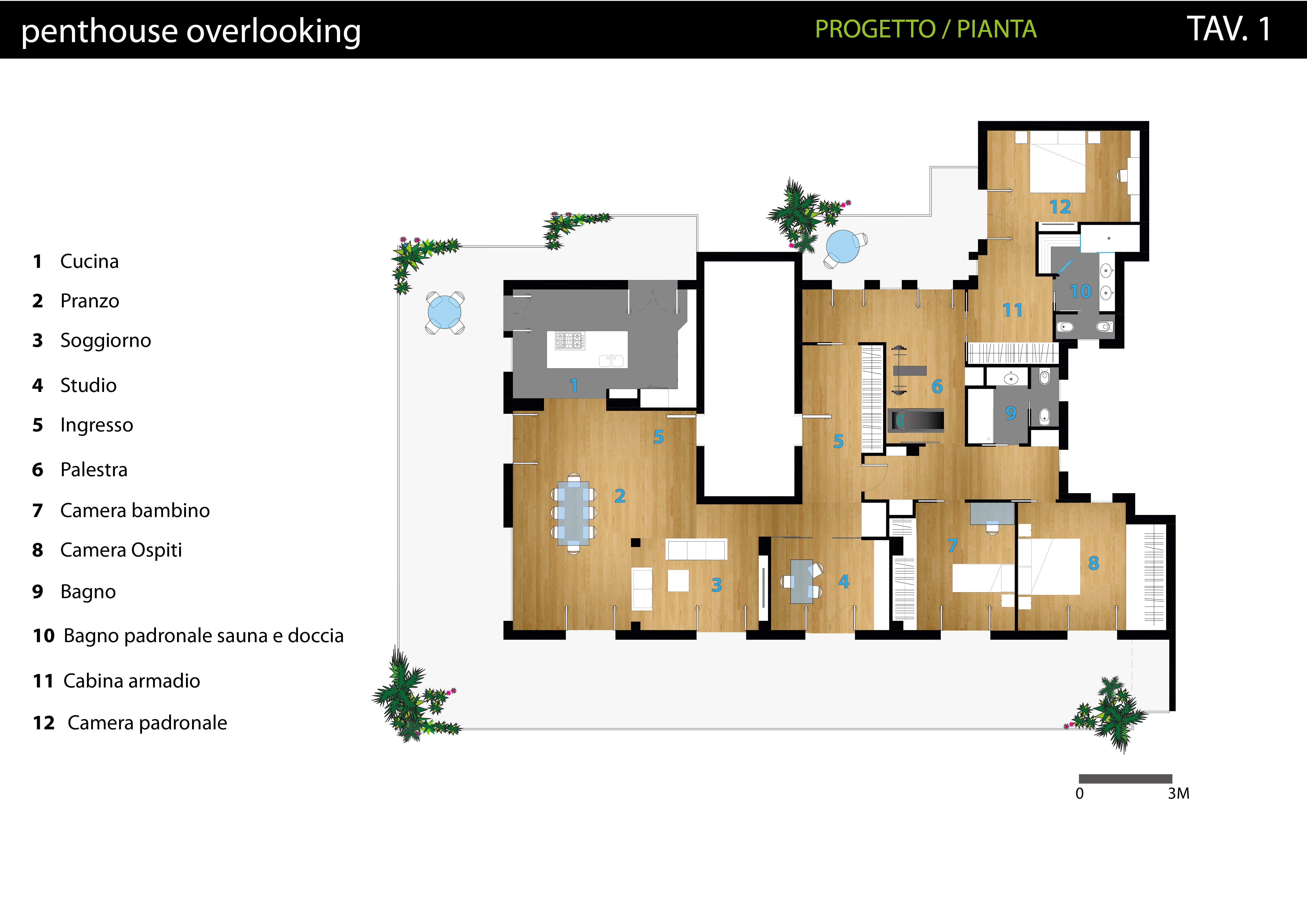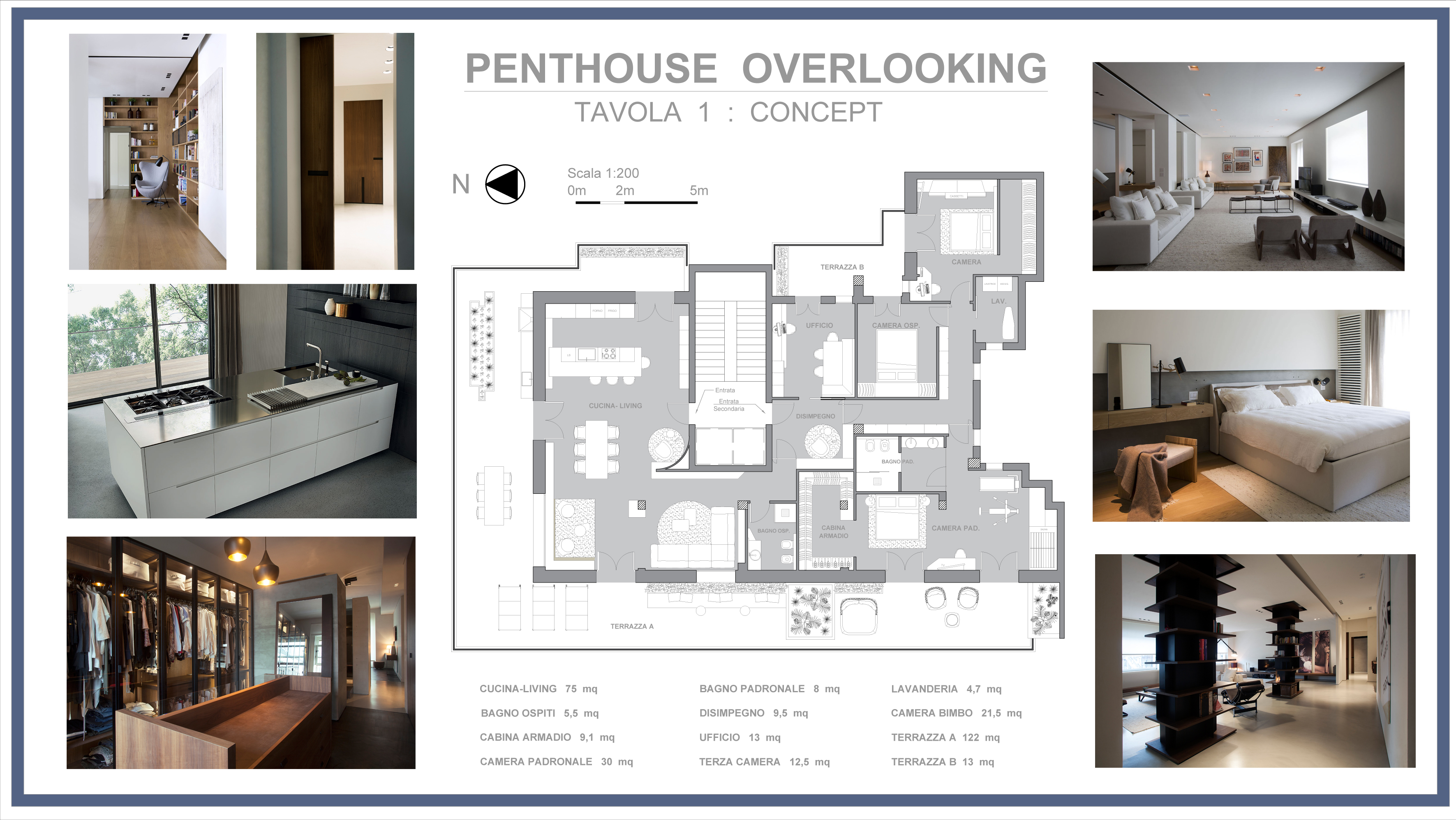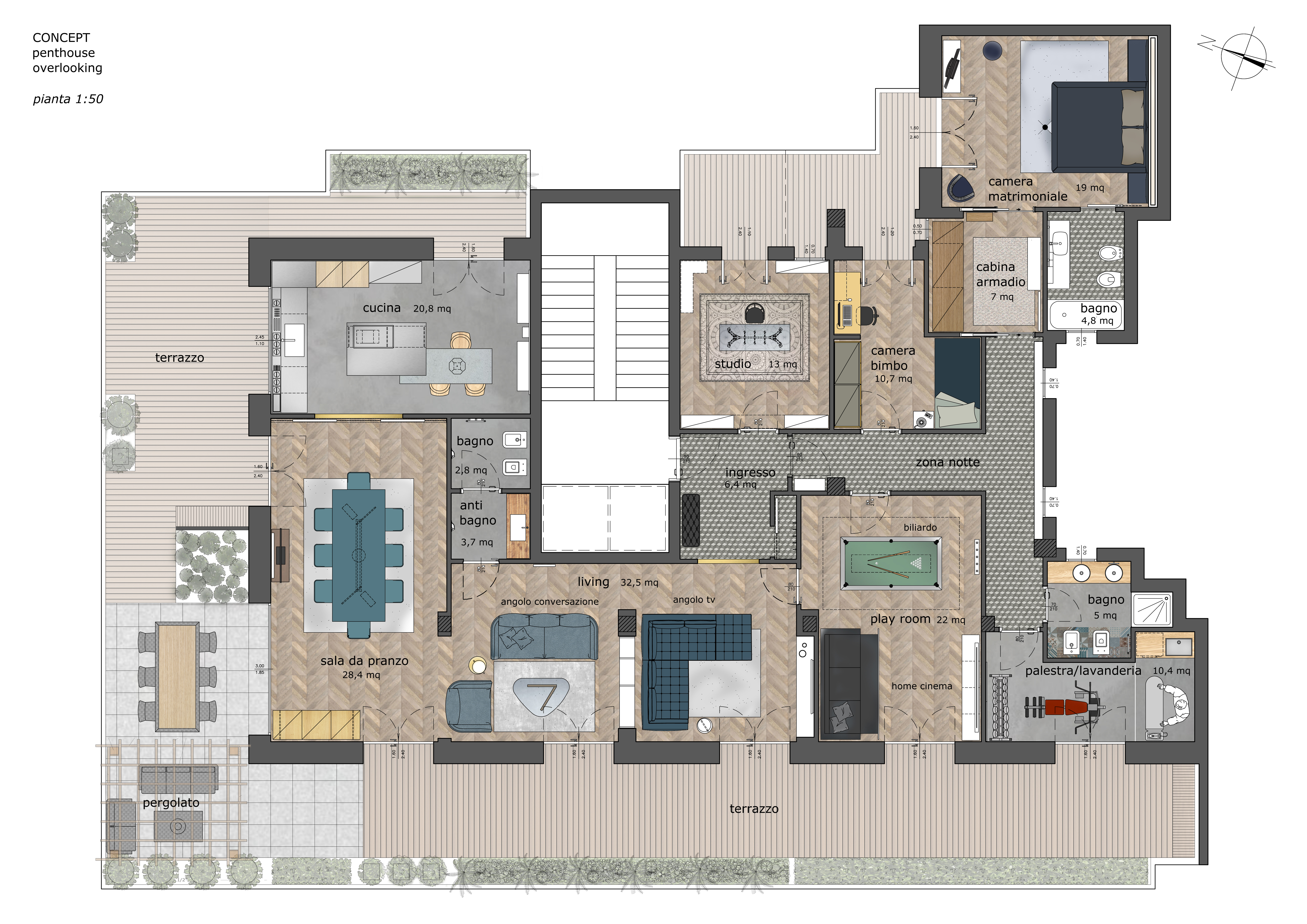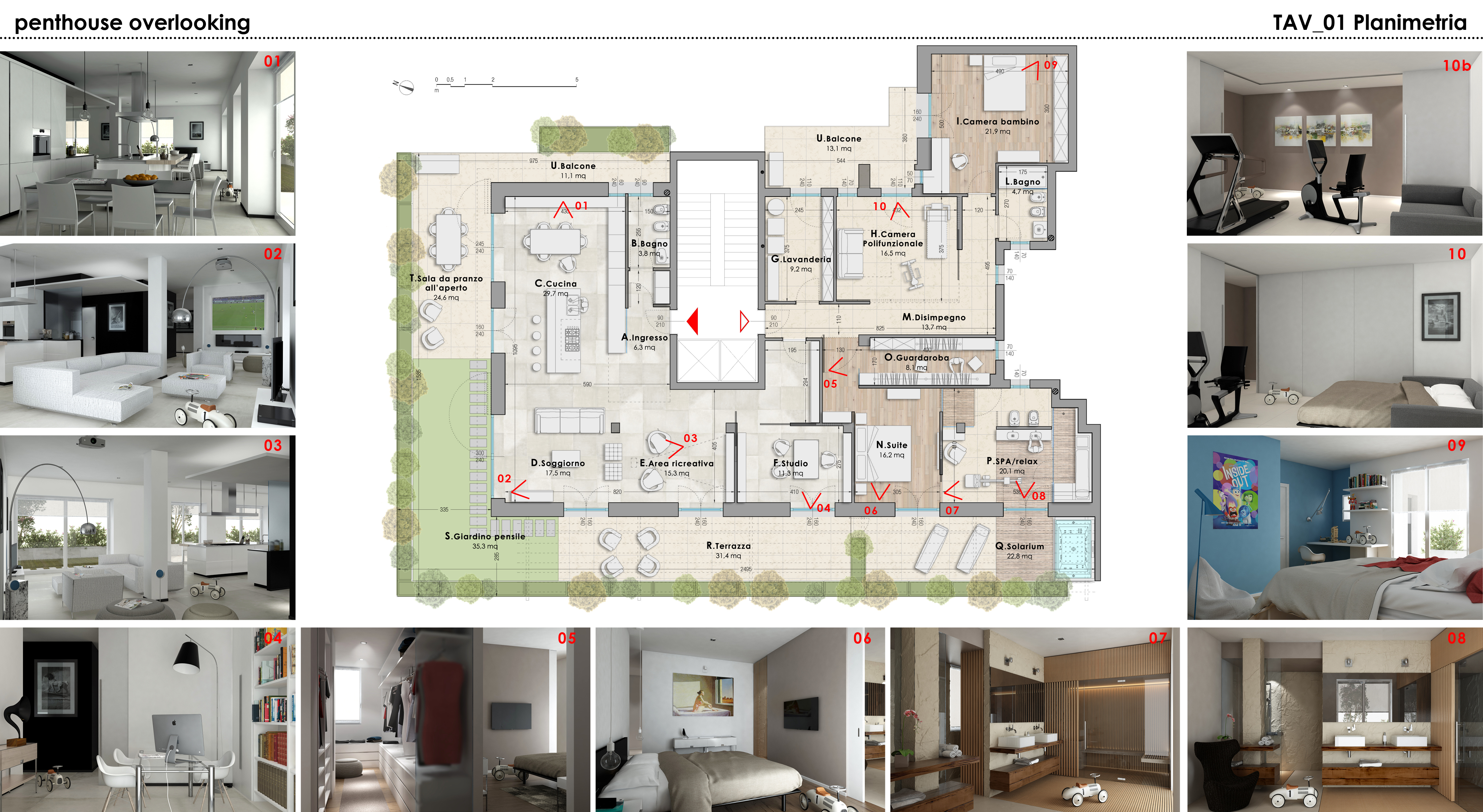 Gli altri ambienti sono: studio disimpegnato dalla zona notte, camera padronale con grande cabina armadio e bagno, una camere da letto per bambino, una camera palestra-ospiti, lavanderia-stireria, piccolo bagno zona living.